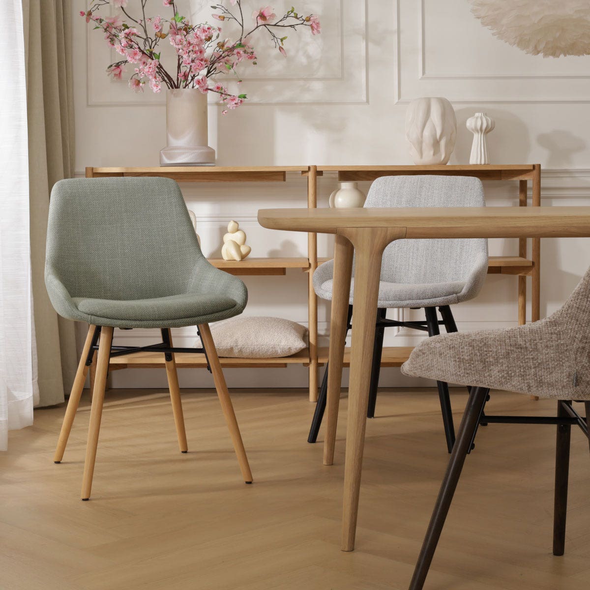 De Nena-Isa eetkamerstoel saliegroen - houten onderstel is onderdeel van een mix en match collectie. Dit betekent dat zowel het onderstel als de zitting van deze stoel in diverse andere combinaties verkrijgbaar zijn. Zo is de stoel met een houten onderstel verkrijgbaar in de kleuren bouclé beige, bouclé taupe, beige, warm grijs, saliegroen, bruin en beige gemêleerd. Met een walnoot houten onderstel kun je kiezen uit bouclé beige, bouclé taupe, beige, warm grijs, saliegroen, bruin en beige gemêleerd. De variant met een zwart houten onderstel is beschikbaar in bouclé beige, bouclé taupe, beige, warm grijs, saliegroen, bruin en beige gemêleerd. Deze varianten bieden volop mogelijkheden om de perfecte eetkamerstoel samen te stellen die bij jouw interieur past.