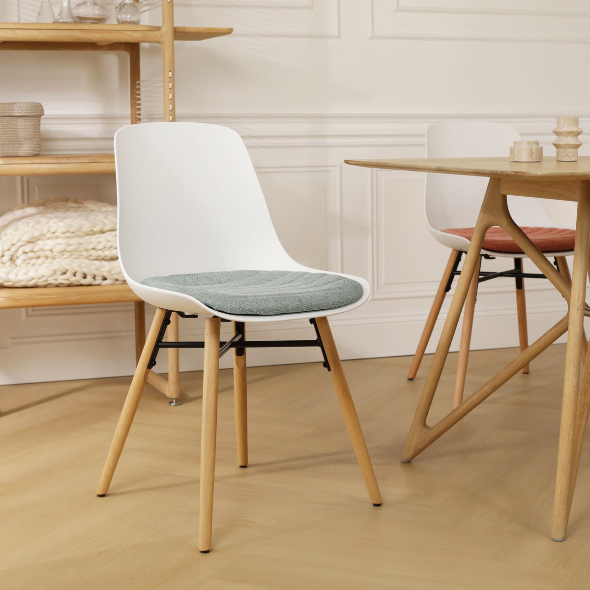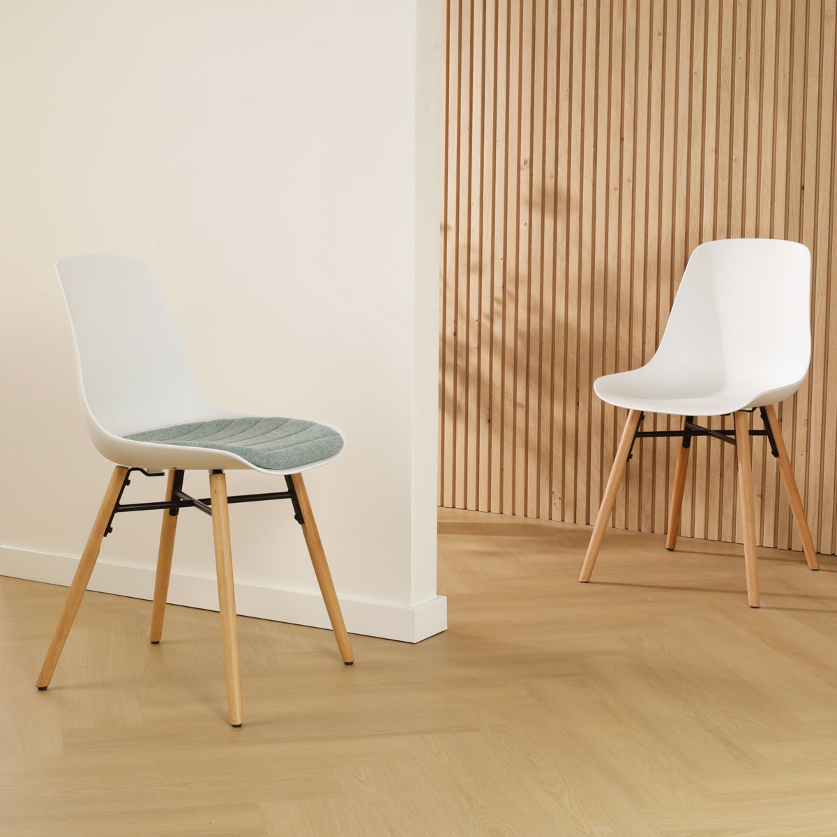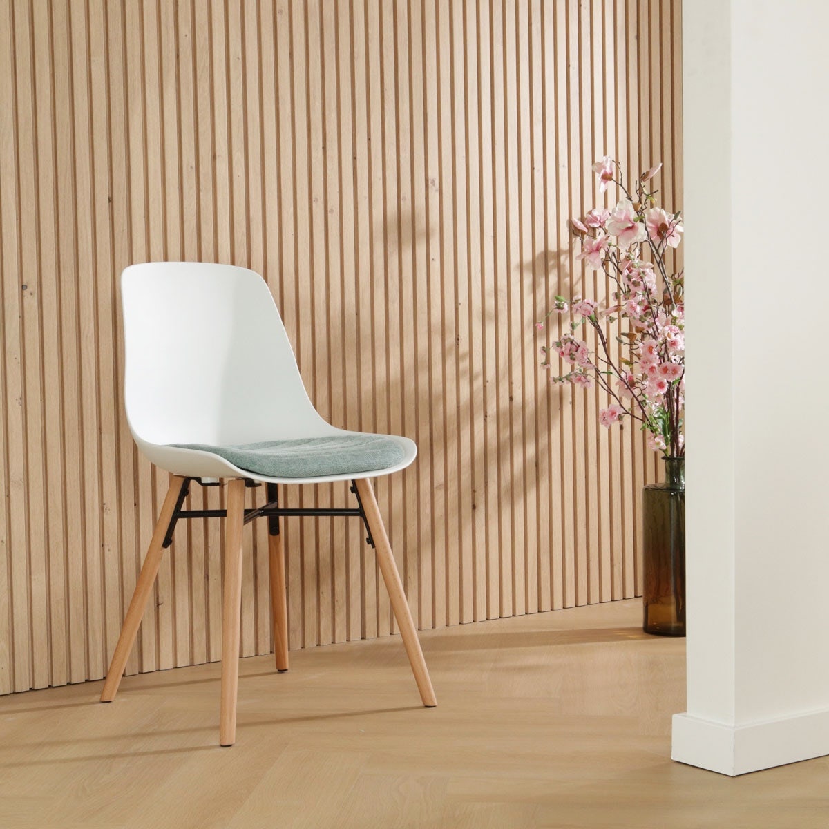 Deze eetkamerstoel combineert hout en kunststof op stijlvolle wijze in het tijdloze design. Het beukenhouten onderstel is voorzien van een zwarte metalen kruisverbinding tussen de poten en straalt moderniteit uit. De naturel houtkleur van de poten zorgt op zijn beurt voor een warme uitstraling van het geheel. De kunststof zitting geeft deze stoel een duurzaam en onderhoudsvriendelijk karakter, en is stijlvol vormgegeven met ronde vormen. Het vaste zitkussen is bekleed met zachte stof en voegt extra comfort toe aan je zitervaring tijdens lange maaltijden of gezellige avonden. De Nena-Liv eetkamerstoel maakt deel uit van de uitgebreide collectie Nolon eetkamerstoelen, waarbij zowel het onderstel als de zitting beschikbaar zijn in diverse combinaties. Voor extra zitcomfort kun je deze eetkamerstoel combineren met het Fem zitkussen van Nolon.