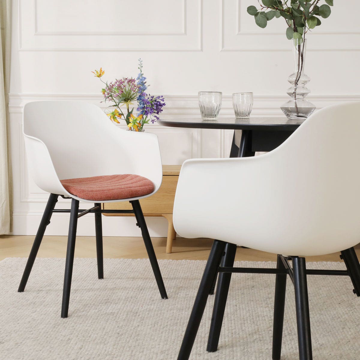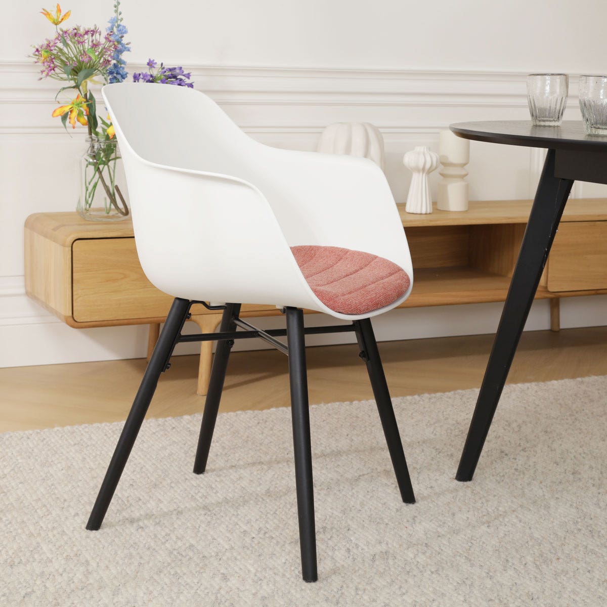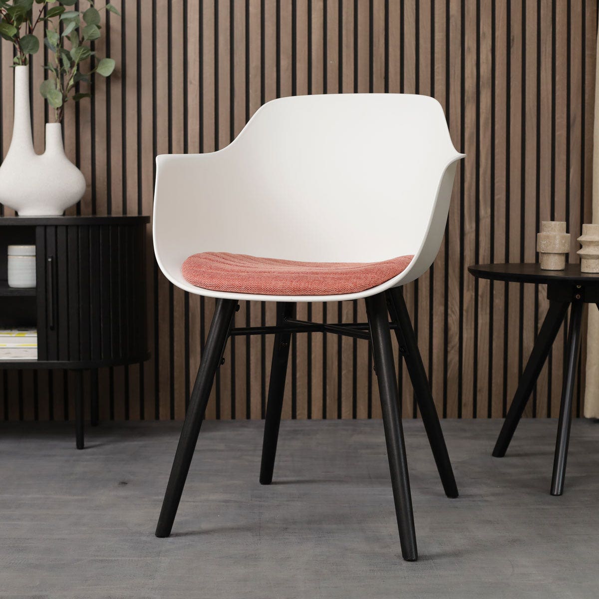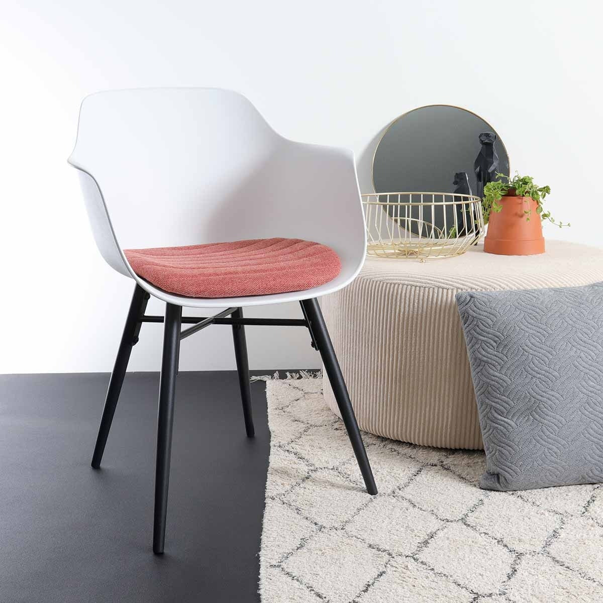 Een praktische en tegelijkertijd sfeervolle eetruimte creëer je met de Nena-Liz eetkamerstoel met kunststof zitting en armleuningen.