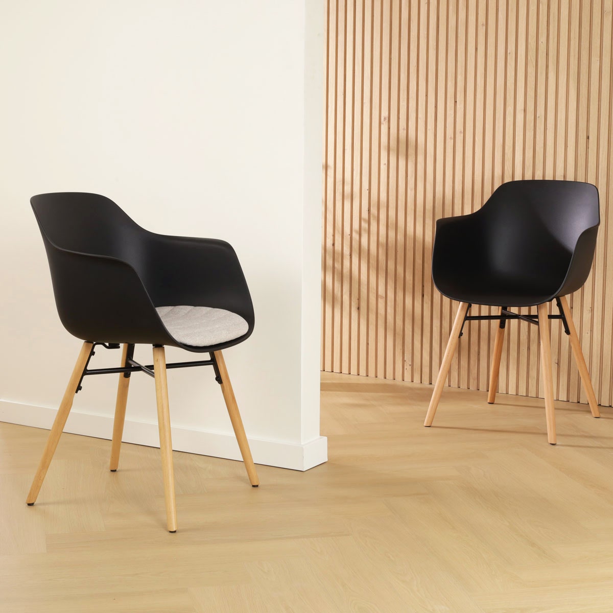 Een praktische en tegelijkertijd sfeervolle eetruimte creëer je met de Nena-Liz eetkamerstoel met kunststof zitting en armleuningen.