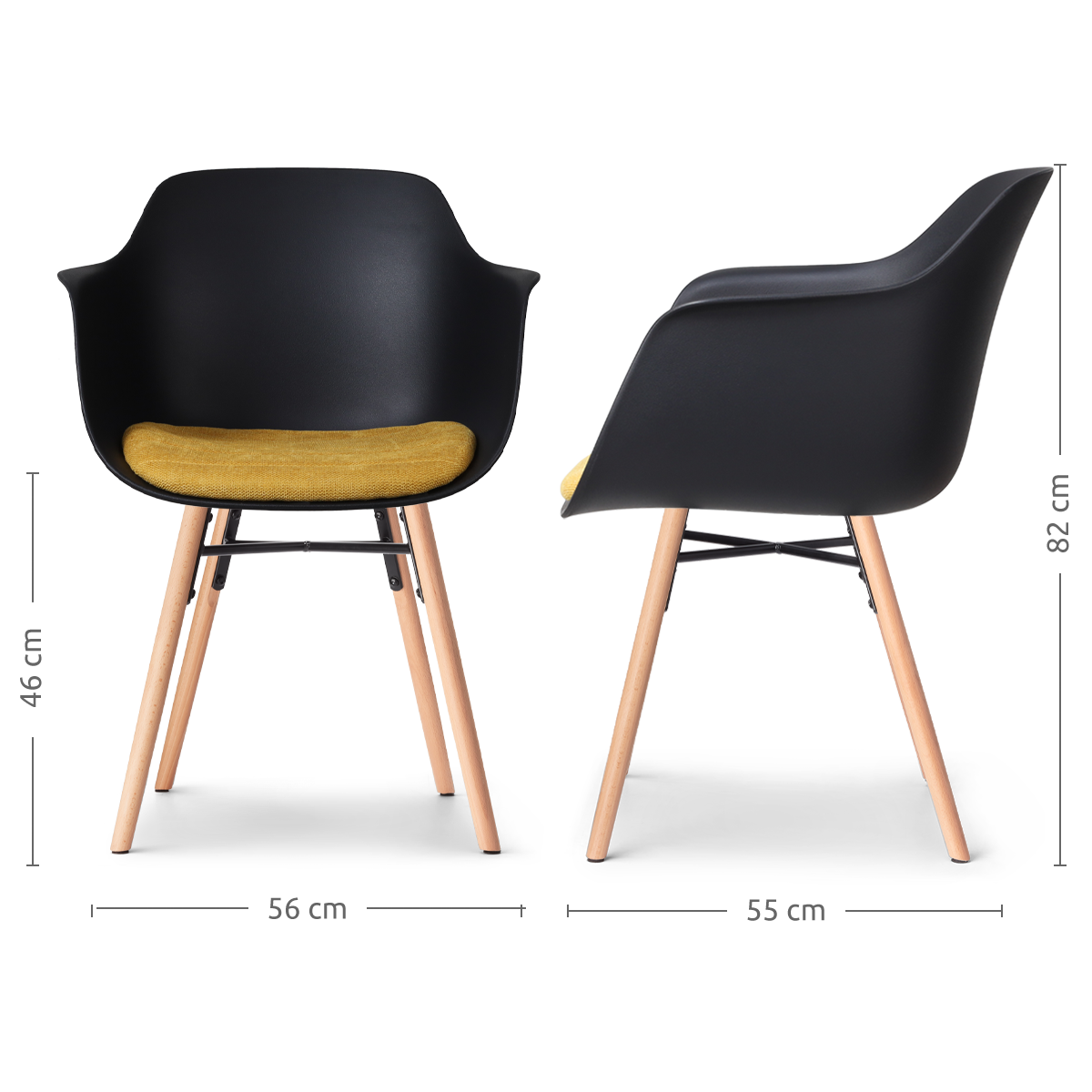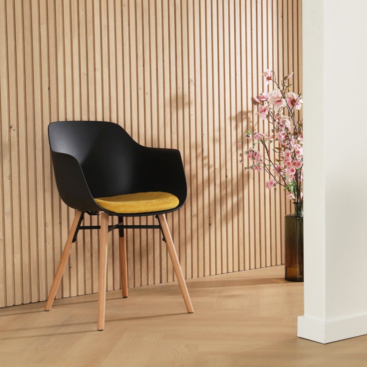 De ergonomische vorm en het doordachte design maken van de Nena-Liz de ideale keuze voor je eethoek. Deze eetkamerstoel combineert een functionele kunststof zitting met een sfeervol houten onderstel. De beukenhouten poten hebben een naturel houtkleur en worden verstevigd door een zwarte metalen kruisverbinding bovenin. De zitting is gemaakt van door en door gekleurd kunststof, waardoor de stoel bestand is tegen krassen en beschadigingen. Dankzij de flexibele kunststof kuip en de armleuningen kan je een ontspannen zithouding aannemen, terwijl het vaste zitkussen bekleed met hoogwaardige stof ervoor zorgt dat je lekker zacht zit. Het leuke aan de Nena-Liz eetkamerstoel is dat je zelf kan bepalen hoe hij eruitziet. Maak een keuze uit de witte of zwarte zitting en kies uit vijf verschillende kleuren stof voor het vaste zitkussen om deze stoel helemaal aan jouw wensen te laten voldoen.