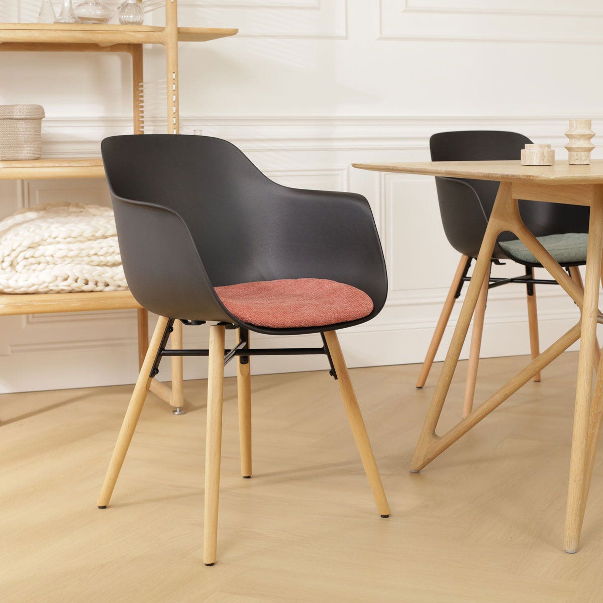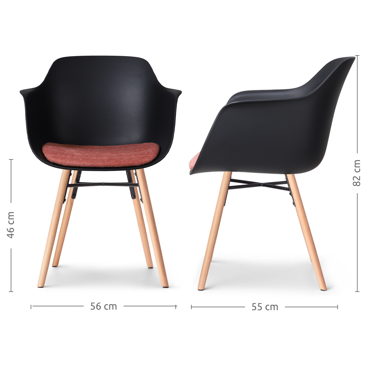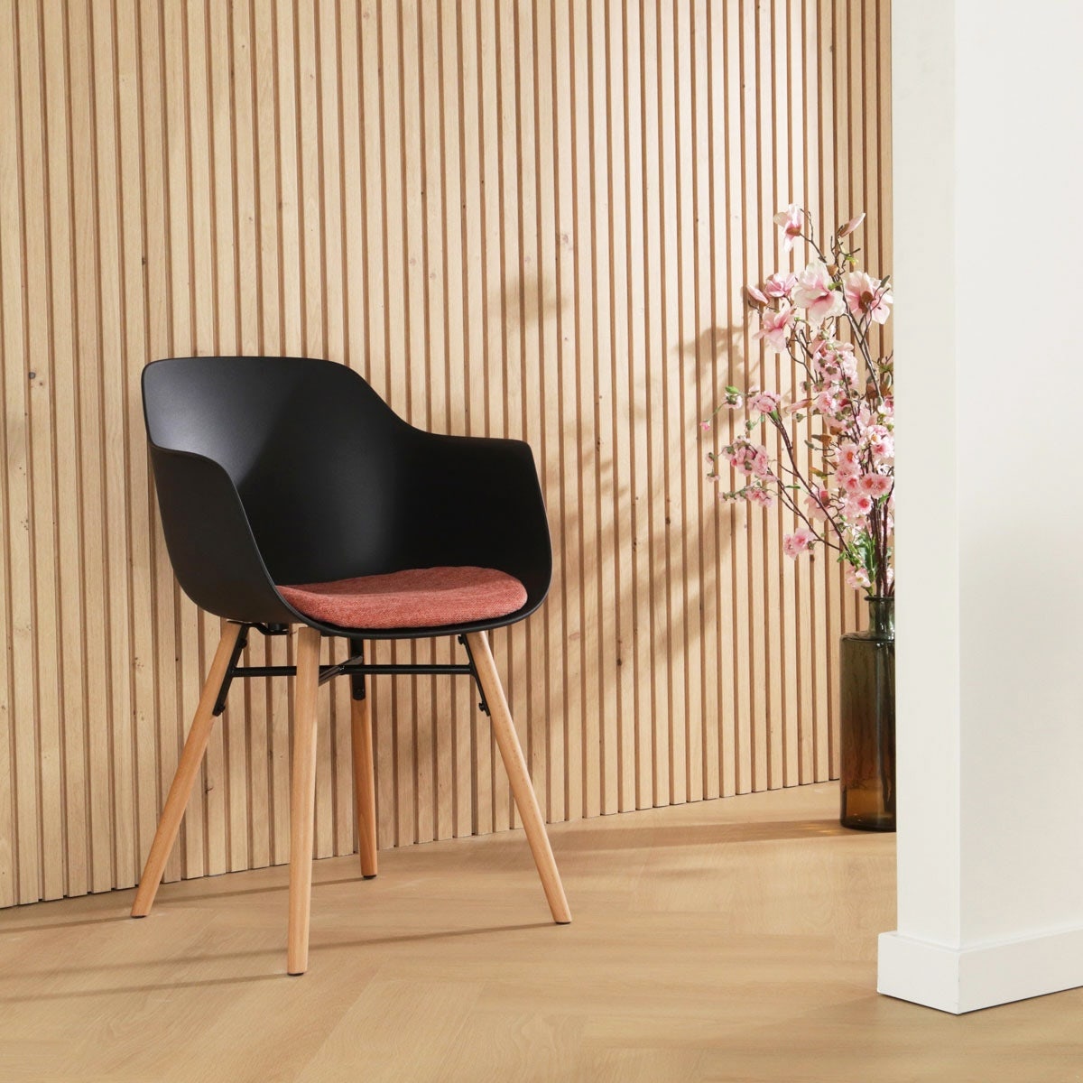 De ergonomische vorm en het doordachte design maken van de Nena-Liz de ideale keuze voor je eethoek. Deze eetkamerstoel combineert een functionele kunststof zitting met een sfeervol houten onderstel. De beukenhouten poten hebben een naturel houtkleur en worden verstevigd door een zwarte metalen kruisverbinding bovenin. De zitting is gemaakt van door en door gekleurd kunststof, waardoor de stoel bestand is tegen krassen en beschadigingen. Dankzij de flexibele kunststof kuip en de armleuningen kan je een ontspannen zithouding aannemen, terwijl het vaste zitkussen bekleed met hoogwaardige stof ervoor zorgt dat je lekker zacht zit. Het leuke aan de Nena-Liz eetkamerstoel is dat je zelf kan bepalen hoe hij eruitziet. Maak een keuze uit de witte of zwarte zitting en kies uit vijf verschillende kleuren stof voor het vaste zitkussen om deze stoel helemaal aan jouw wensen te laten voldoen.