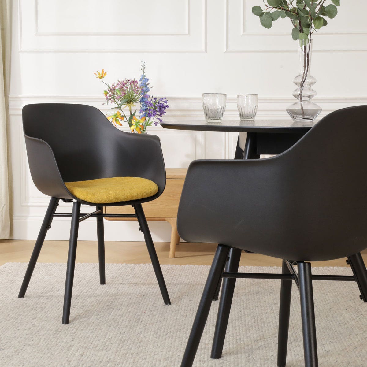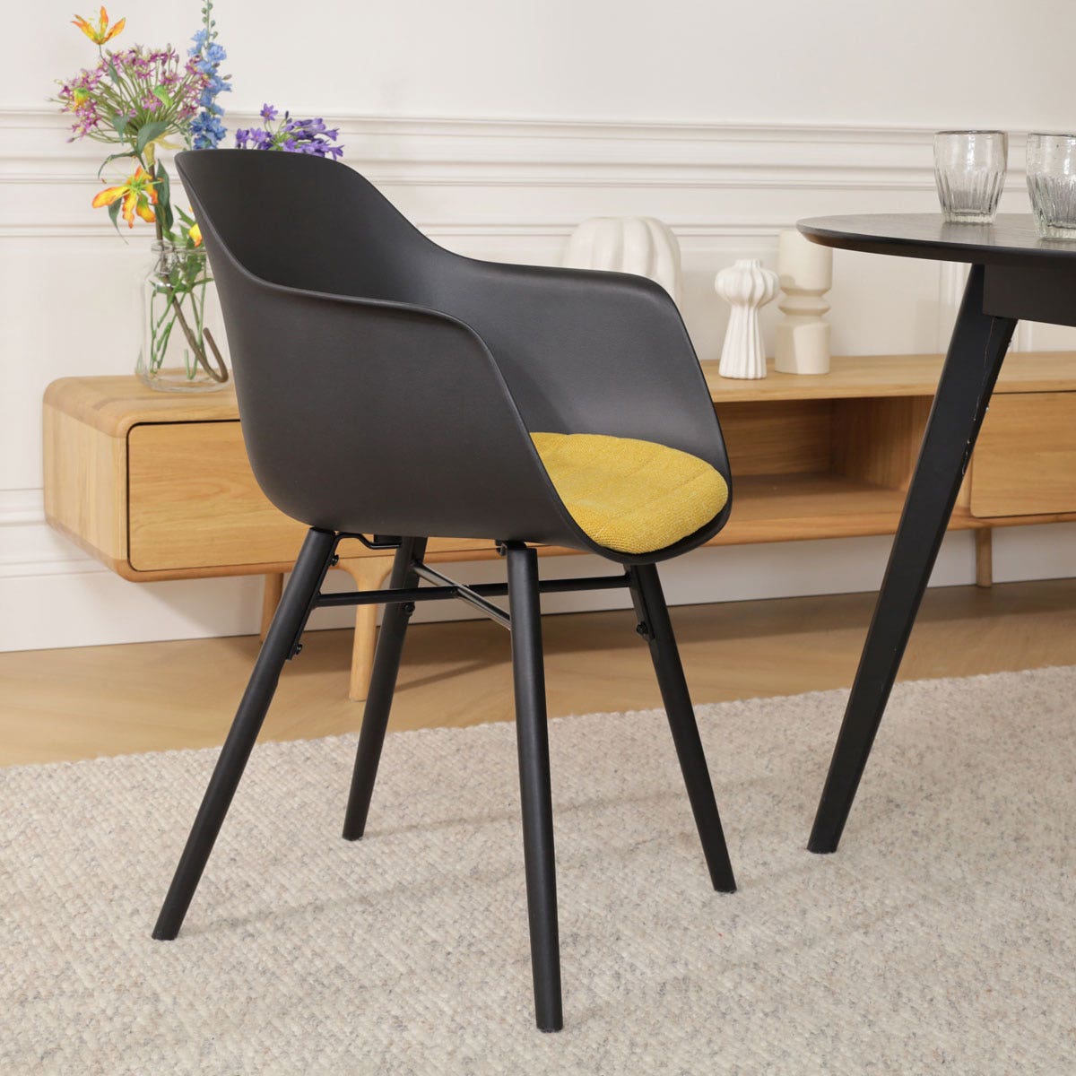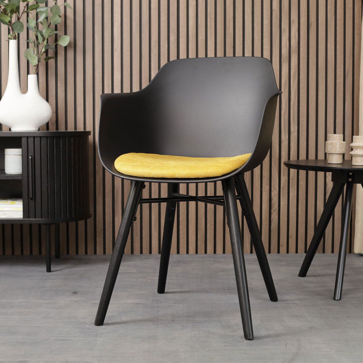 Een praktische en tegelijkertijd sfeervolle eetruimte creëer je met de Nena-Liz eetkamerstoel met kunststof zitting en armleuningen.