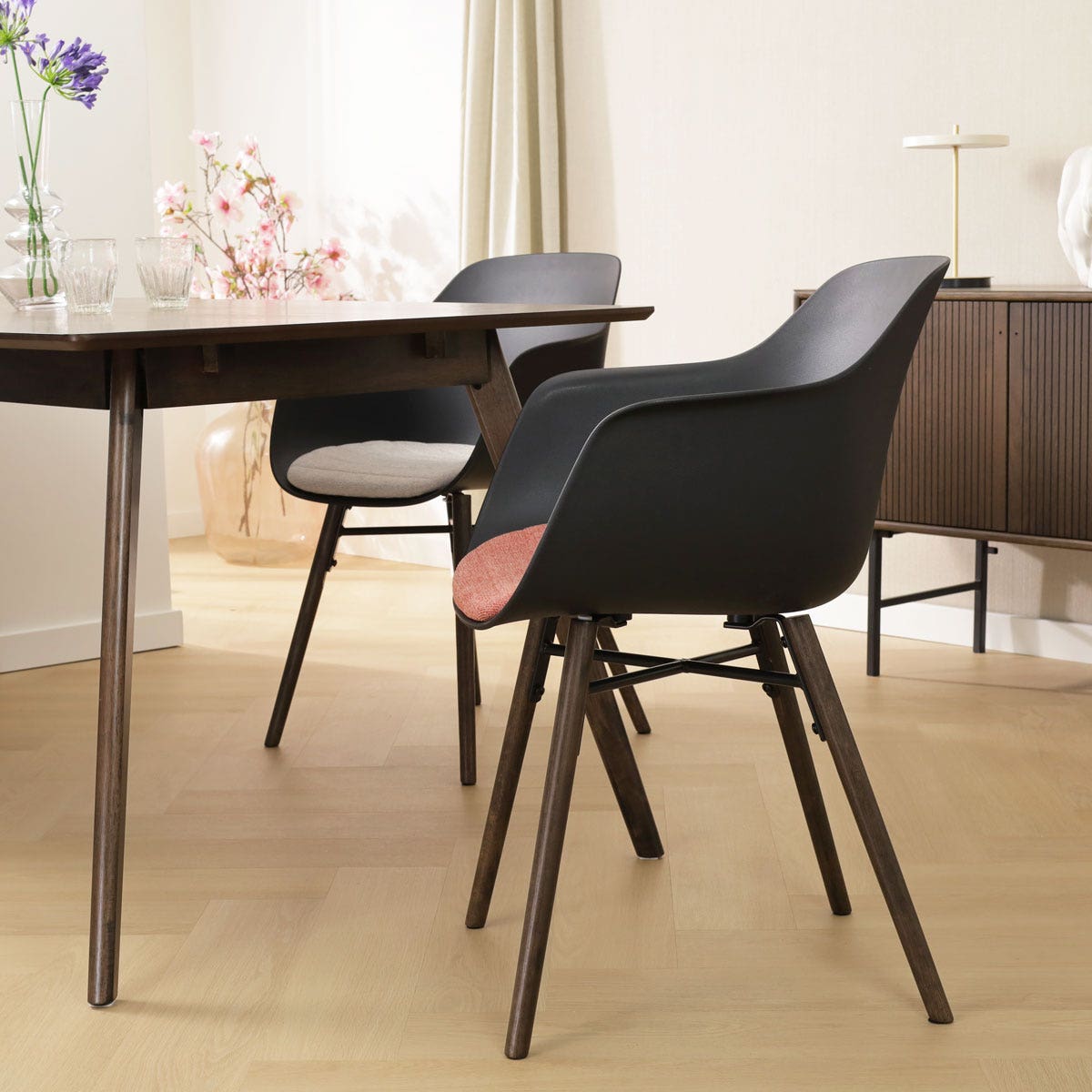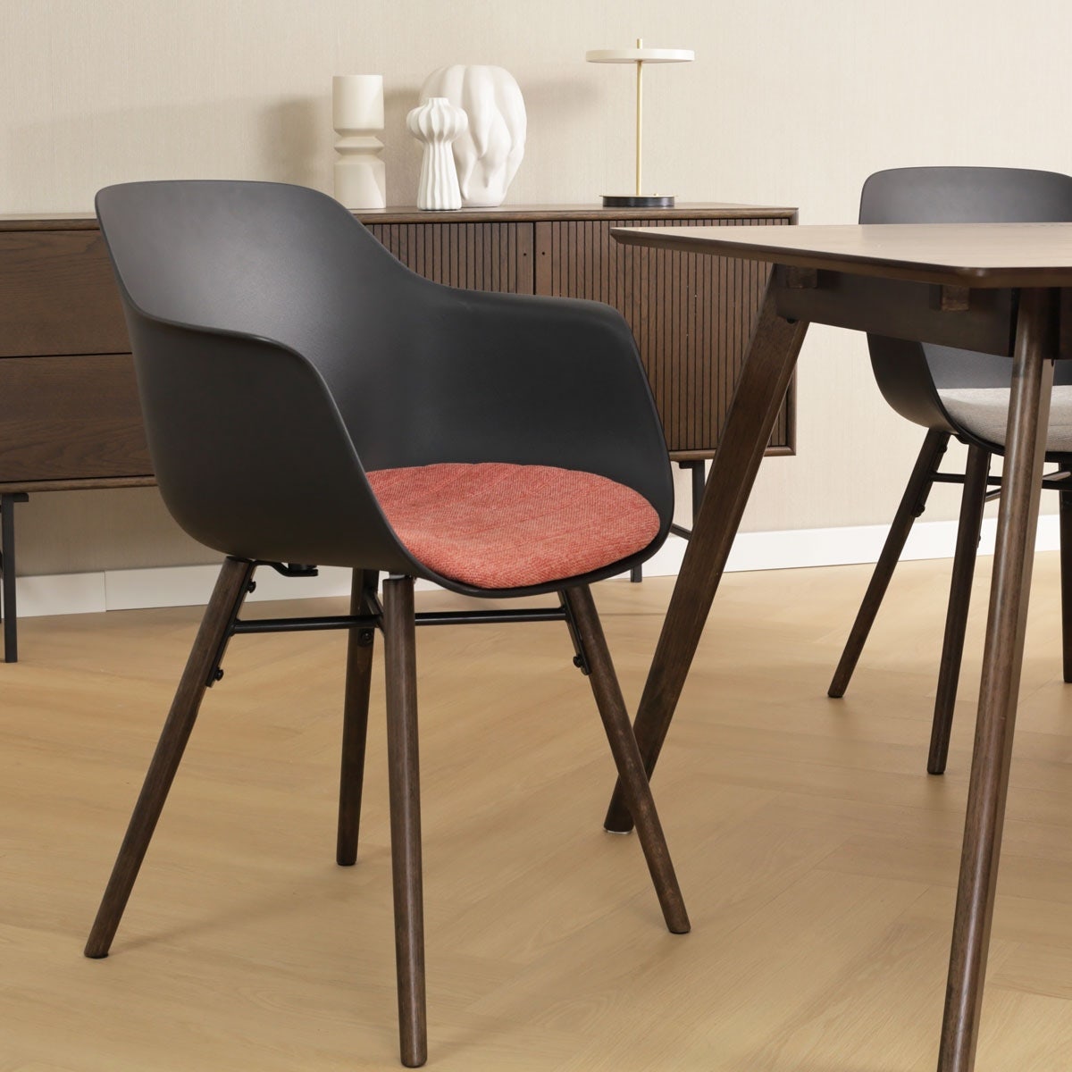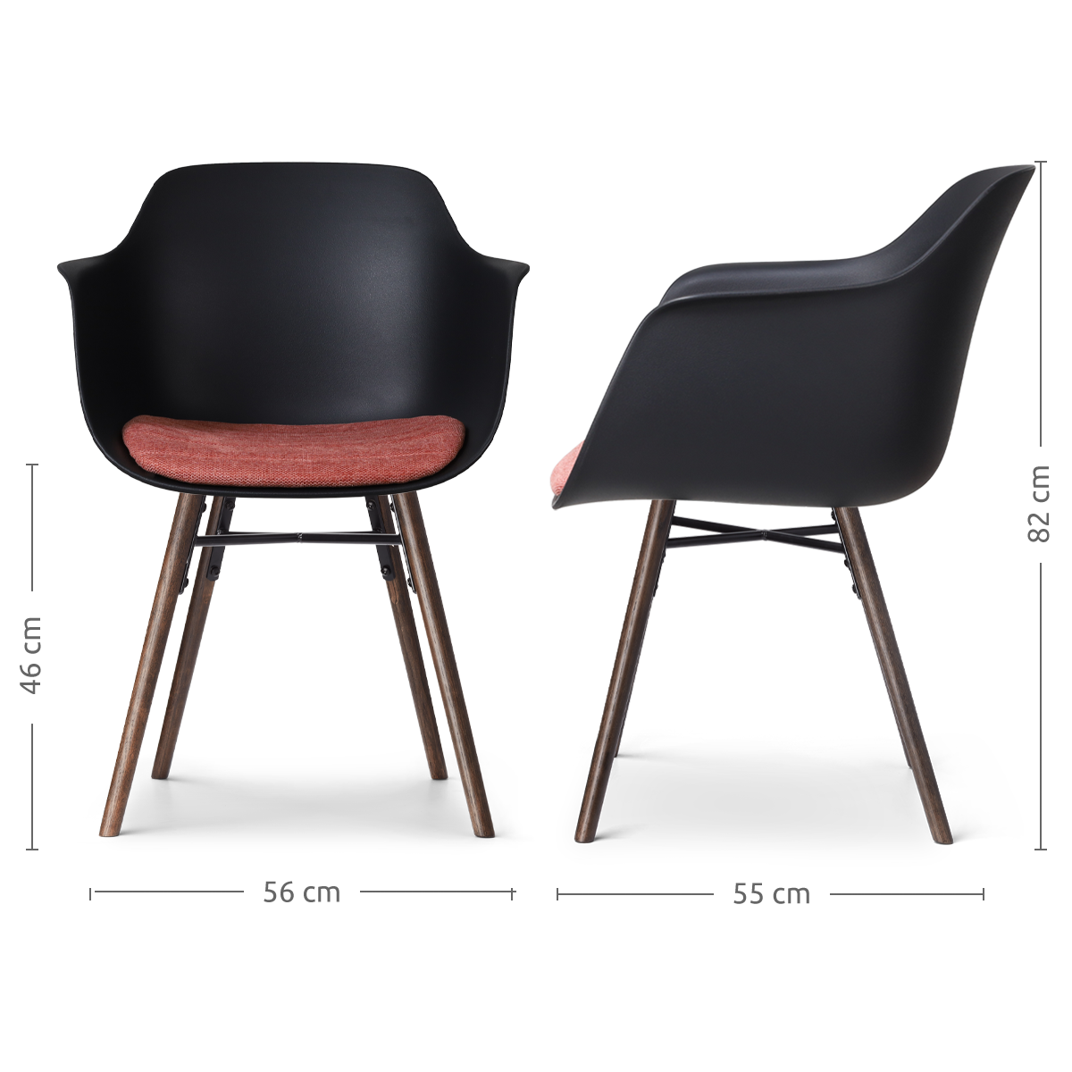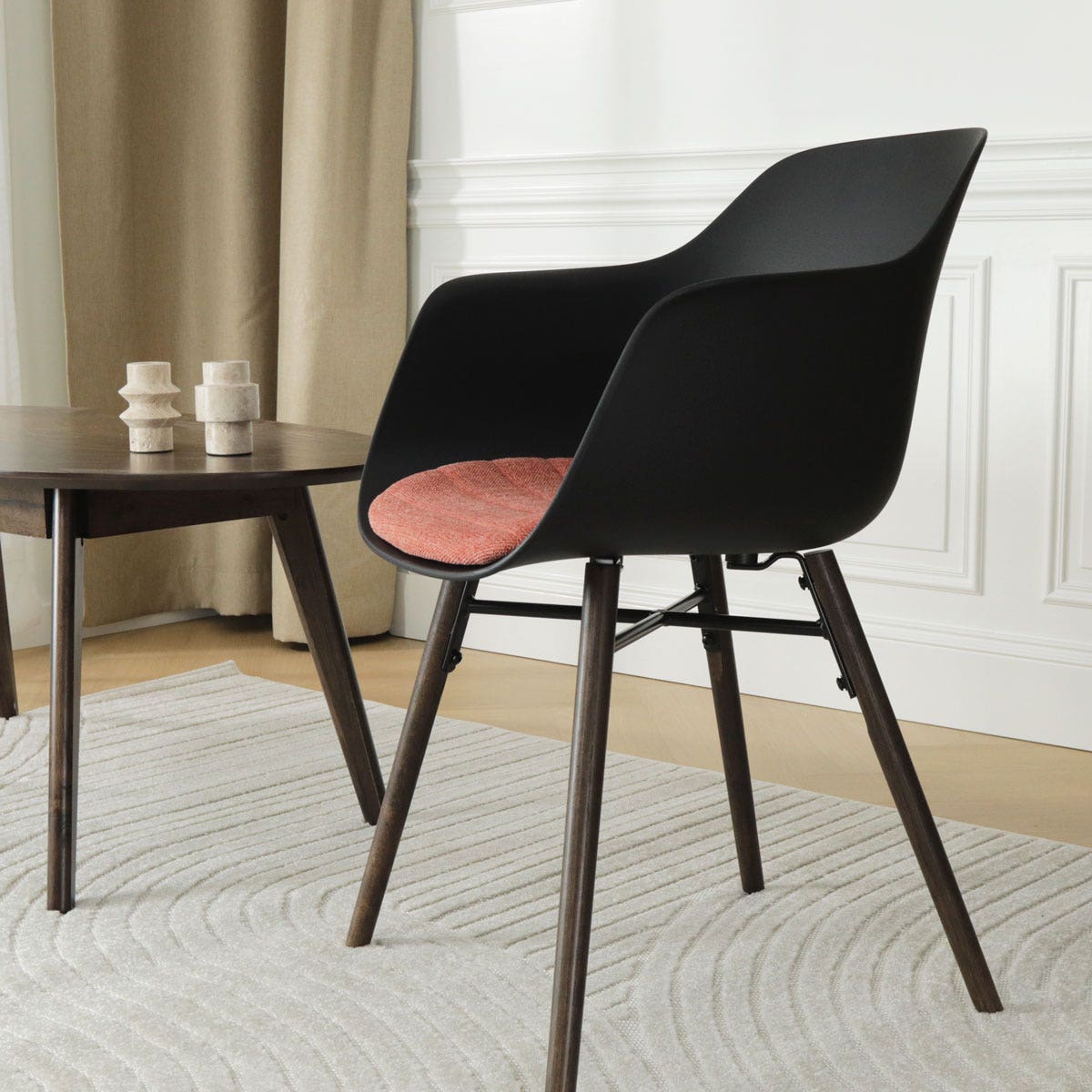 De combinatie van het strakke, eigentijdse ontwerp en de warme walnoot kleur van de houten poten voegt een vleugje elegantie toe aan elke eetkamer. De kunststof zitting van deze kuipstoel is niet alleen duurzaam, maar ook nog eens erg praktisch. Maak je geen zorgen over knoeien of morsen: het gladde oppervlak is gemakkelijk af te nemen met een vochtige doek. De houten poten zijn gemaakt van eikenhout, wat bijdraagt aan de duurzaamheid en stabiliteit van de stoel. Naast de ergonomische vorm van de kunststof zitting is de eetkamerstoel ook ontworpen met armleuningen, zodat je urenlang ontspannen aan tafel kan zitten. Het vaste zitkussen gemaakt van zachte stof tilt het comfort naar een nog hoger niveau en voegt wat zachtheid toe aan het ontwerp. Deze comfortabele kuipstoel is verkrijgbaar in twee verschillende kleuren en met vier kleuren stoelkussens, waardoor je eenvoudig de perfecte combinatie kunt vinden die past bij jouw persoonlijke stijl.
