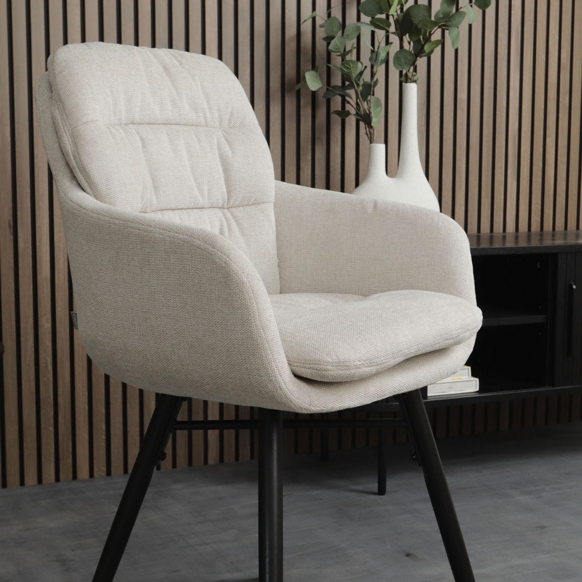 De Nena-Mia eetkamerstoel is een sfeervolle en comfortabele eetkamerstoel met houten poten van het merk Nolon.