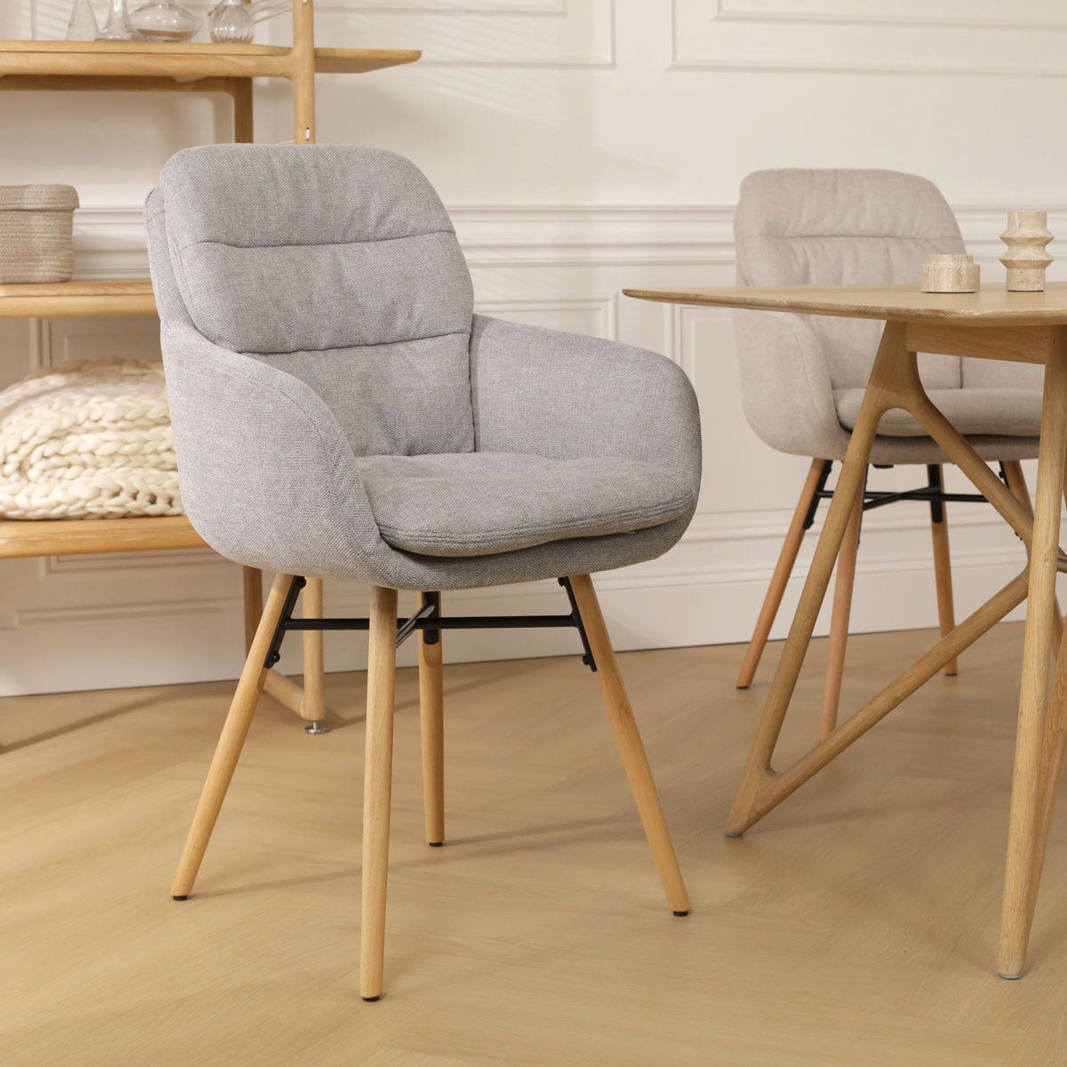 Deze eetkamerstoel is de ideale keuze als je op zoek bent naar een stoel die op en top comfort biedt. Het onderstel van de eetkamerstoel is gemaakt van hout en heeft een metalen kruis in het midden. Dit zorgt voor stevigheid en is een stoer detail. De comfortabele zitting heeft een hoge rugleuning en armleuningen om het lichaam voldoende steun te geven aan tafel. De zachte stoffen bekleding en het vaste zitkussen zorgen ervoor dat je extra zacht zit. Lang natafelen is met de Nena-Mia dus zeker geen probleem. Maak een keuze uit de beige of grijze bekleding en geef jouw eethoek een stijlvolle en comfortabele upgrade met de Nena-Mia eetkamerstoel. Is deze zitting of het houten onderstel juist precies wat je zoekt? Met de uitgebreide mix en match collectie van Nolon kan je ieder onderstel met elke zitting combineren.