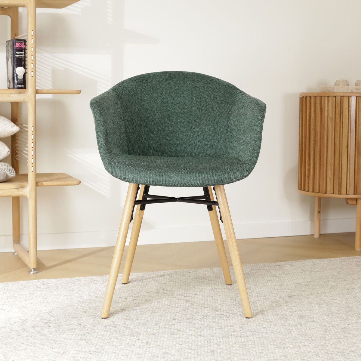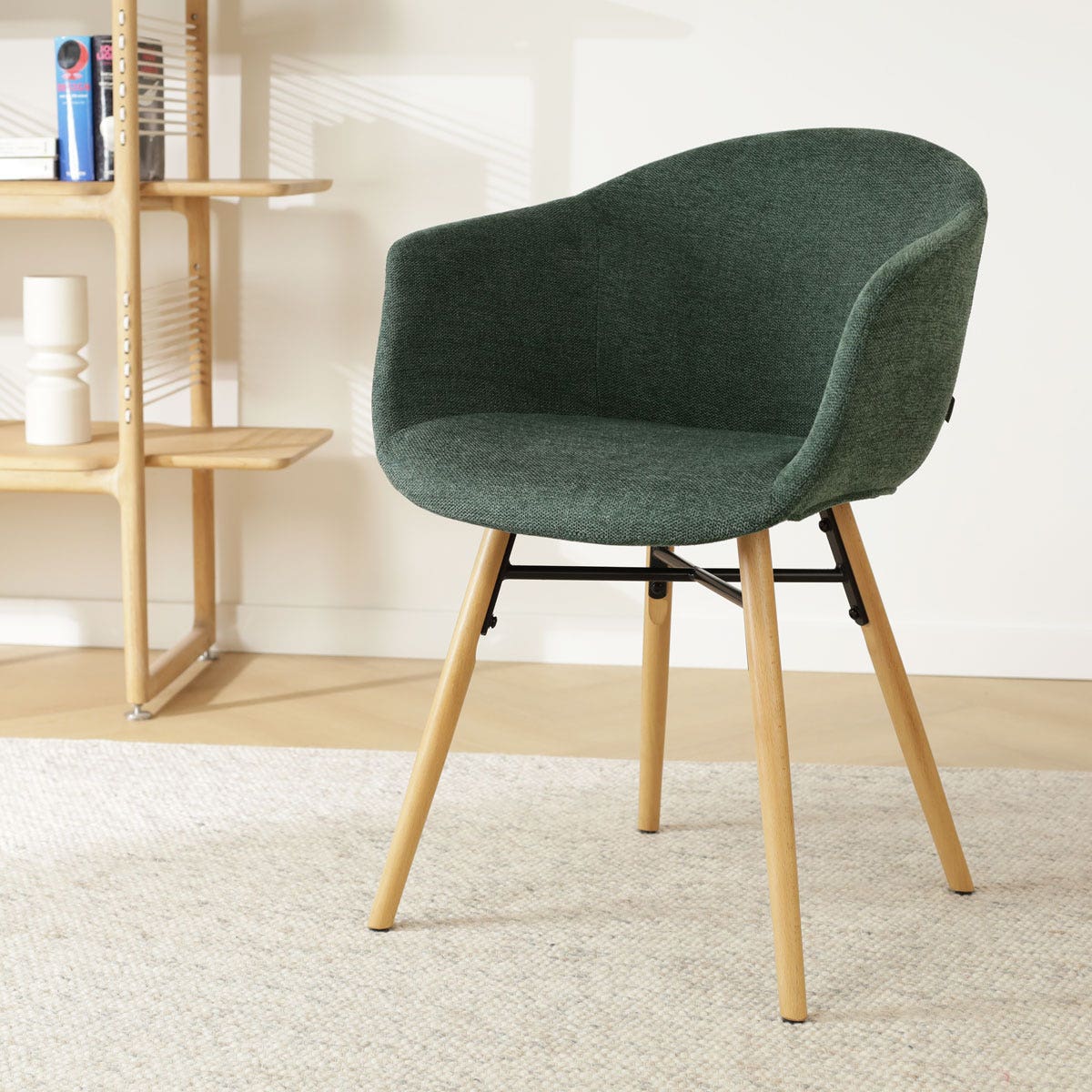 Deze eetkamerstoel is ontworpen met oog voor detail en combineert functionaliteit en stijl op perfecte wijze. De stoel heeft een onderstel van vier beukenhouten poten met een zwarte metalen kruisverbinding. De naturel houtkleur zorgt voor een warme uitstraling in de eethoek terwijl dit natuurlijke materiaal zorgt voor stabiliteit en duurzaamheid. De zitting is ontworpen met ergonomische vormen en aflopende armleuningen om het lichaam optimaal te ondersteunen en een hoog zitcomfort te bieden. De kuipzitting is bekleed met hoogwaardige stof voor een zachte zitervaring en is in zes verschillende kleuren verkrijgbaar. Is de Otis zitting met armleuningen precies wat je zoekt maar heb je liever een ander onderstel? Dat kan met de uitgebreide mix en match collectie van Nolon!