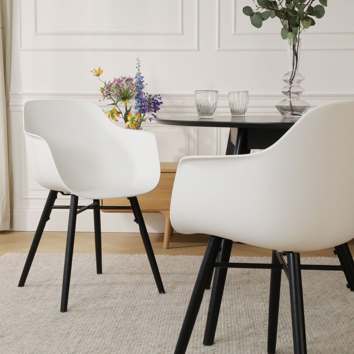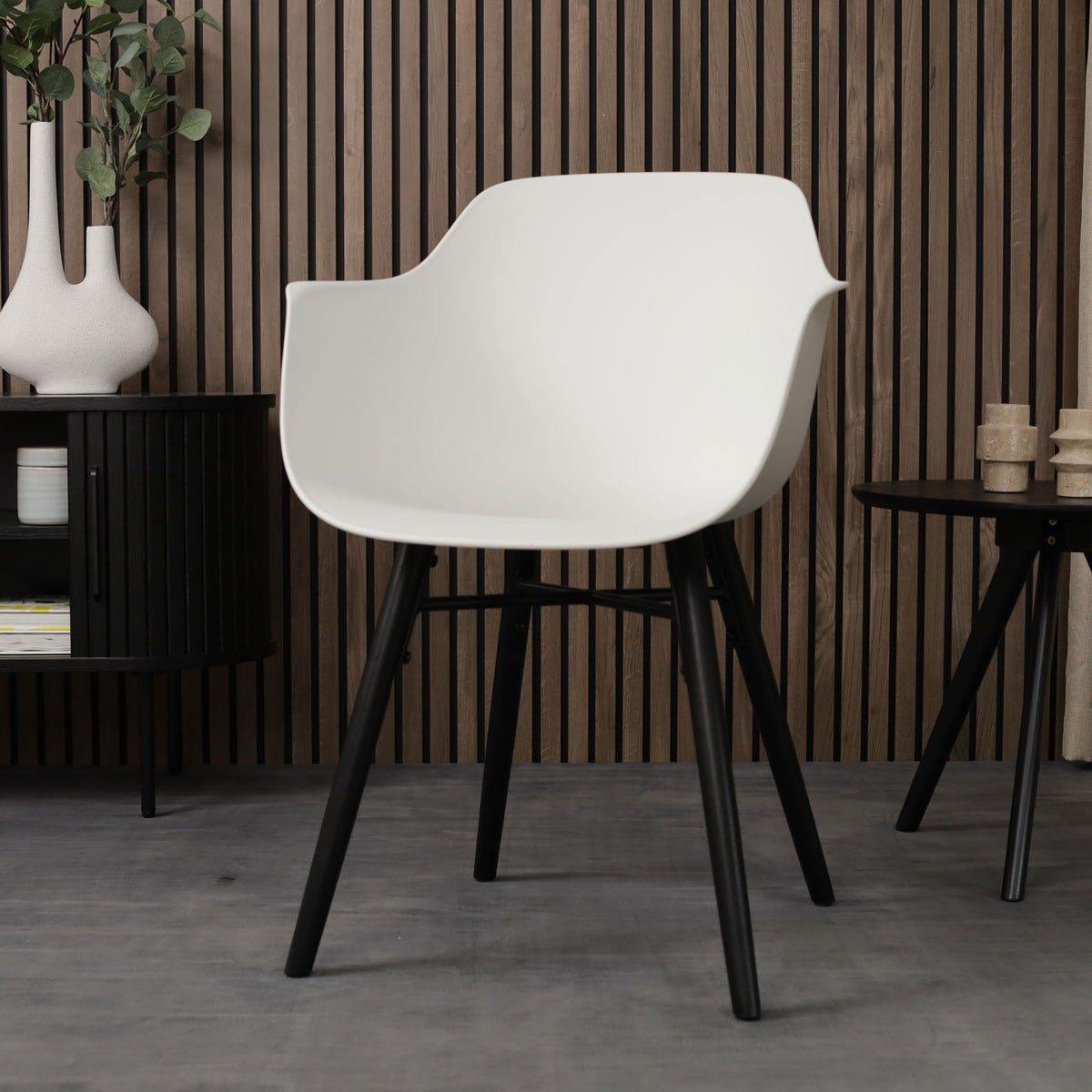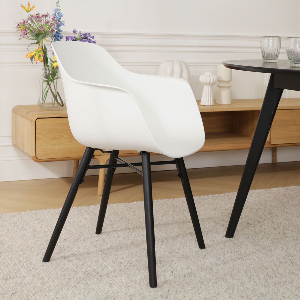 De Nena-Puk eetkamerstoel in wit met een zwart houten onderstel is een trendy en stoere toevoeging aan je interieur.