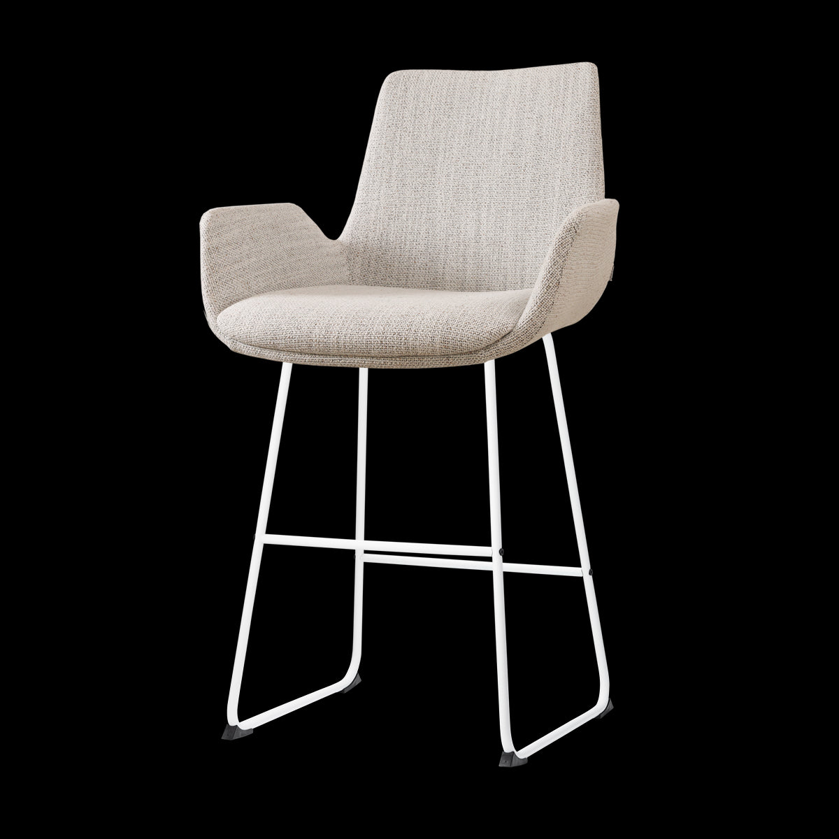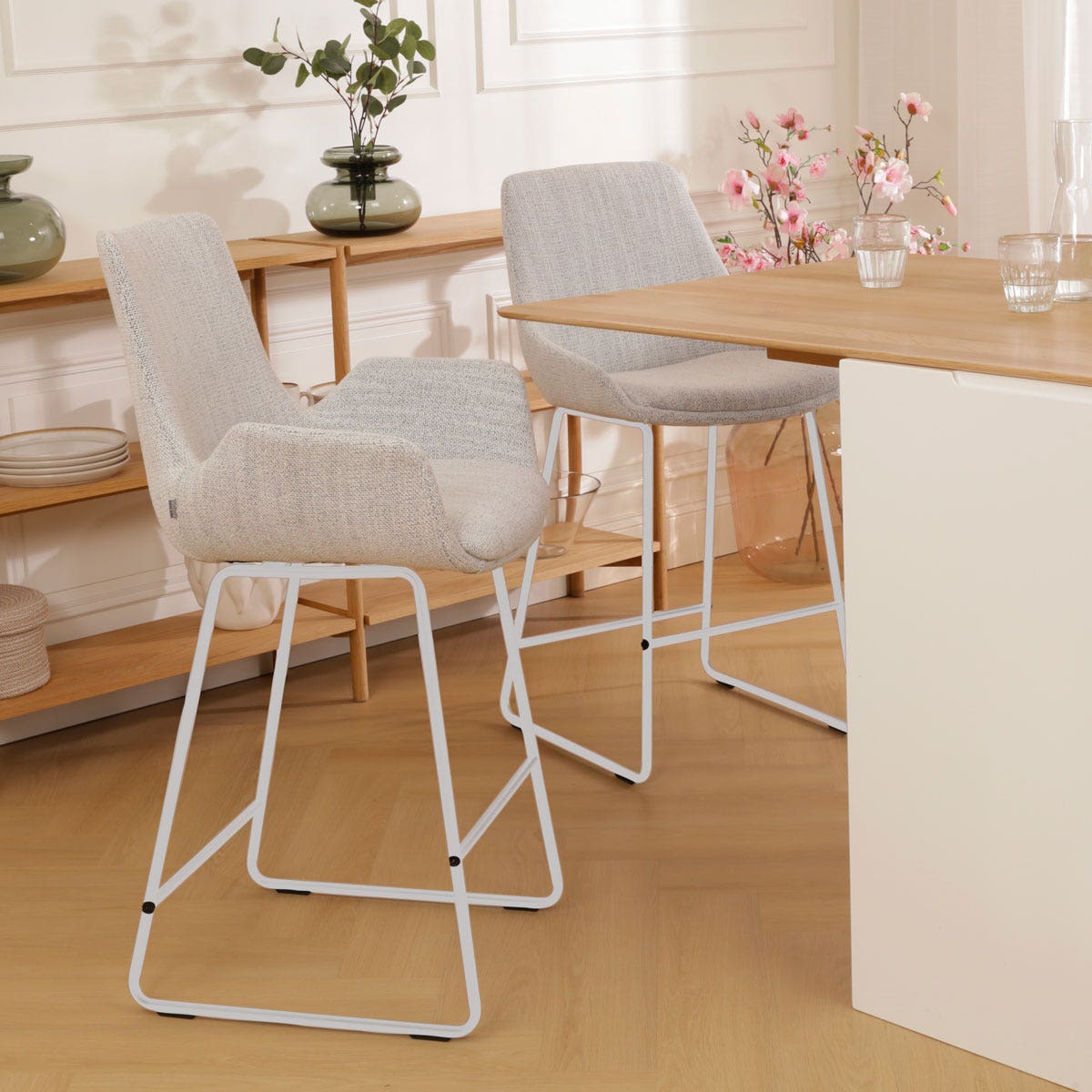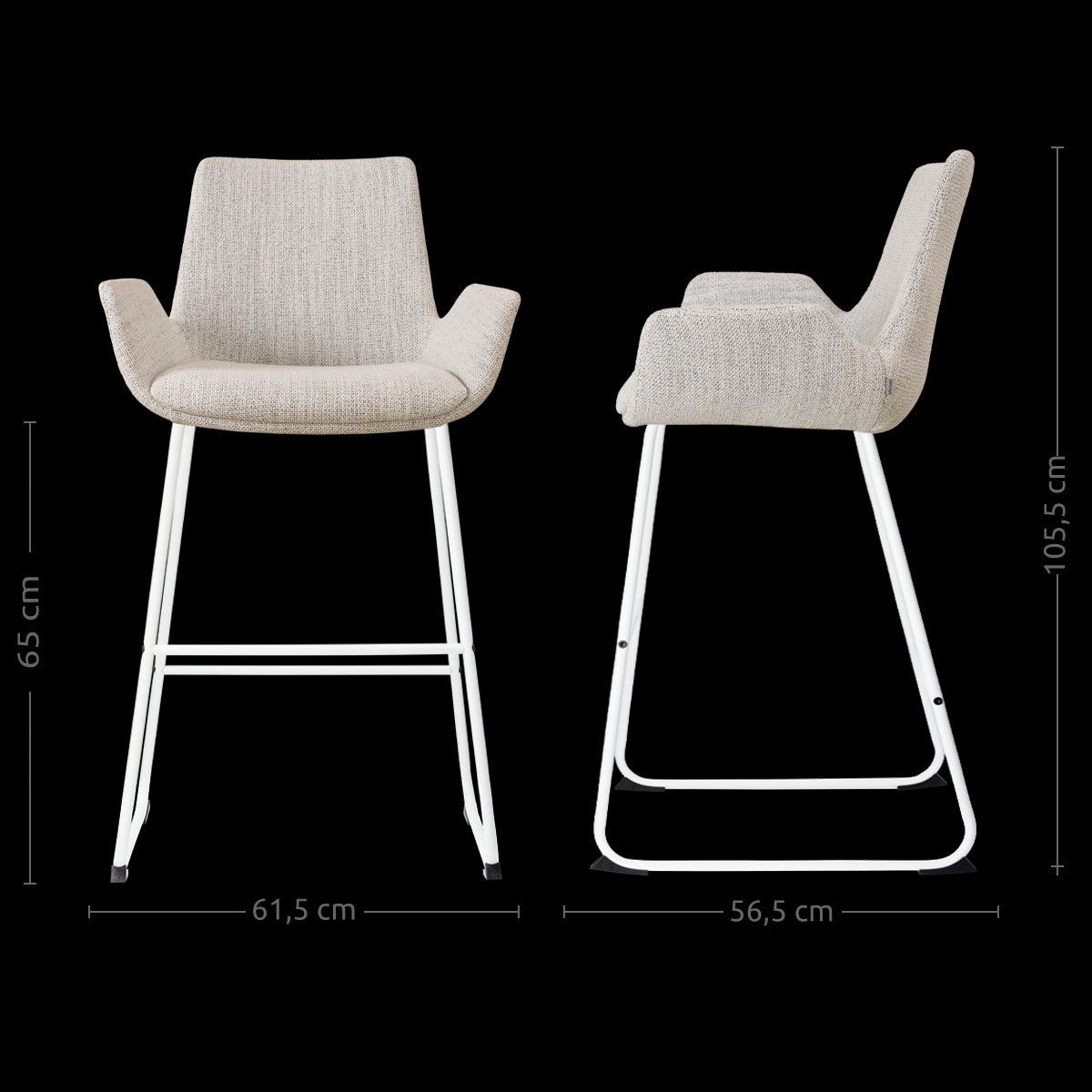 Deze barkruk is ontworpen met zowel functionaliteit als esthetiek in gedachten. Het witte metalen onderstel met zithoogte van 65 cm zorgt voor een stabiele zit en laat de barkruk tegelijkertijd modern en luchtig ogen. De comfortabele zitting heeft een stevige rugleuning en is bekleed met luxe stof in beige gemêleerde kleur. Hiermee is de Nino-Eef een sfeervolle toevoeging aan de keuken voor liefhebbers van een moderne of Scandinavische stijl. Naast de rugleuning is de Nino-Eef bovendien ontworpen met armleuningen voor extra ondersteuning. Deze armleuningen zijn iets lager dan standaard, wat niet ten koste gaat van het zitcomfort maar er wel voor zorgt dat de kruk beter onder het keukenblad past. De voetsteun op het metalen frame maakt de barkruk vervolgens helemaal af.