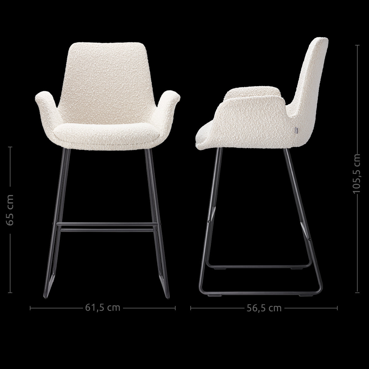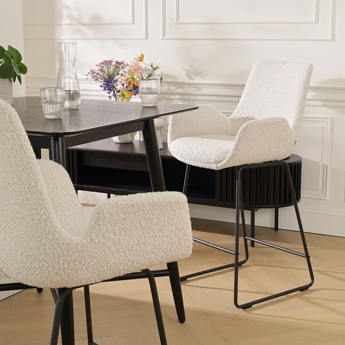 Deze barkruk is ontworpen met zowel functionaliteit als esthetiek in gedachten. Het slanke metalen onderstel zorgt voor een stabiele zit en laat de barkruk tegelijkertijd modern en luchtig ogen. De comfortabele zitting heeft een stevige rugleuning en is verkrijgbaar met luxe stoffen bekleding of bouclé stof. Hiermee is de Nino-Eef een sfeervolle toevoeging aan de keuken. Naast de rugleuning is de Nino-Eef bovendien ontworpen met armleuningen voor extra ondersteuning. Deze armleuningen zijn iets lager dan standaard, wat niet ten koste gaat van het zitcomfort maar er wel voor zorgt dat de kruk beter onder het keukenblad past. De voetsteun op het metalen frame maakt de barkruk vervolgens helemaal af. Maak een keuze uit de verschillende materialen en kleuren van de zitting en geniet van ultieme stijl en comfort aan je kookeiland.
