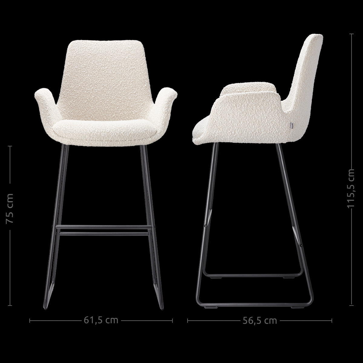 De barkruk is ontworpen met zowel comfort als stijl in gedachten. Het metalen frame van de barkruk heeft een moderne en minimalistische uitstraling, en zorgt voor stevigheid en stabiliteit. De zitting is bekleed met luxe stof in de kleur beige, of met bouclé stof in de kleuren beige of taupe. Dankzij deze stoffen zitting heeft de barkruk een chique uitstraling en creëer je een sfeervolle plek om te eten. Met een zithoogte van 75 centimeter is deze kruk geschikt om aan een bar of hoge eettafel te gebruiken. Wil je de kruk aan een kookeiland gebruiken? Dan is de Nino-Eef met een zithoogte van 65 cm beter geschikt voor jou.