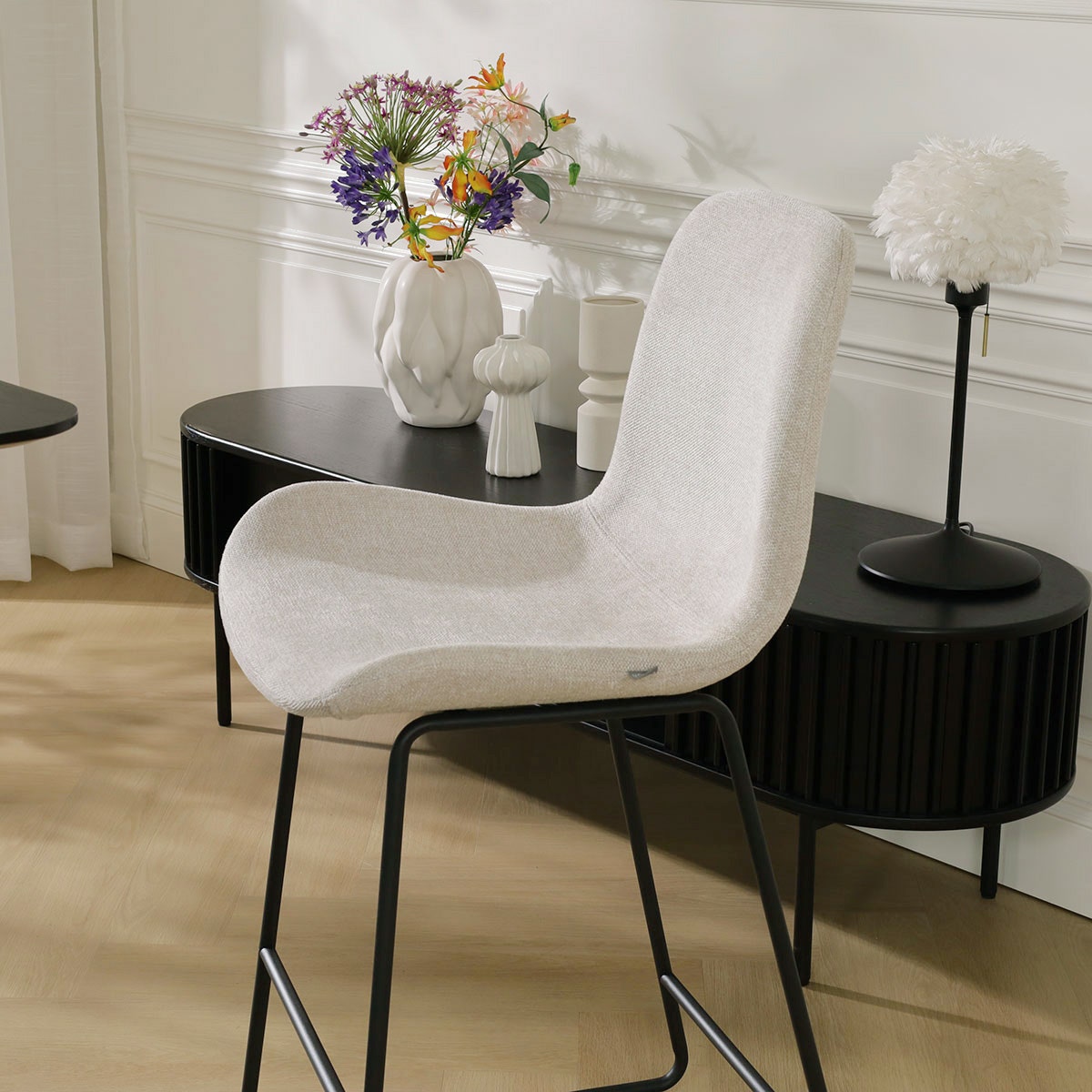 Deze moderne barkruk combineert namelijk een strak metalen onderstel met een zachte gestoffeerde zitting, en is tegelijkertijd ook nog eens erg comfortabel. De zitting van deze kruk is ontworpen met subtiele rondingen en een gevleugeld zitvlak om ervoor te zorgen dat je urenlang comfortabel kan zitten. De zachte bekleding draagt bij aan het zitcomfort en zorgt bovendien voor een warme sfeer in de eethoek. Met diverse kleuren en materialen om uit te kiezen kan je deze barkruk helemaal aan jouw interieur aanpassen. Kies uit het witte of zwarte onderstel en combineer deze met de zitting in bijvoorbeeld ribstof of teddystof voor een ware blikvanger in huis. Met een zithoogte van 74,5 cm is deze barkruk geschikt voor aan een hoge eettafel of bar. Heb je een lager model nodig? De Nino-Fé is ook verkrijgbaar in een kookeiland variant.