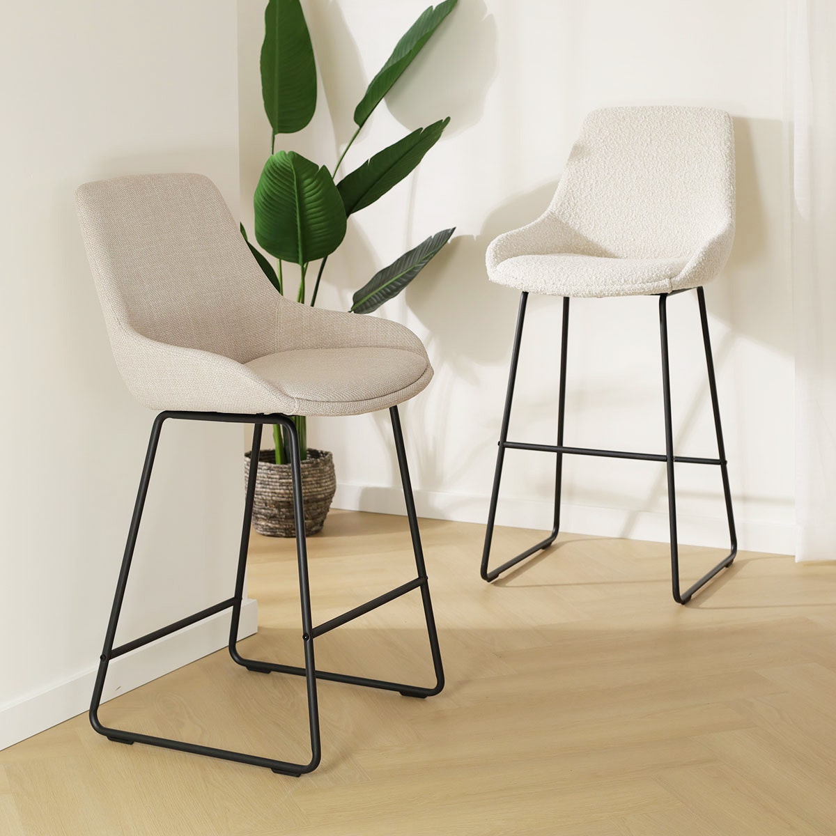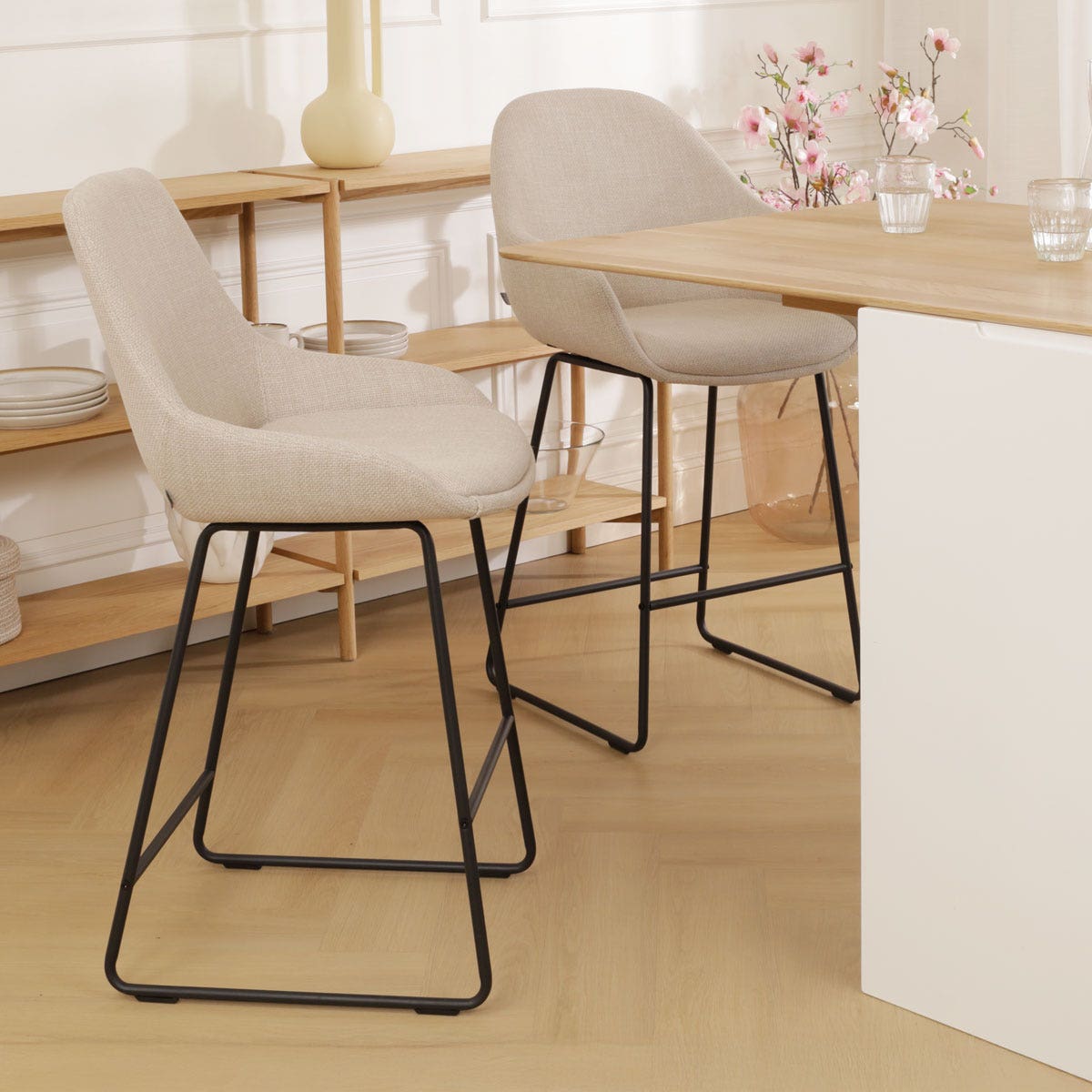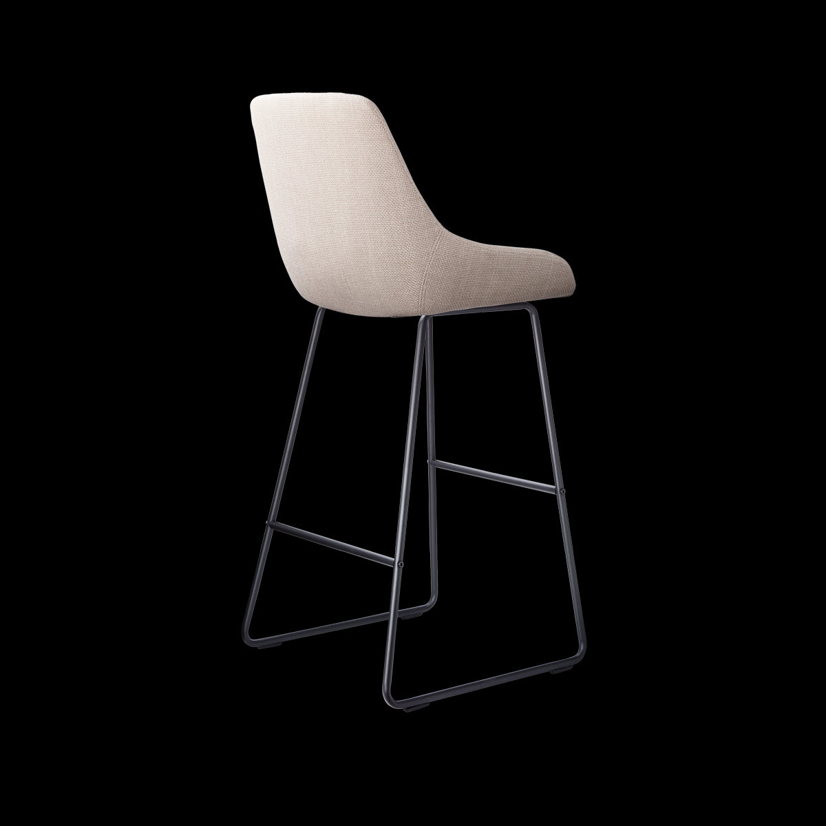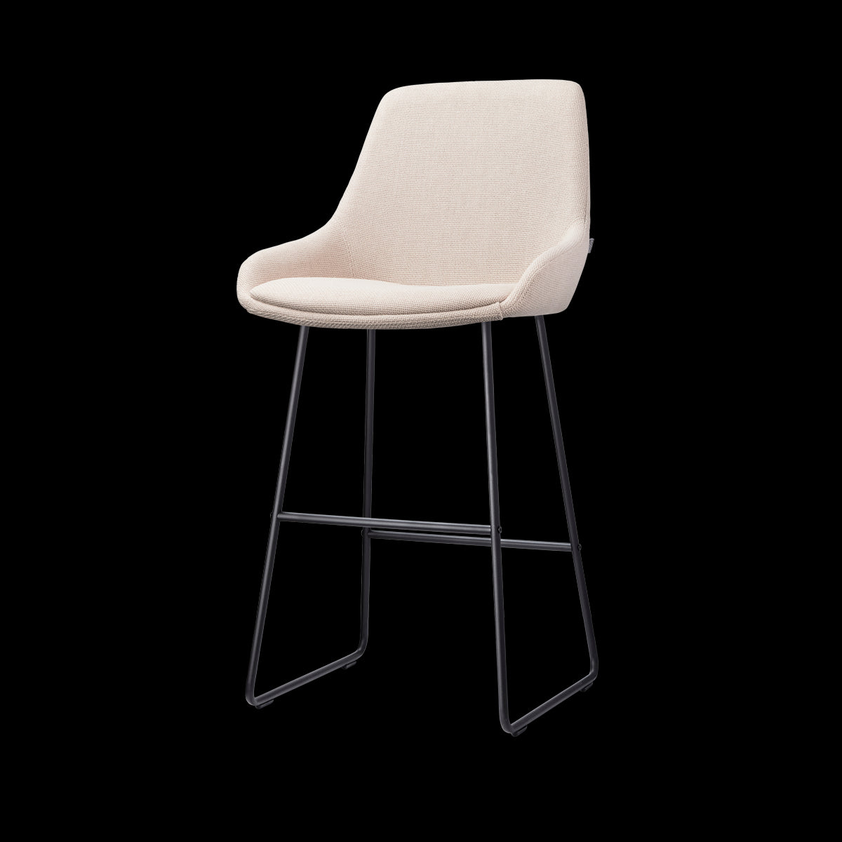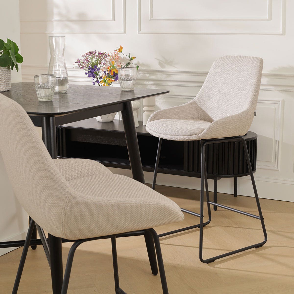 Deze barkruk heeft een moderne Scandinavische uitstraling met zijn minimalistische zwarte metalen onderstel en volledig gestoffeerde beige zitting. Met een zithoogte van 75 cm is hij ideaal voor tafels tussen de 98 en 105 cm hoog. De kruk is ontworpen zonder armleuningen, waardoor hij minder ruimte inneemt en gemakkelijk onder tafels schuift. De stevige zitting met ergonomische vorm biedt comfort tijdens het dineren, terwijl de voetensteun op het frame extra ondersteuning biedt. De kruk is zeer eenvoudig in elkaar te zetten en is verkrijgbaar in verschillende kleuren en stoffen, inclusief een luxe bouclé-optie. Dankzij de hoogte van 112 cm en een zitdiepte van 40 cm, past de Nino-Isa barkruk moeiteloos in een modern interieur zonder afbreuk te doen aan functionaliteit of stijl.