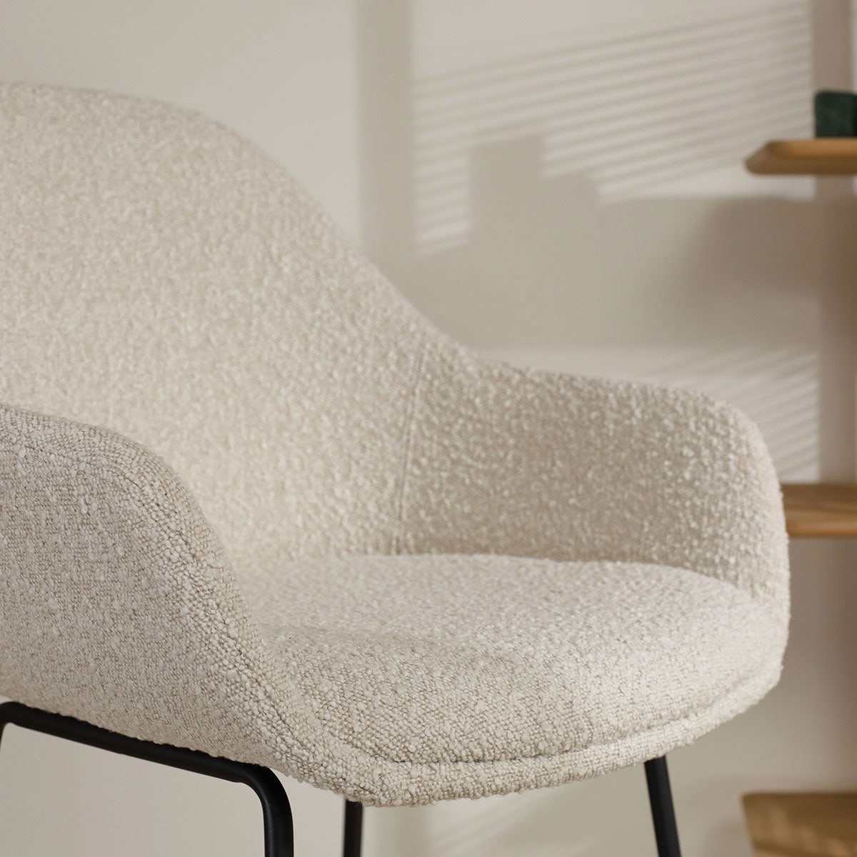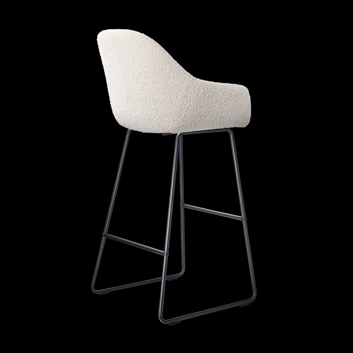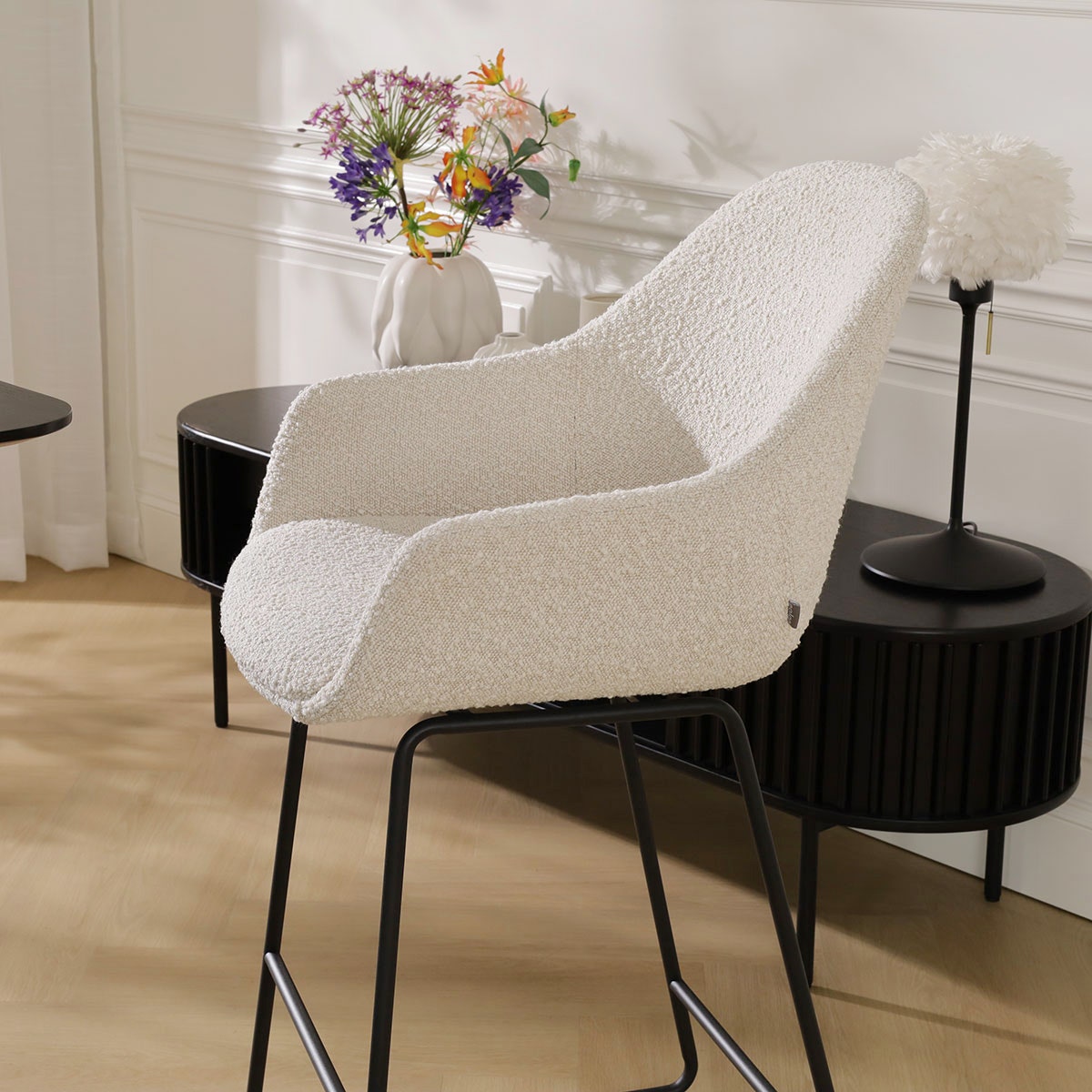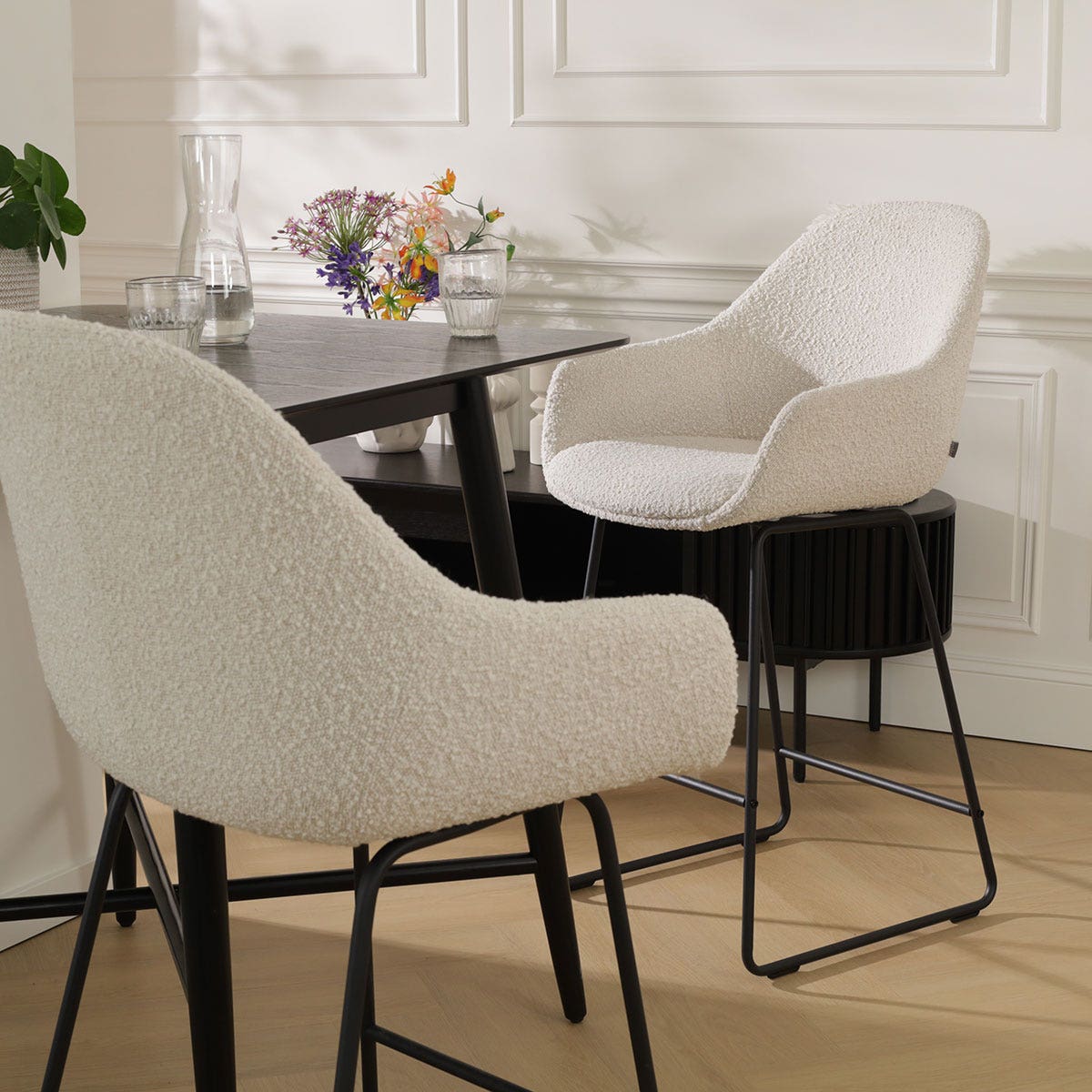 De Nino-Mae barkruk in bouclé beige met zwarte poten combineert een tijdloos design met optimaal zitcomfort. Deze barkruk is ontworpen met een comfortabele kuipzitting, volledig gestoffeerd in zachte bouclé stof, die zowel luxe als duurzaamheid uitstraalt. De zwarte metalen poten zorgen niet alleen voor een stevige basis, maar geven de barkruk ook een moderne en elegante uitstraling. Dankzij de zithoogte van 75 cm is deze hoge barkruk perfect geschikt voor gebruik aan een bar of een hoge eettafel met een bladhoogte tussen 98 en 105 cm. De armleuningen en voetsteun maken lange zitmomenten bijzonder aangenaam, terwijl de ergonomische vorm ondersteuning biedt aan de rug en armen. De Scandinavische stijl van de Nino-Mae kruk past moeiteloos in diverse interieurs, van modern tot hotel chique. Het slanke ontwerp laat de ruimte open en overzichtelijk, zonder in te leveren op stijl of comfort. Of je nu een gezellige thuisbar wilt inrichten of een stijlvolle toevoeging zoekt voor je eetruimte, de Nino-Mae barkruk tilt jouw interieur naar een hoger niveau.