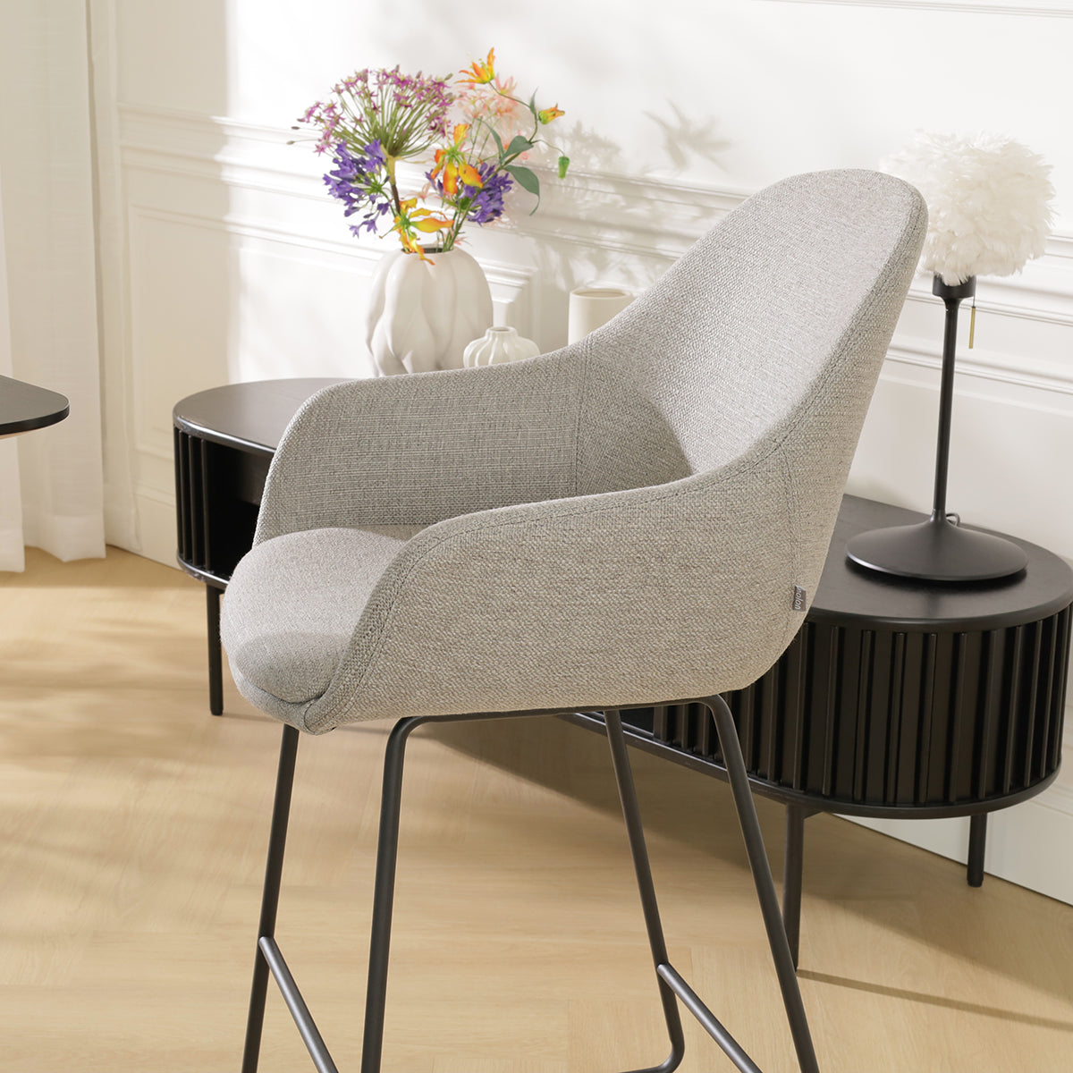 De Nino-Mae barkruk is een perfecte keuze voor wie een stijlvolle en comfortabele zitoplossing zoekt voor het kookeiland. Deze barkruk combineert een strak, Scandinavisch design met een luxe uitstraling dankzij de volledig gestoffeerde zitting in warm grijze stof. De zwarte metalen poten zorgen niet alleen voor stabiliteit, maar geven ook een moderne touch aan elk interieur. Met een zithoogte van 65 cm is de barkruk ideaal voor keukens met een werkbladhoogte tussen 88 en 95 cm. Het ergonomische ontwerp, inclusief zachte armleuningen en een comfortabele voetsteun, maakt de Nino-Mae barkruk niet alleen een lust voor het oog, maar ook een genot om op te zitten. Het stevige houten binnenwerk van de zitting biedt optimale ondersteuning en duurzaamheid. Dankzij de ronde vormen en het minimalistische ontwerp past deze barkruk moeiteloos in allerlei interieurstijlen, van moderne tot industriële interieurs.