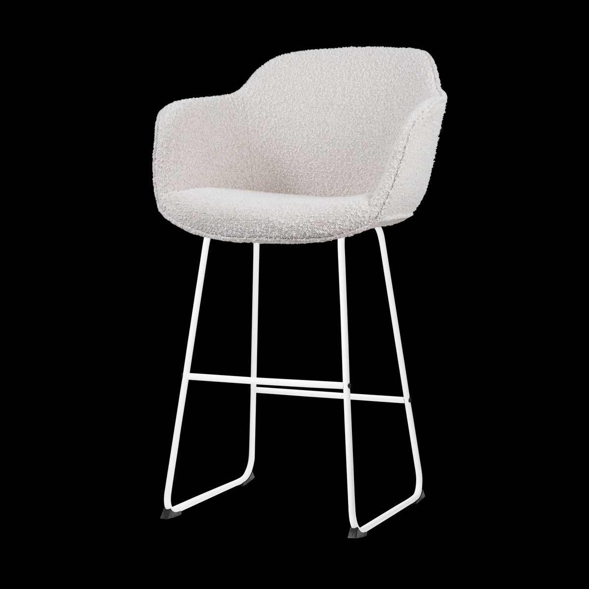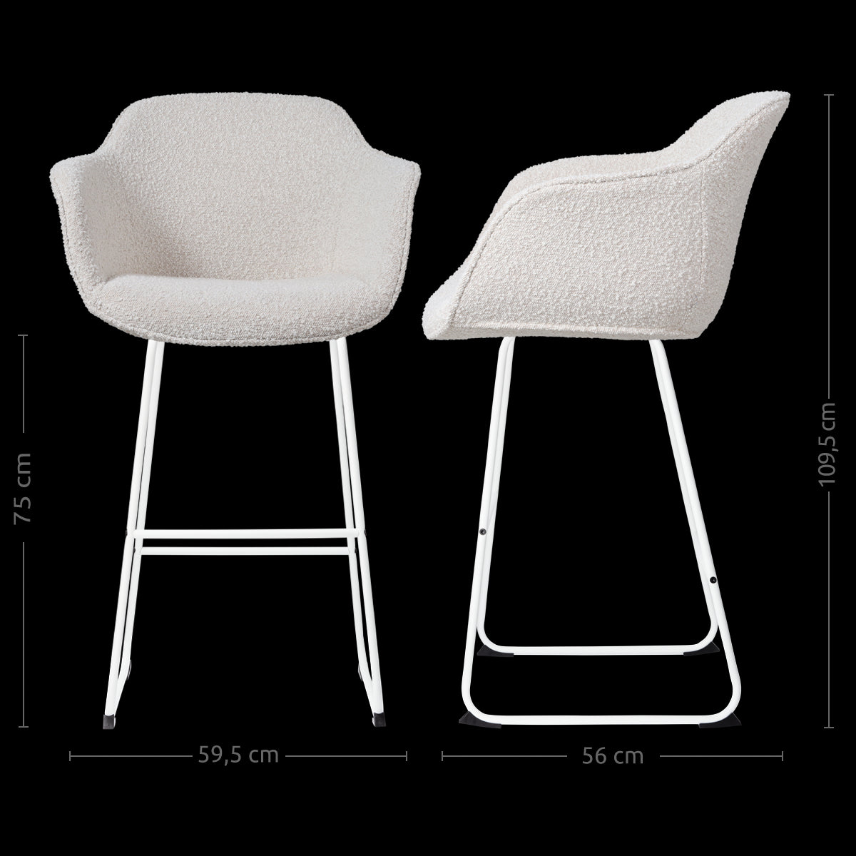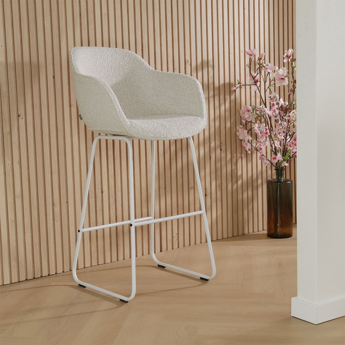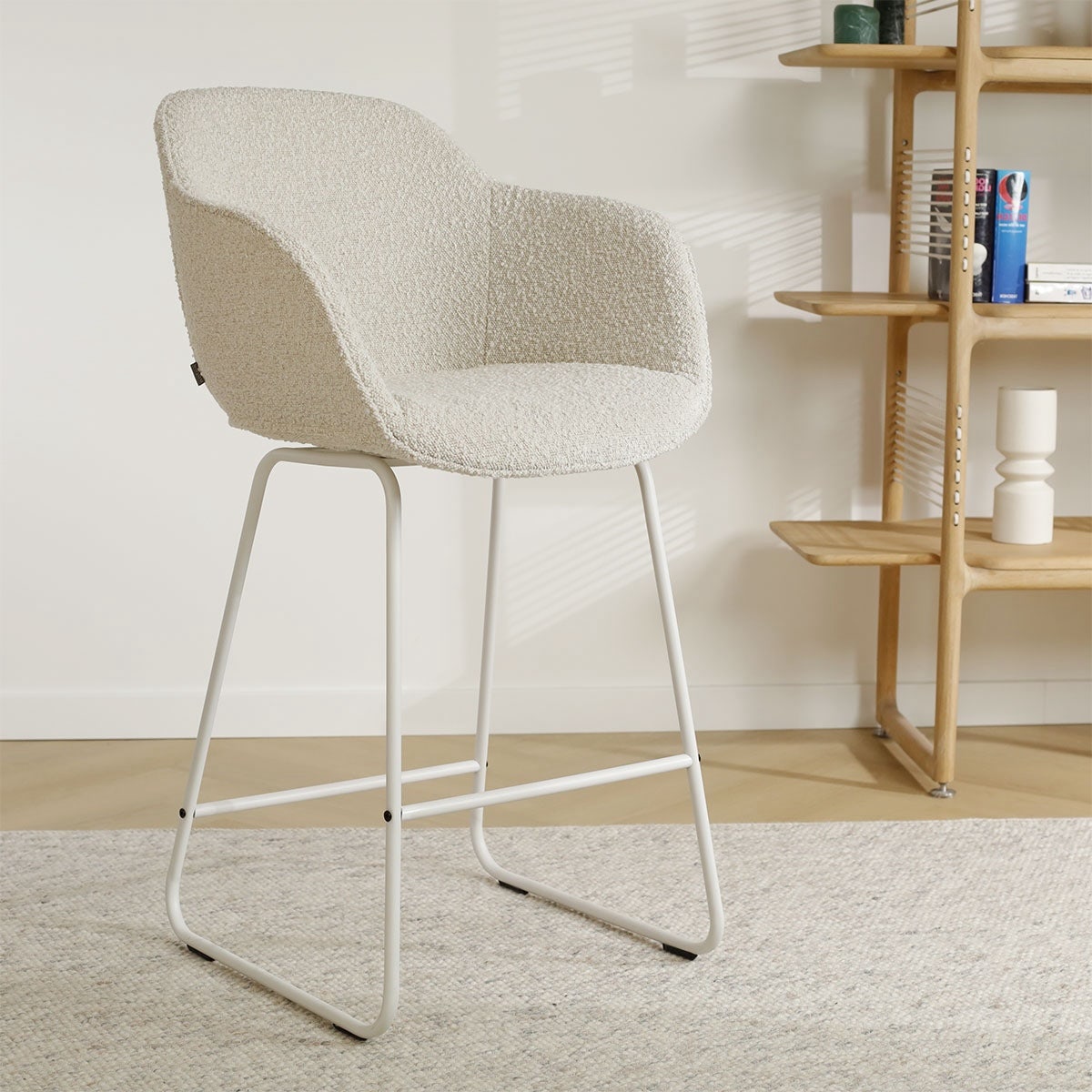 Het slanke metalen onderstel van deze hoge barkruk voegt een eigentijdse uitstraling toe aan het design en is verkrijgbaar in zowel zwart als wit. De gestoffeerde kuipzitting is voorzien van armleuningen voor ultiem comfort aan de bar, zodat je urenlang kan natafelen met vrienden en familie. De zachte bouclé stof zorgt voor veel sfeer en tovert iedere eethoek om tot een warme en gezellige plek. Met een zithoogte van 75 cm is deze barkruk geschikt om te gebruiken aan een hoge bar of eettafel. Ben je juist op zoek naar een lager model? De Nino-Mare kruk is verkrijgbaar in twee verschillende zithoogtes.