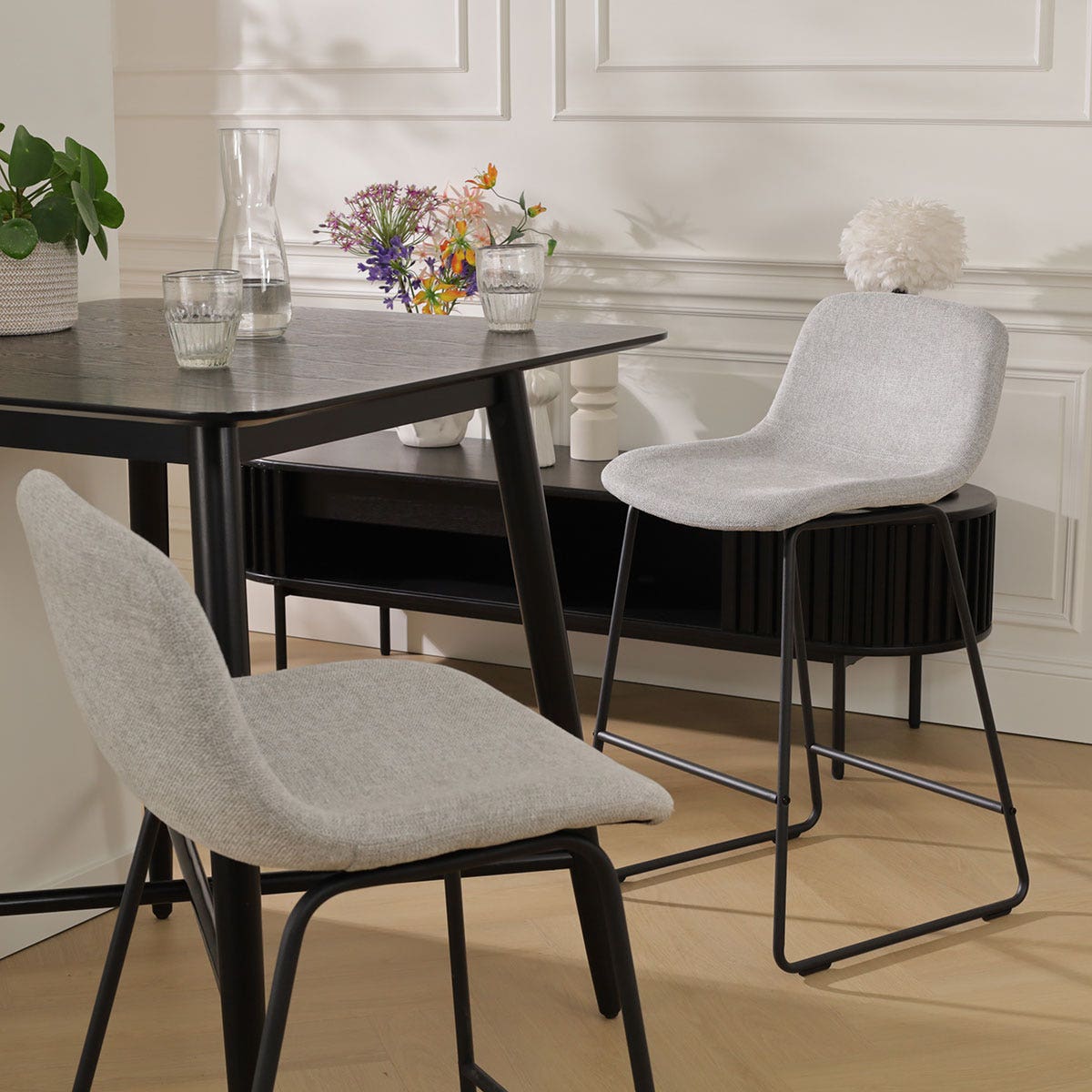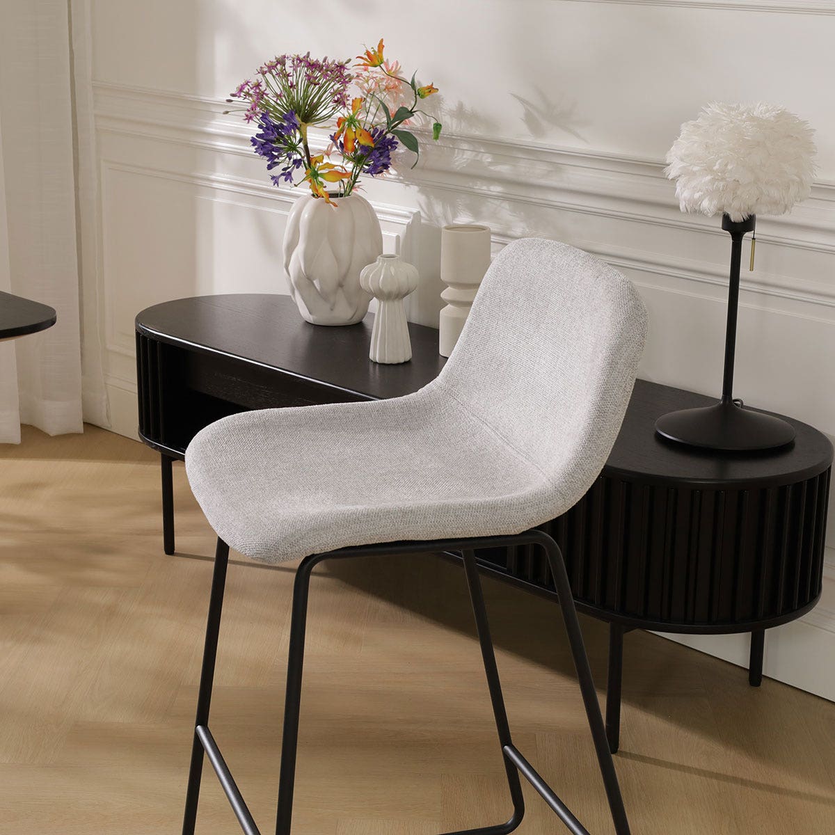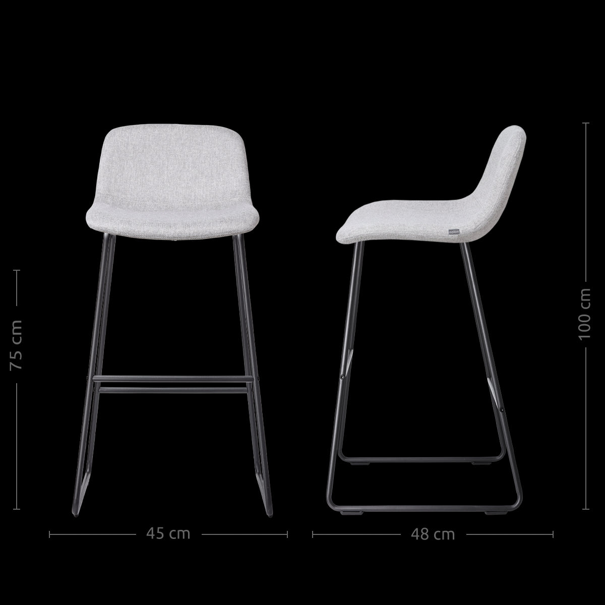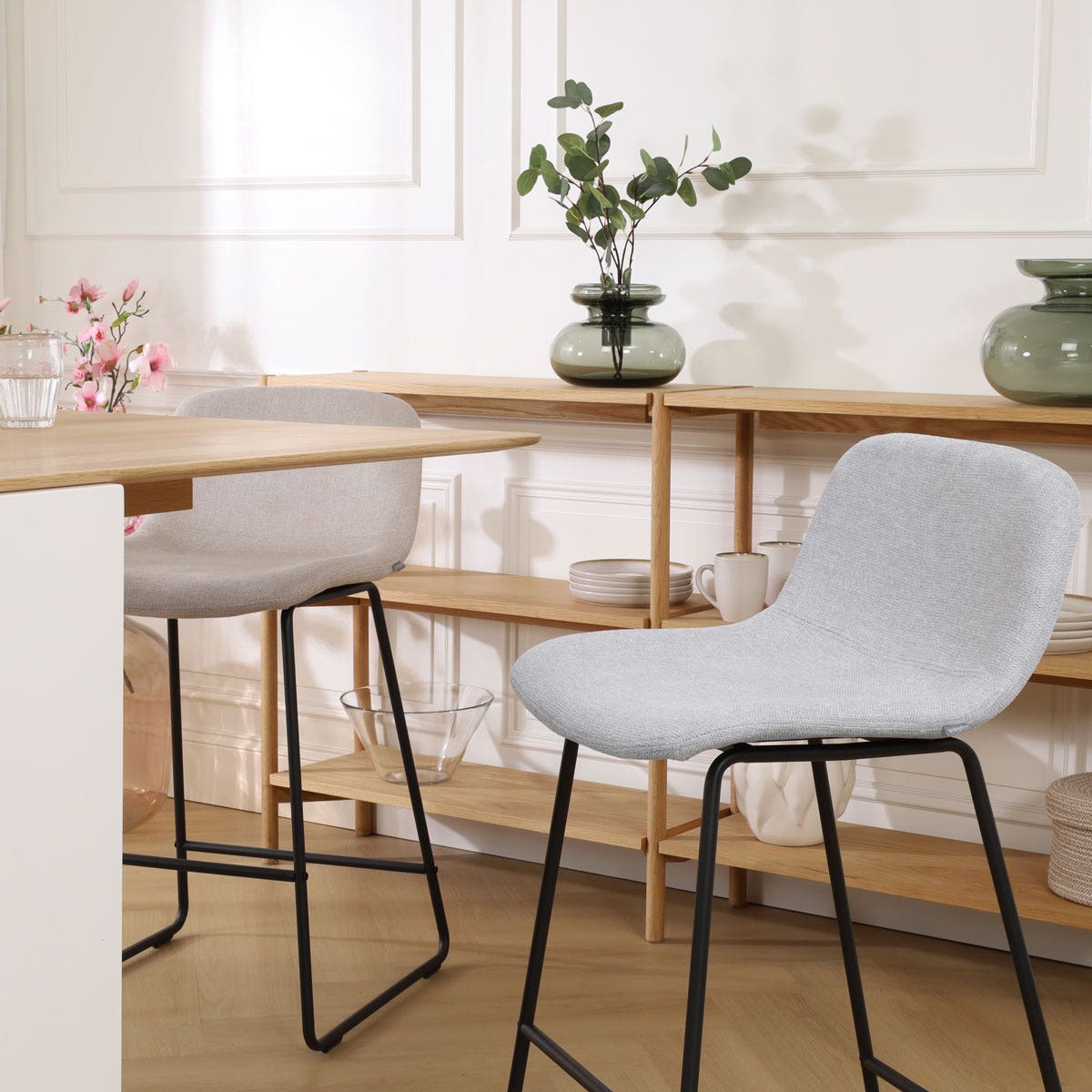 Deze barkruk combineert een strak en minimalistisch metalen onderstel met een gestoffeerde zitting. De zitting heeft een lage rugleuning, waardoor je een actieve zithouding hebt op deze barkruk en de kruk het uitzicht op de bar niet belemmert. Het design zonder armleuning maakt dat deze kruk onder elke tafel of bar past, en neemt ook nog eens minder ruimte in. De stijlvolle stoffen bekleding zorgt ervoor dat je lekker zacht zit en geeft de barkruk een warme uitstraling. Of je nu gaat voor een industriële look of een eigentijdse stijl in huis, de Nino-Mats barkruk is voor elk interieur een geschikte keuze. Dankzij de zithoogte van 76 cm past deze kruk perfect aan een bar of hoge eettafel. Heb je een lagere barkruk nodig? De Nino-Mats barkruk is ook verkrijgbaar in een variant voor aan het kookeiland.