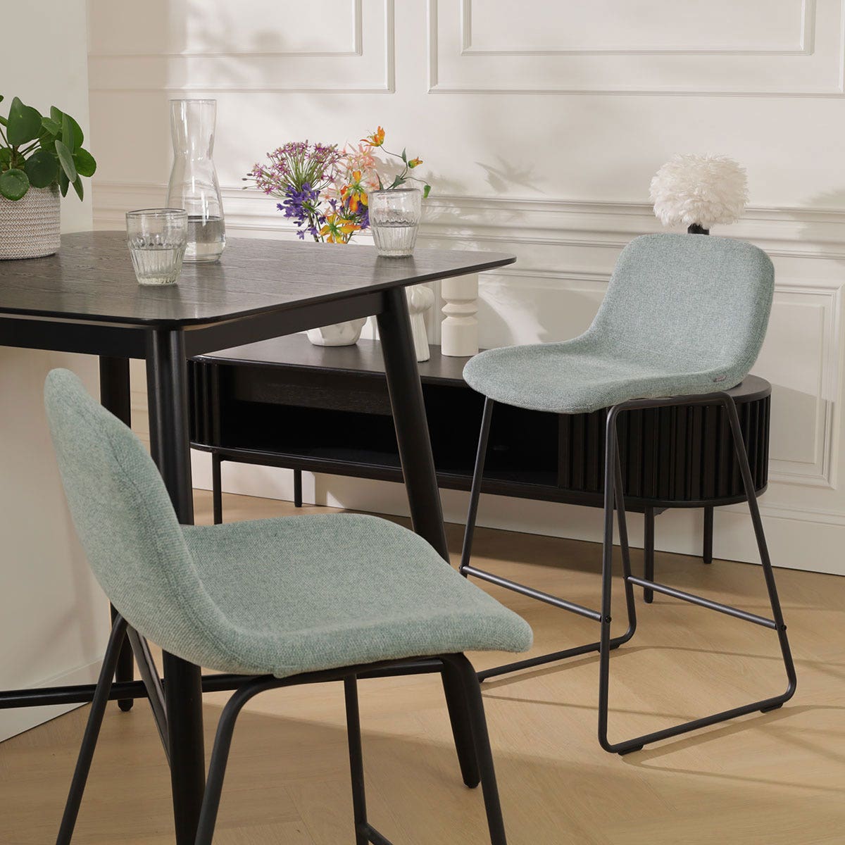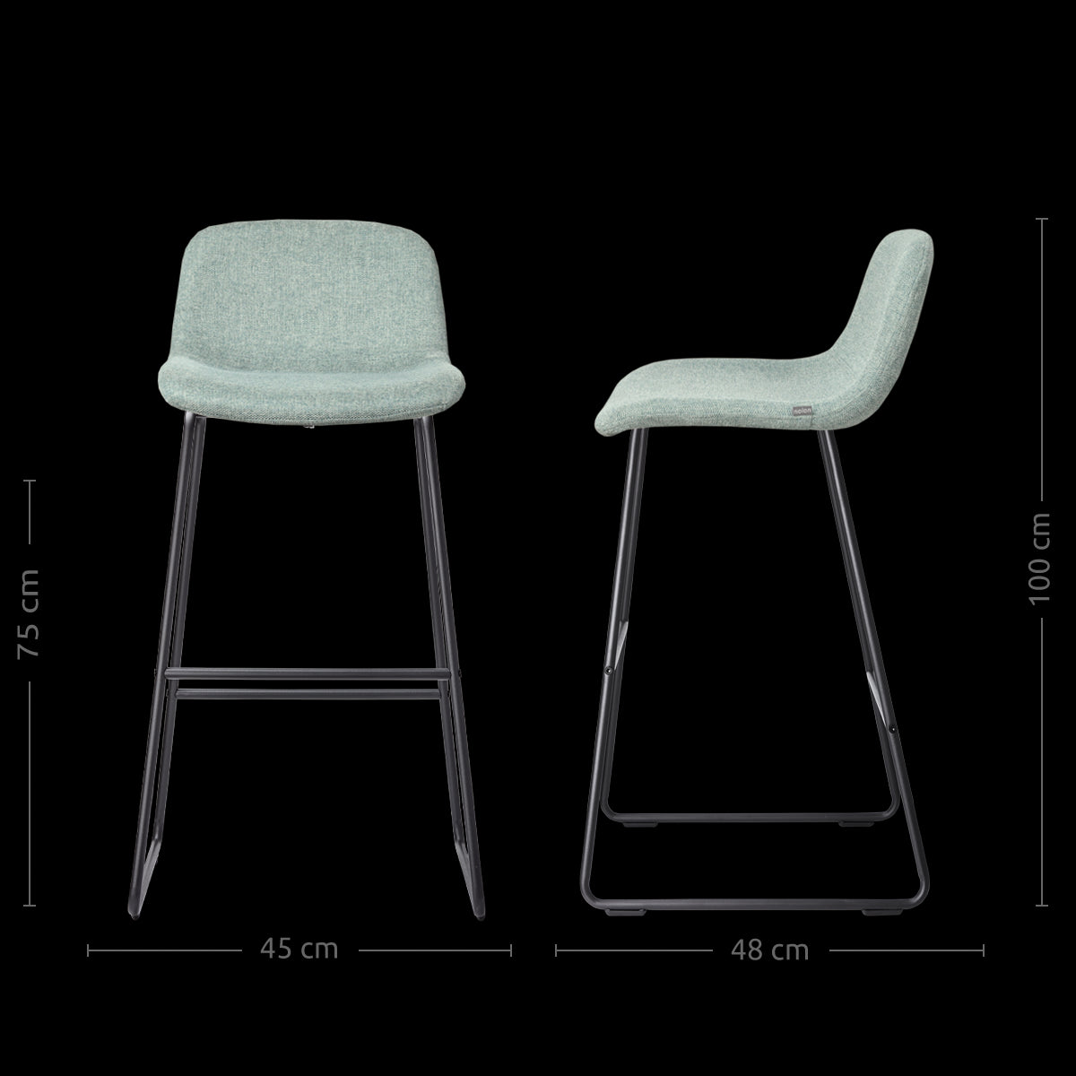 Deze barkruk combineert een strak en minimalistisch metalen onderstel met een gestoffeerde zitting. De zitting heeft een lage rugleuning, waardoor je een actieve zithouding hebt op deze barkruk en de kruk het uitzicht op de bar niet belemmert. Het design zonder armleuning maakt dat deze kruk onder elke tafel of bar past, en neemt ook nog eens minder ruimte in. De stijlvolle stoffen bekleding zorgt ervoor dat je lekker zacht zit en geeft de barkruk een warme uitstraling. Of je nu gaat voor een industriële look of een eigentijdse stijl in huis, de Nino-Mats barkruk is voor elk interieur een geschikte keuze. Dankzij de zithoogte van 76 cm past deze kruk perfect aan een bar of hoge eettafel. Heb je een lagere barkruk nodig? De Nino-Mats barkruk is ook verkrijgbaar in een variant voor aan het kookeiland.