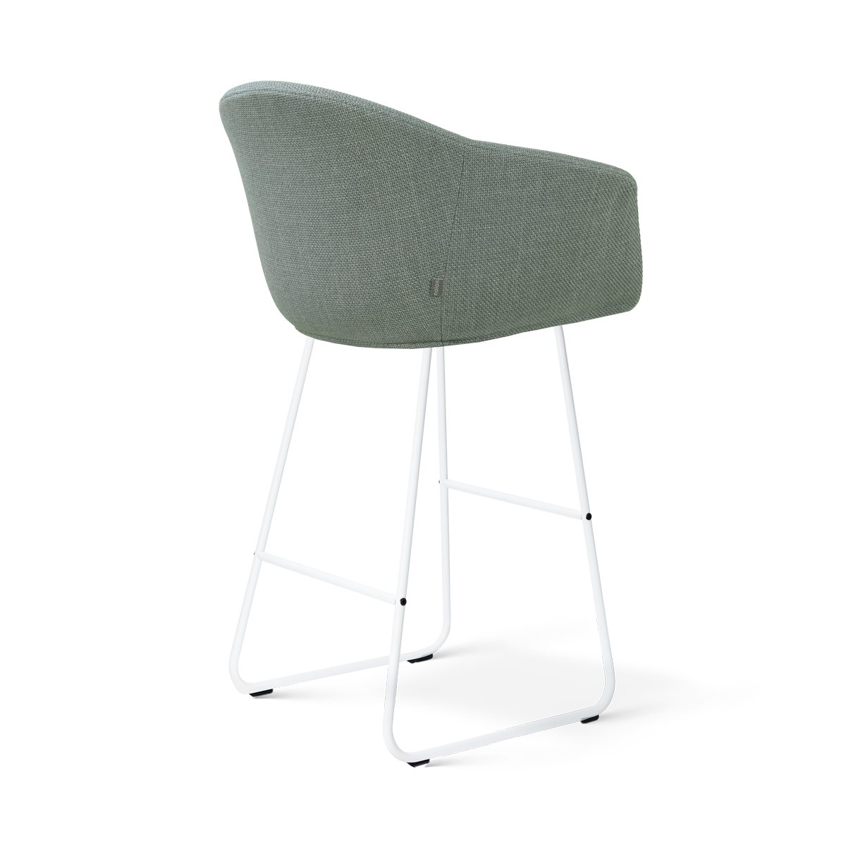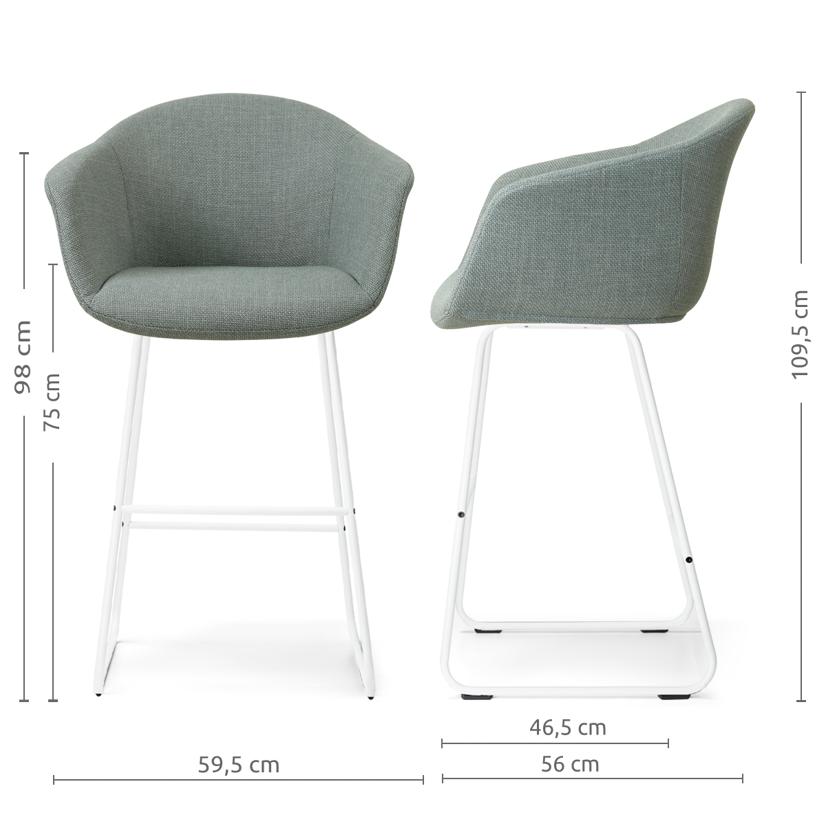 De Nino-Otis barkruk in saliegroene stof met witte poten combineert een levendige kleur met ultiem zitcomfort. De zachte zitting en oplopende armleuningen bieden een ergonomische en ontspannen zithouding. Het witte metalen frame met voetsteun geeft de barkruk een lichte, frisse uitstraling, ideaal voor een modern, Scandinavisch of Japandi interieur. Met een zithoogte van 75 cm is deze barkruk perfect voor hoge eettafels of bartafels met een bladhoogte tussen de 98 en 105 cm.