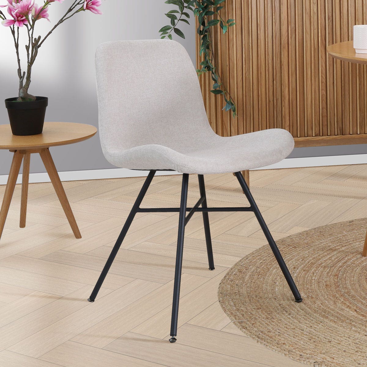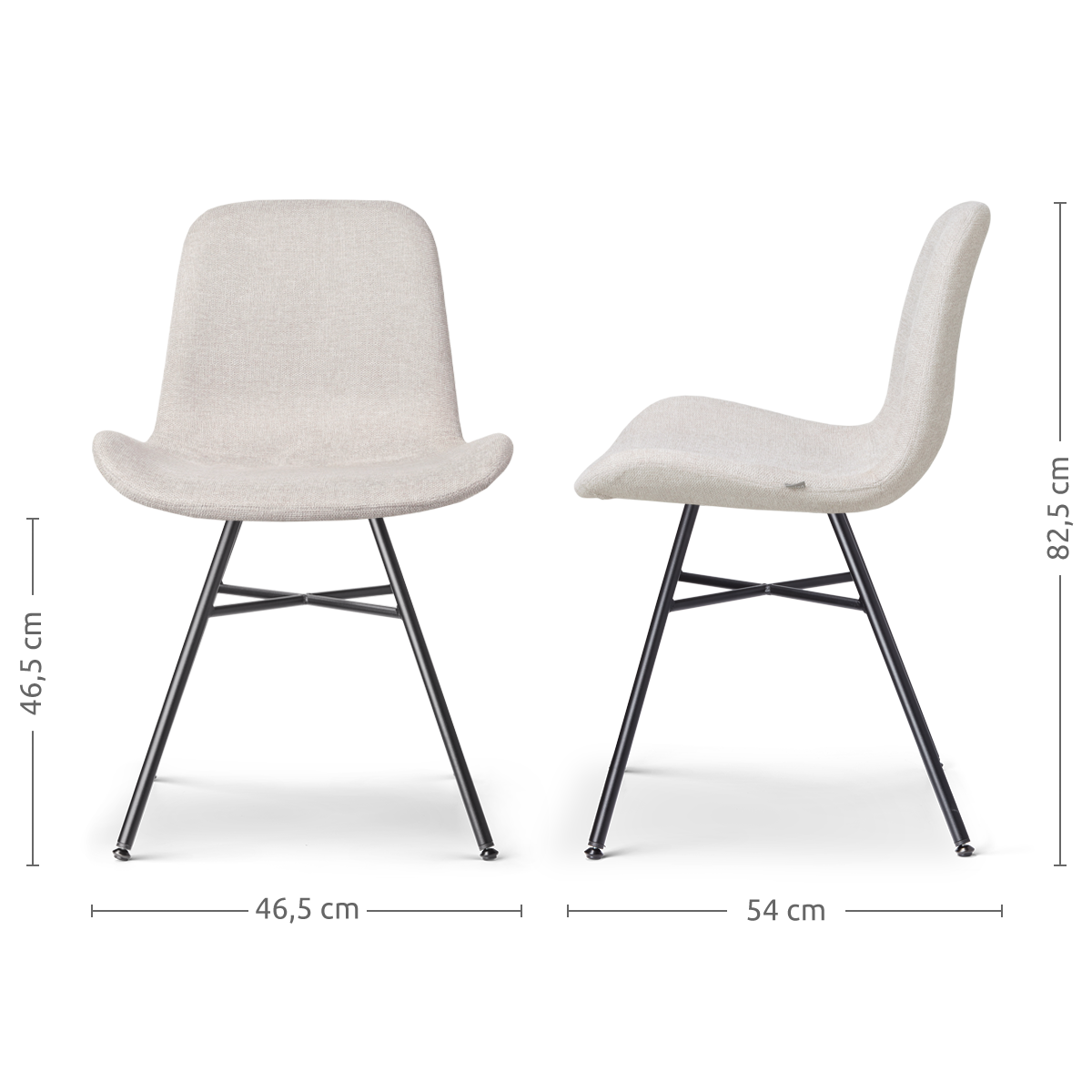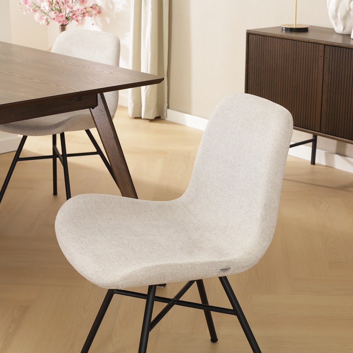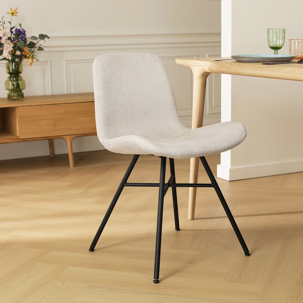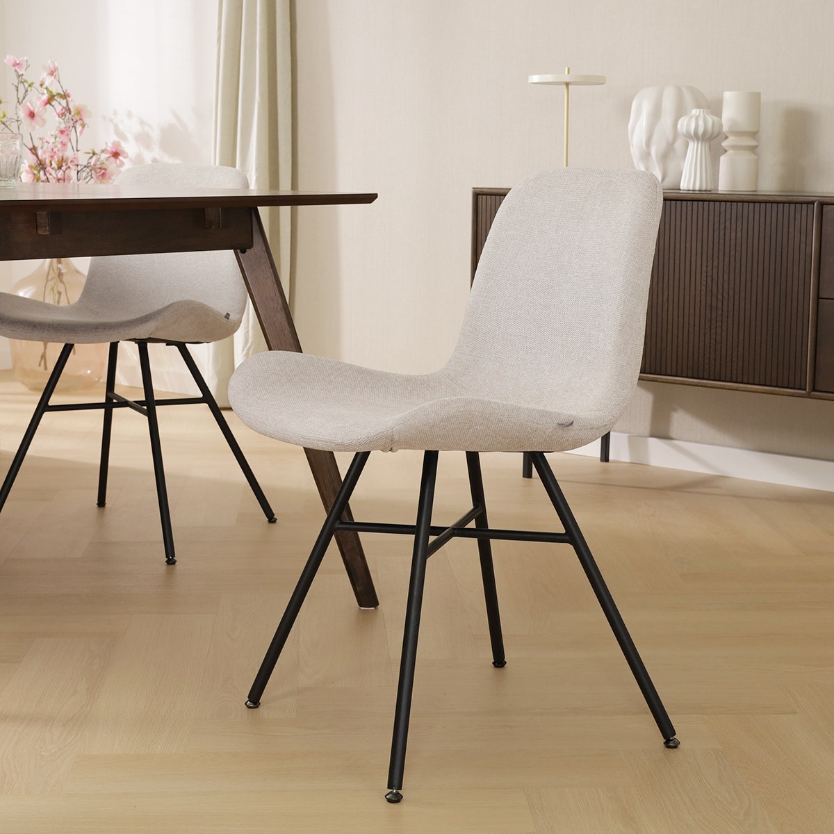 De zitting van deze eetkamerstoel heeft comfortabele rondingen en een gevleugeld zitvlak voor extra comfort. Het sterke houten binnenwerk zorgt voor een stevige zit en een actieve zithouding aan de eettafel. Het strakke, moderne onderstel is gemaakt van metaal en heeft een kruisverbinding tussen de poten. De voetpootjes aan het einde van de poten zijn verstelbaar zodat de stoel op elke ondergrond stevig staat. De Noa-Fé eetkamerstoel is bekleed met zachte, hoogwaardige stof en is verkrijgbaar in maar liefst zeven verschillende kleuren en materialen. Of je nu op zoek bent naar een tijdloze beige eetkamerstoel of een trendy exemplaar met bouclé of teddystof, de Noa-Fé stoel is altijd een goede keuze.