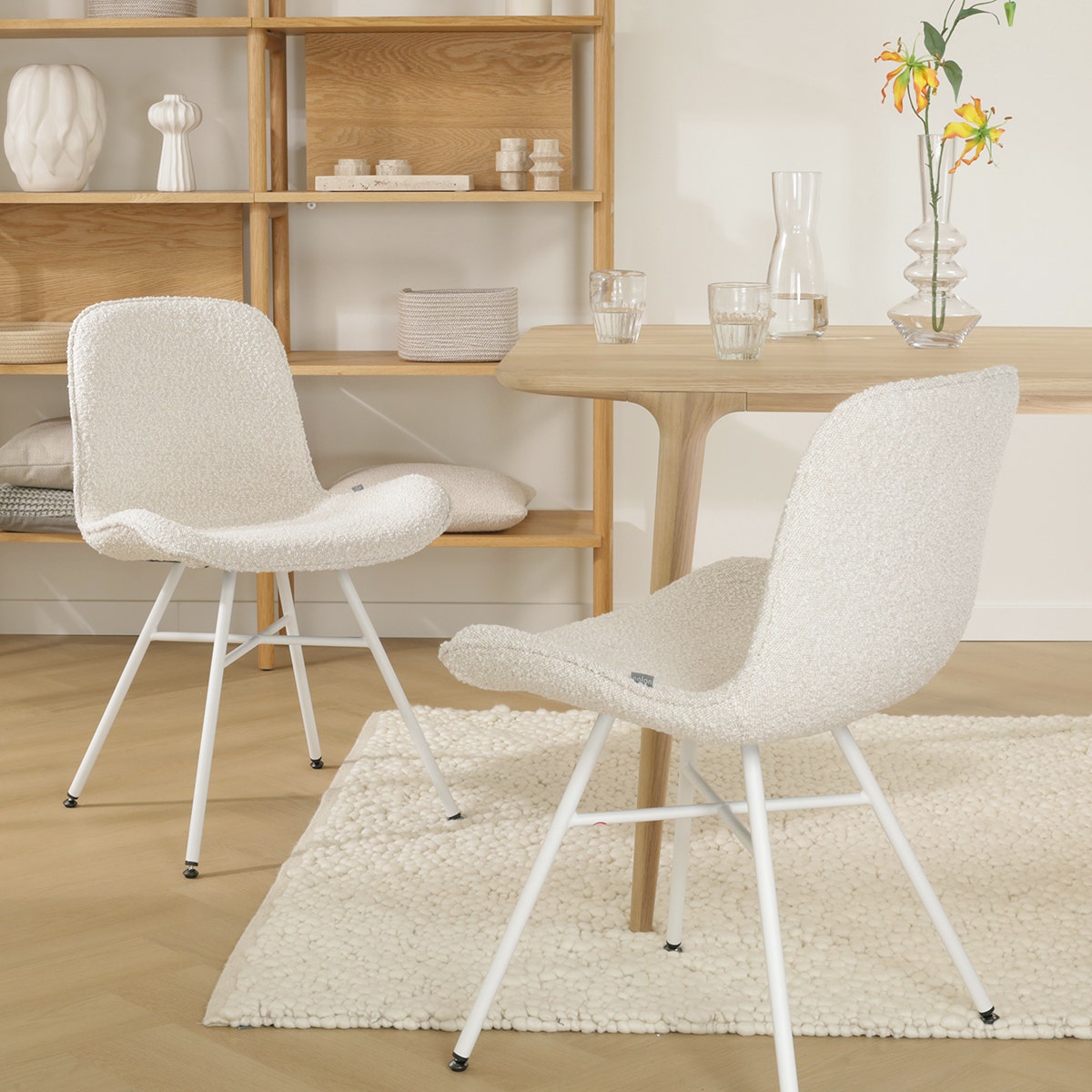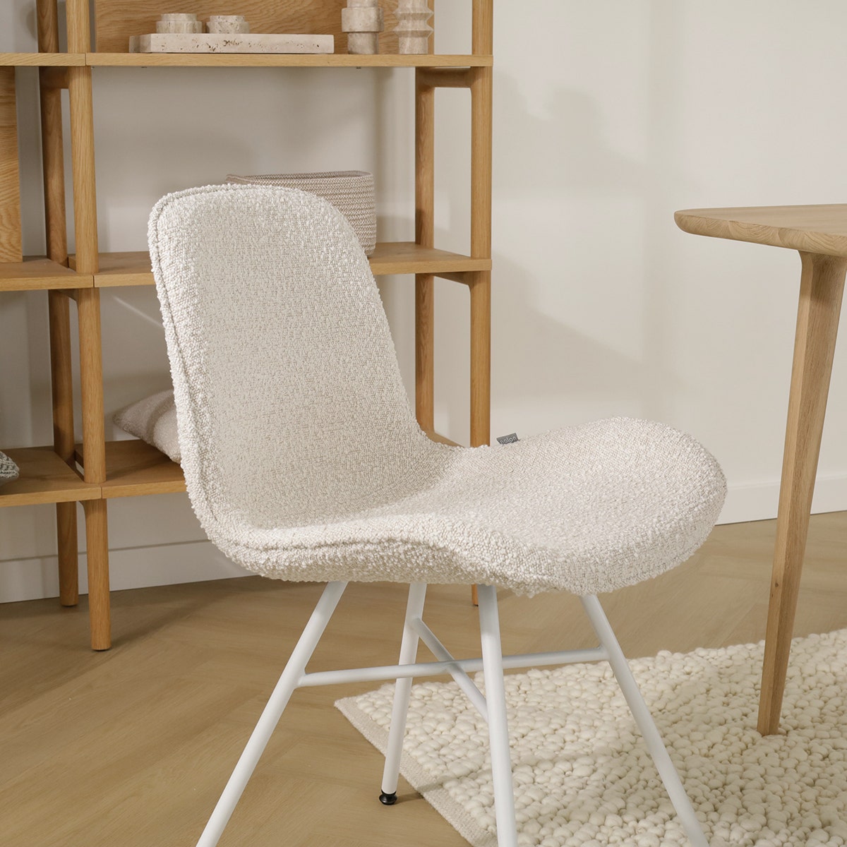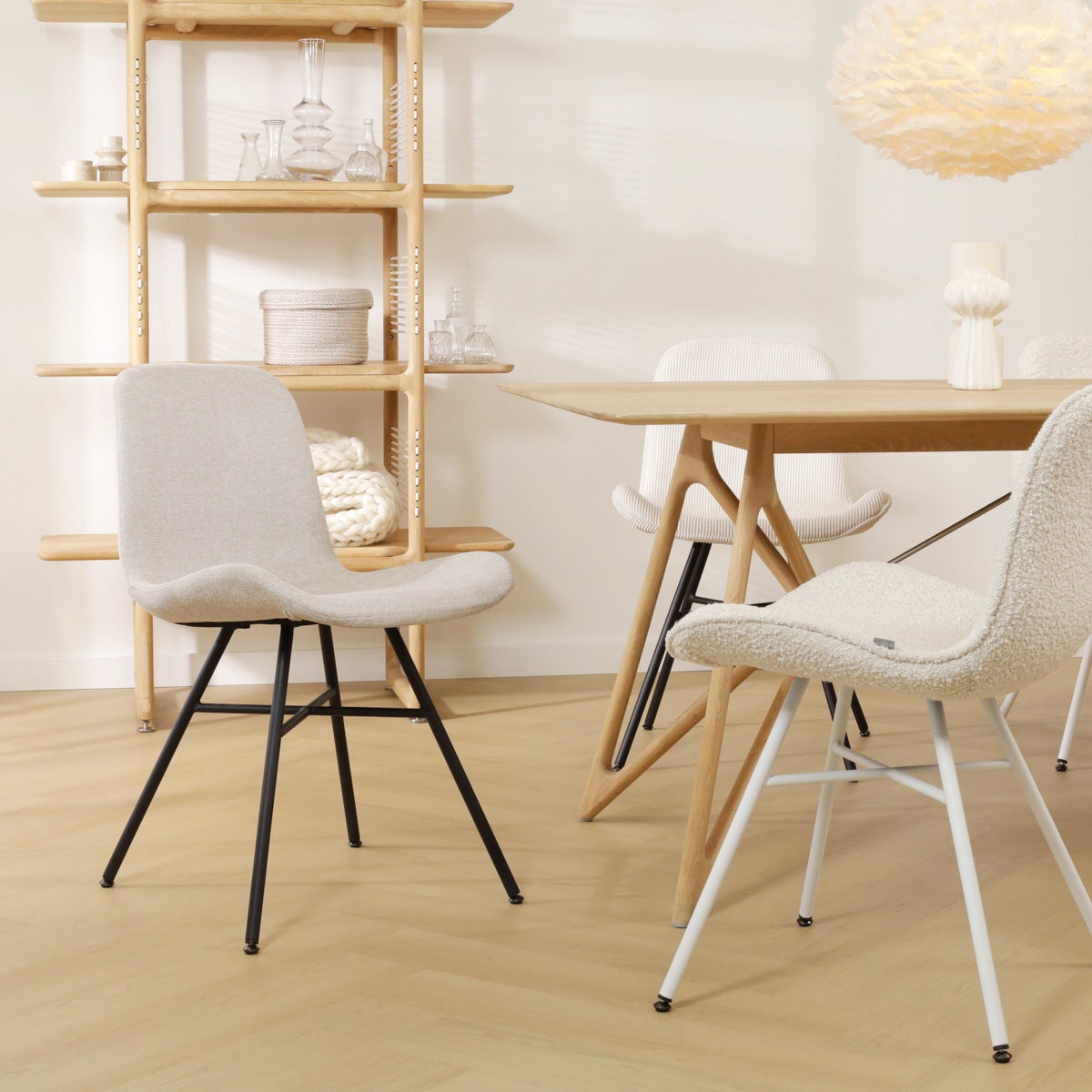 De zitting van deze eetkamerstoel heeft comfortabele rondingen en een gevleugeld zitvlak voor extra comfort. Het sterke houten binnenwerk zorgt voor een stevige zit en een actieve zithouding aan de eettafel. Het strakke, moderne onderstel is gemaakt van metaal en heeft een kruisverbinding tussen de poten. De voetpootjes aan het einde van de poten zijn verstelbaar zodat de stoel op elke ondergrond stevig staat. De Noa-Fé eetkamerstoel is bekleed met zachte, hoogwaardige stof en is verkrijgbaar in maar liefst zeven verschillende kleuren en materialen. Of je nu op zoek bent naar een tijdloze beige eetkamerstoel of een trendy exemplaar met bouclé of teddystof, de Noa-Fé stoel is altijd een goede keuze.