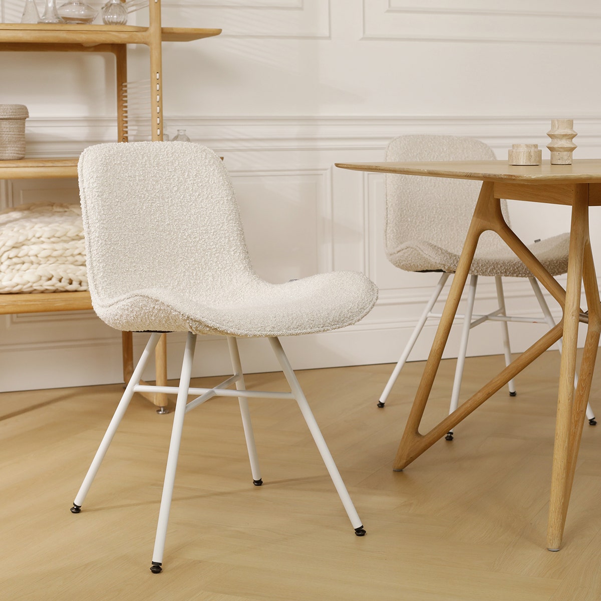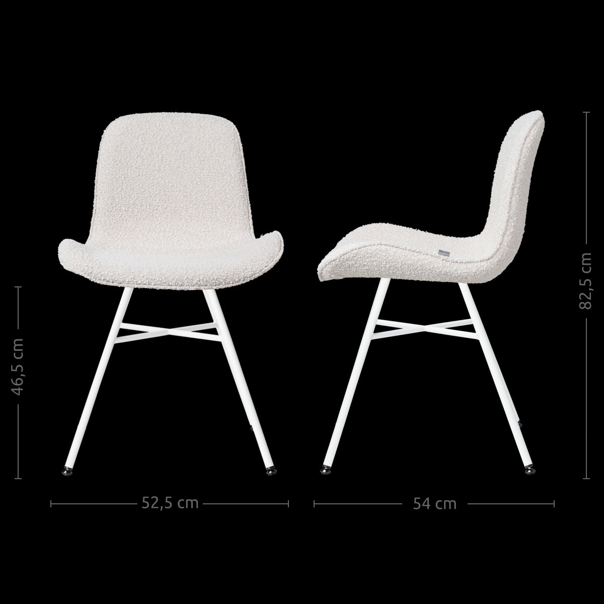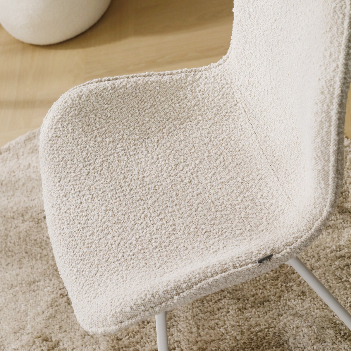 De zitting van deze eetkamerstoel heeft comfortabele rondingen en een gevleugeld zitvlak voor extra comfort. Het sterke houten binnenwerk zorgt voor een stevige zit en een actieve zithouding aan de eettafel. Het strakke, moderne onderstel is gemaakt van metaal en heeft een kruisverbinding tussen de poten. De voetpootjes aan het einde van de poten zijn verstelbaar zodat de stoel op elke ondergrond stevig staat. De Noa-Fé eetkamerstoel is bekleed met zachte, hoogwaardige stof en is verkrijgbaar in maar liefst zeven verschillende kleuren en materialen. Of je nu op zoek bent naar een tijdloze beige eetkamerstoel of een trendy exemplaar met bouclé of teddystof, de Noa-Fé stoel is altijd een goede keuze.