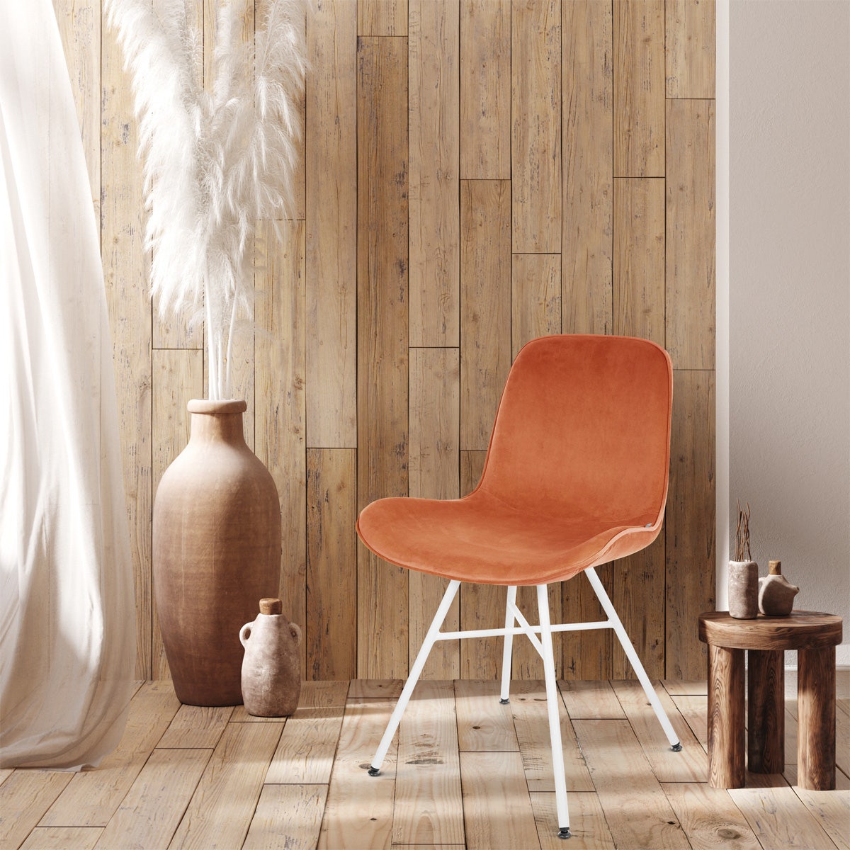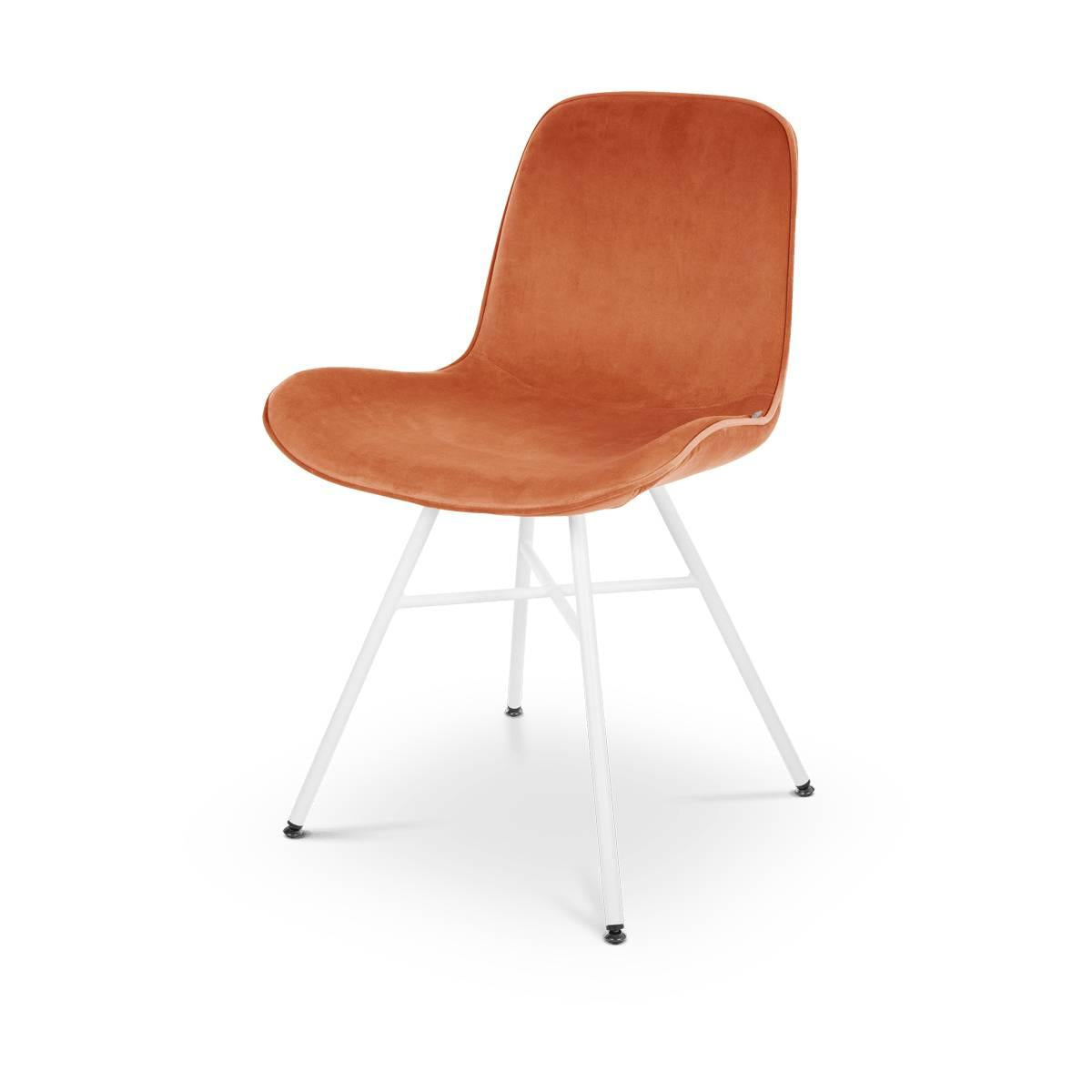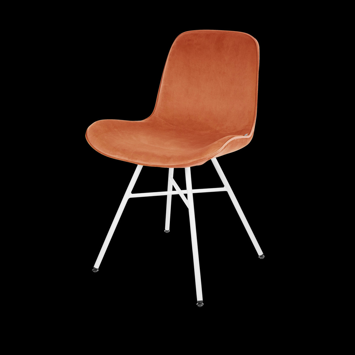 De zitting is gestoffeerd met velvet bekleding en heeft daarom een zachte uitstraling. Bovendien heeft de zitting comfortabele rondingen en korte opstaande leuningen, voor nog meer comfort. De eetkamerstoel is afgewerkt met een wit metalen onderstel en een leuk detail is het kruis in het midden. Kortom, zoek je een comfortabele eetkamerstoel waar je niet meer uit wilt? Dan is deze stoel wellicht iets voor jou!