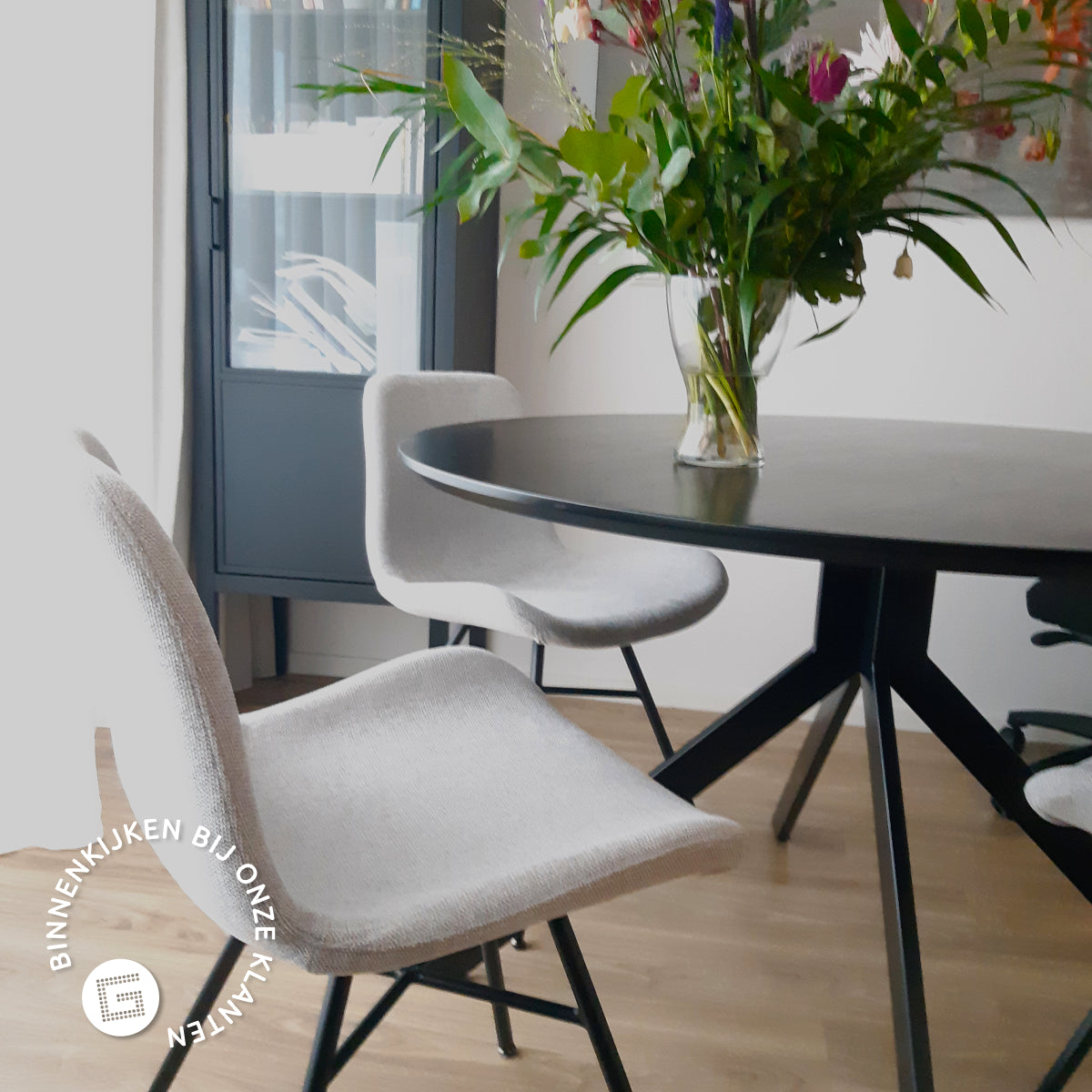 - De stoffen bekleding zorgt voor een warme sfeer in de eethoek