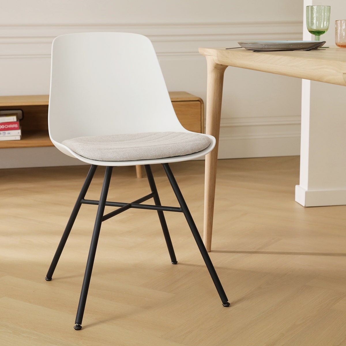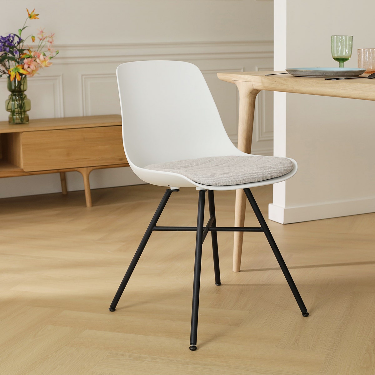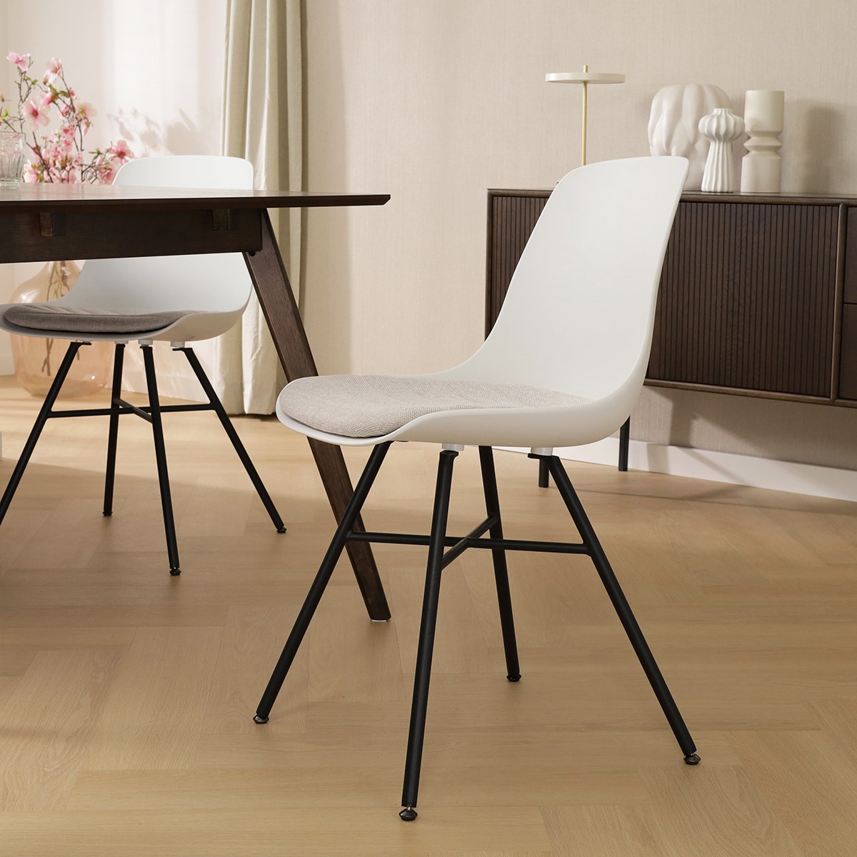 Deze stijlvolle eetkamerstoel heeft een metalen frame met kruisverbinding tussen de poten en verstelbare voetpootjes, zodat de stoel op elke ondergrond stabiel staat. De zitting is gemaakt van hoogwaardig kunststof om de stoel een moderne uitstraling en een onderhoudsvriendelijk en duurzaam karakter te geven. Het leuke aan deze eetkamerstoel is dat je zelf kan bepalen hoe de stoel eruit komt de zien. Je kan namelijk kiezen uit een wit en zwart onderstel, een witte en zwarte kunststof kuip én een vast zitkussen in vijf verschillende kleuren. Zo kan je de Noa-Liv eetkamerstoel helemaal aanpassen aan jouw wensen en eethoek!