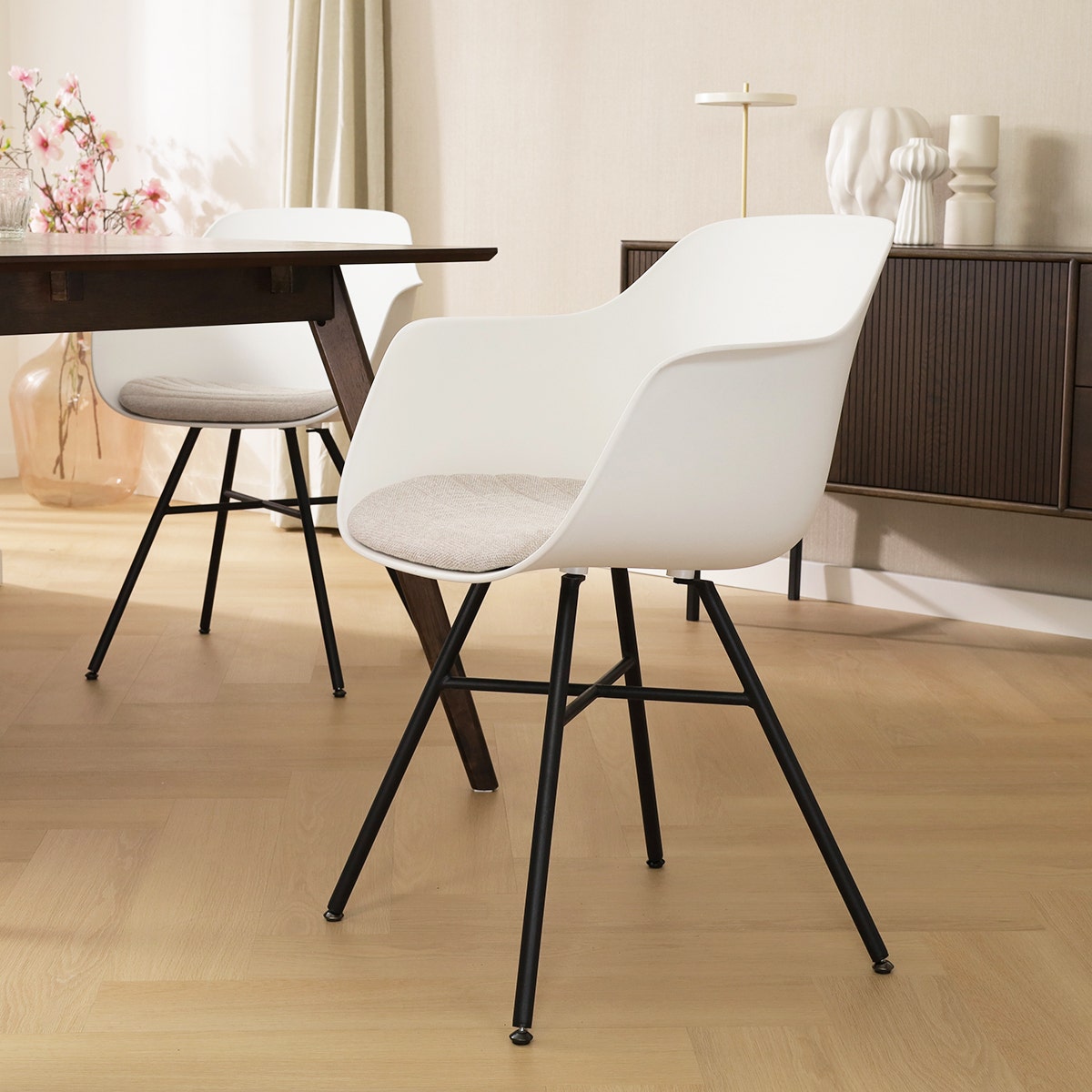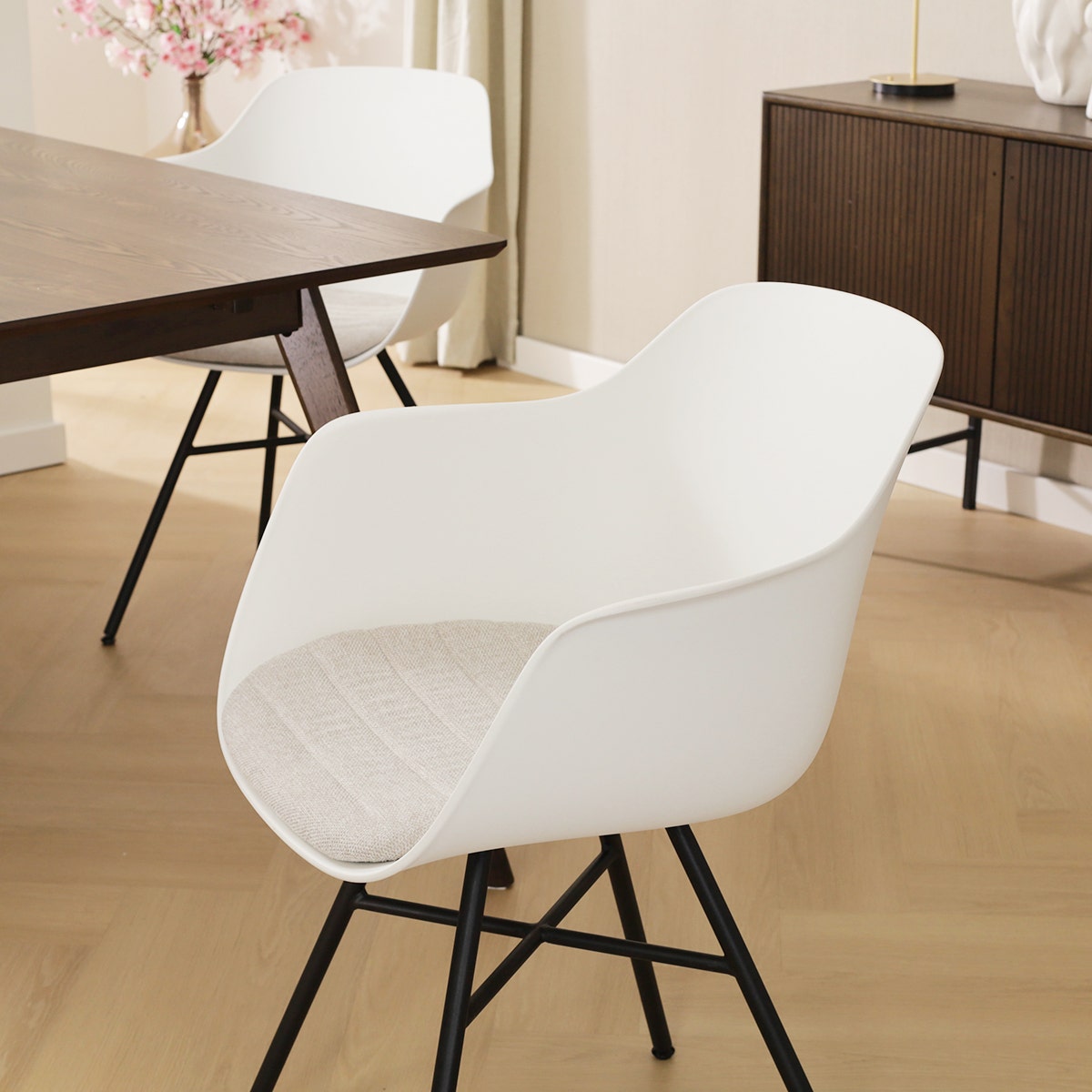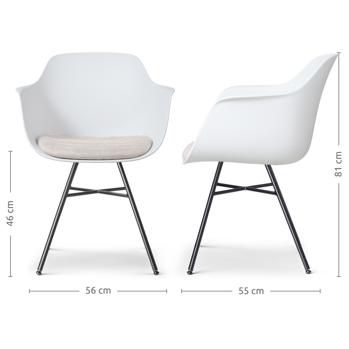 Het leuke is dat je deze stoel zelf kunt samenstellen. Je kunt namelijk kiezen uit meerdere kleuren vaste zitkussens om jouw perfecte kuipstoel samen te stellen. Hierdoor creëer je een frisse uitstraling in je interieur. Bovendien heeft de zitting armleuningen die jouw extra comfort bieden. De eetkamerstoel is afgewerkt met een metalen onderstel met een kruis in het midden als leuk detail. Zie jij jezelf al genieten in deze comfortabele eetkamerstoel?