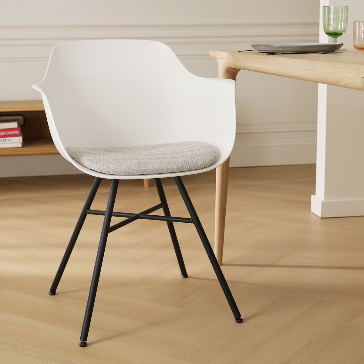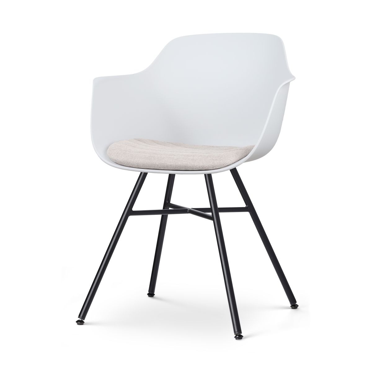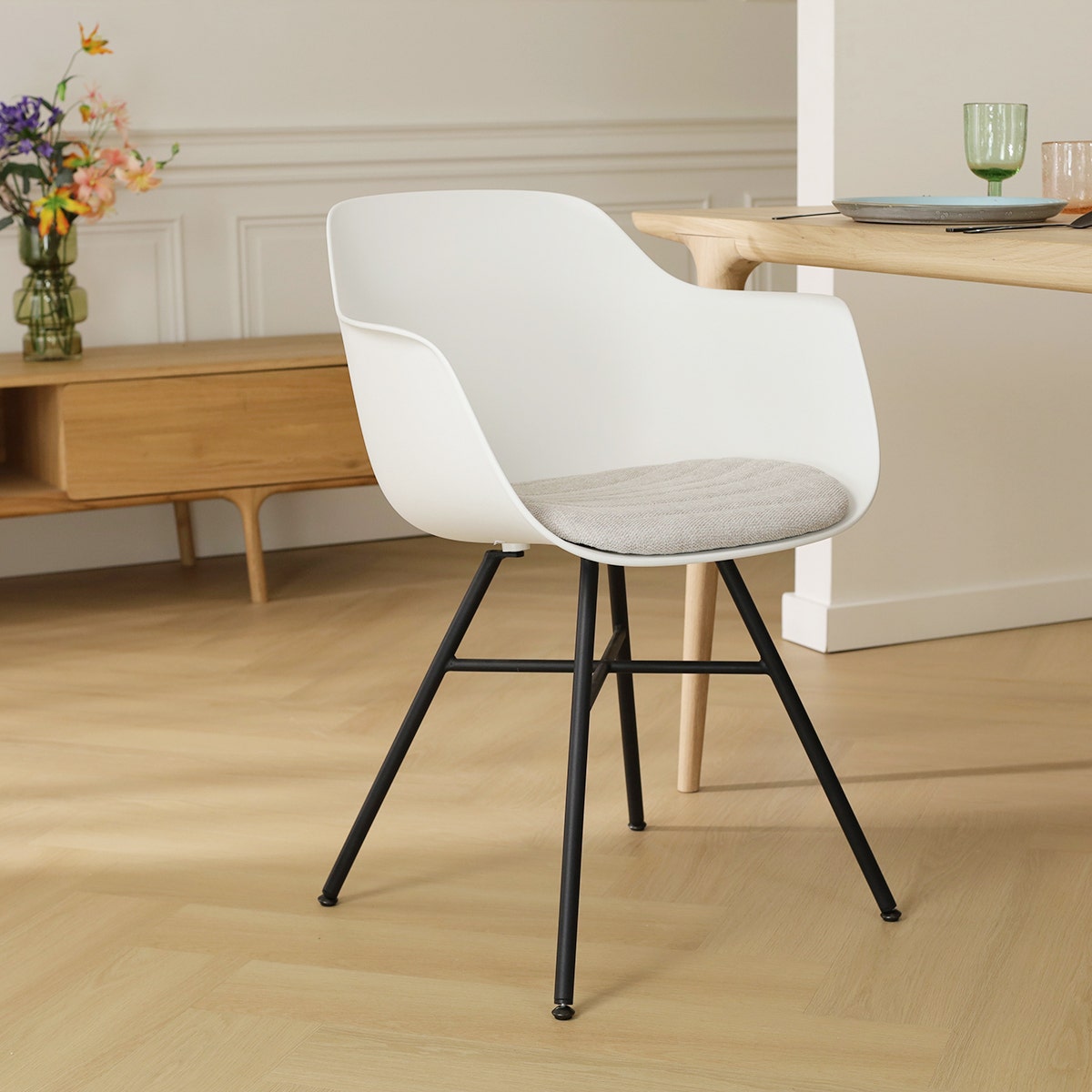Het leuke is dat je deze stoel zelf kunt samenstellen. Je kunt namelijk kiezen uit meerdere kleuren vaste zitkussens om jouw perfecte kuipstoel samen te stellen. Hierdoor creëer je een frisse uitstraling in je interieur. Bovendien heeft de zitting armleuningen die jouw extra comfort bieden. De eetkamerstoel is afgewerkt met een metalen onderstel met een kruis in het midden als leuk detail. Zie jij jezelf al genieten in deze comfortabele eetkamerstoel?