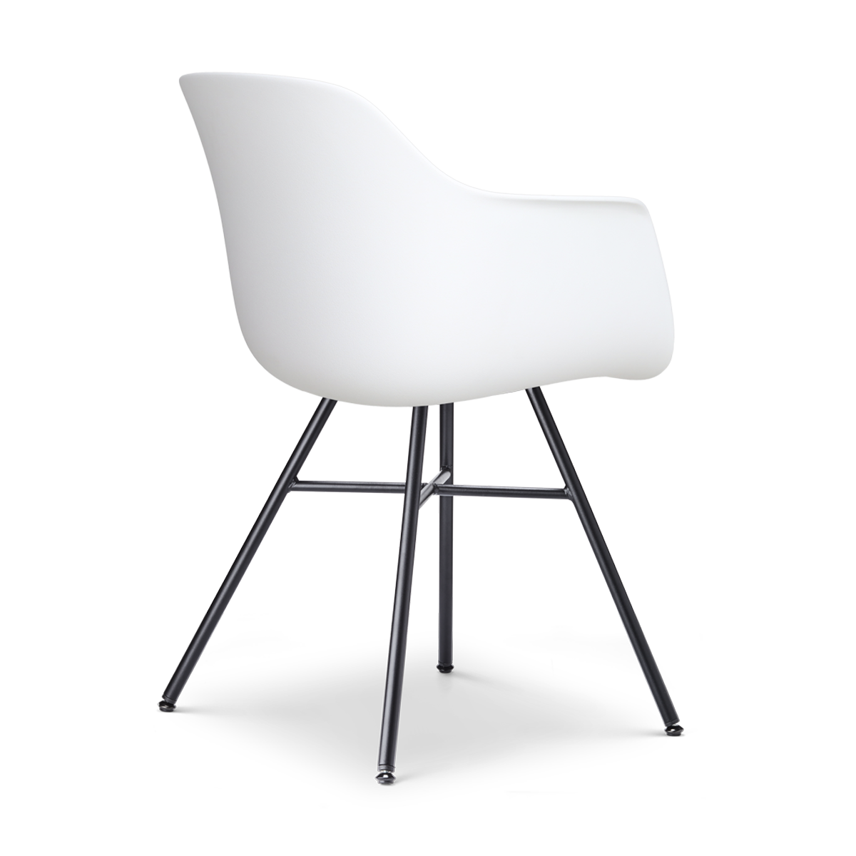 - De stoel is afgewerkt met een zwart metalen onderstel met een kruis als detail