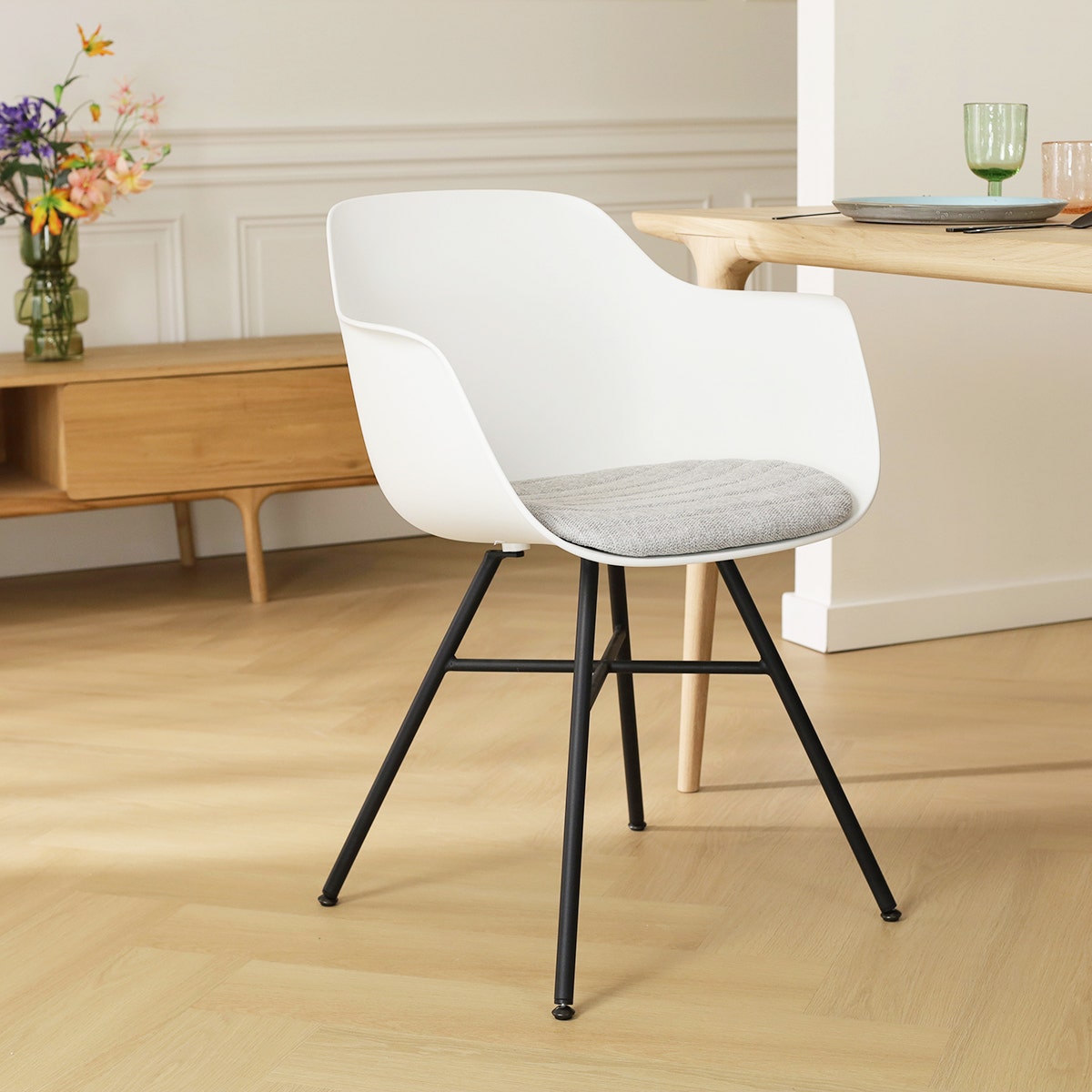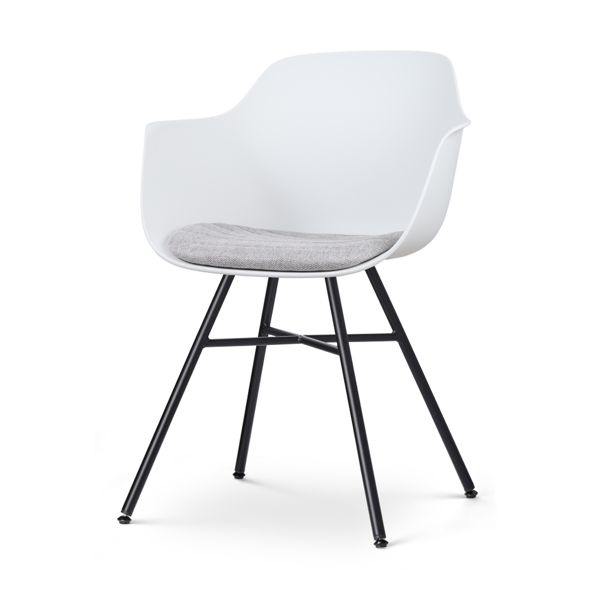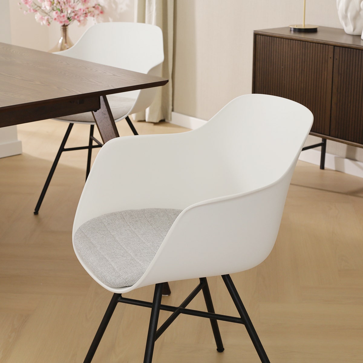 Het leuke is dat je deze stoel zelf kunt samenstellen. Je kunt namelijk kiezen uit meerdere kleuren vaste zitkussens om jouw perfecte kuipstoel samen te stellen. Hierdoor creëer je een frisse uitstraling in je interieur. Bovendien heeft de zitting armleuningen die jouw extra comfort bieden. De eetkamerstoel is afgewerkt met een metalen onderstel met een kruis in het midden als leuk detail. Zie jij jezelf al genieten in deze comfortabele eetkamerstoel?