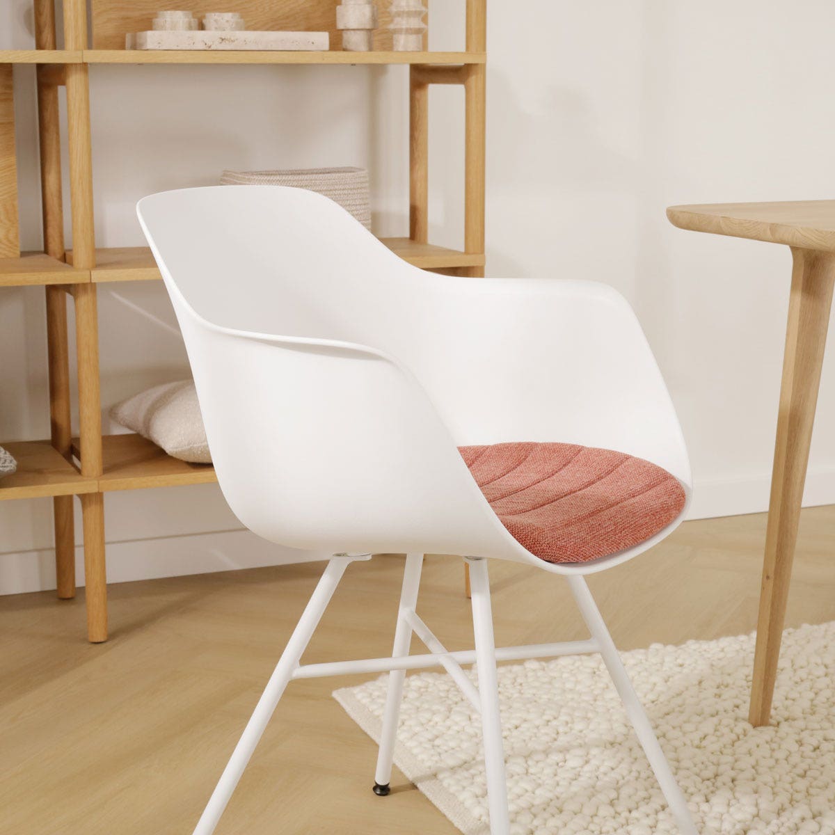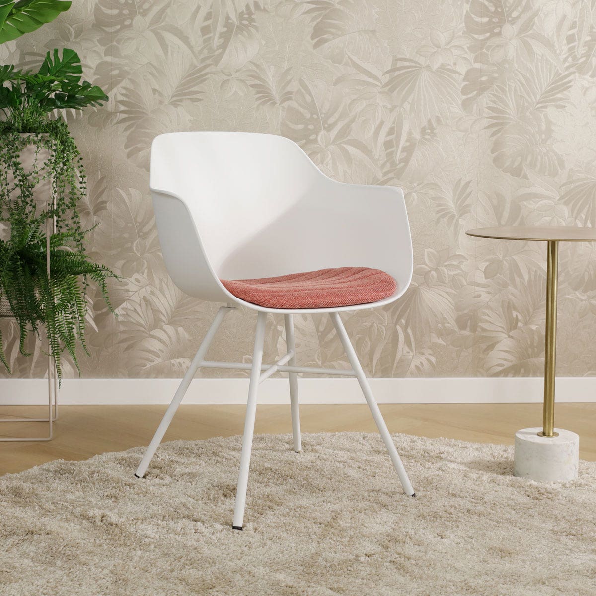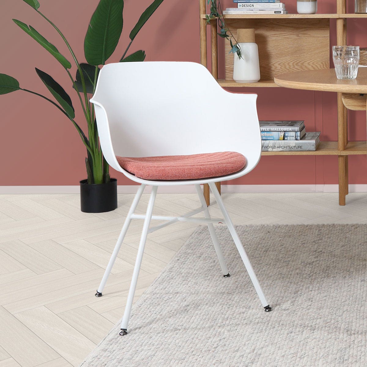 Het leuke is dat je deze stoel zelf kunt samenstellen. Je kunt namelijk kiezen uit meerdere kleuren vaste zitkussens om jouw perfecte kuipstoel samen te stellen. Hierdoor creëer je een frisse uitstraling in je interieur. Bovendien heeft de zitting armleuningen die jouw extra comfort bieden. De eetkamerstoel is afgewerkt met een metalen onderstel met een kruis in het midden als leuk detail. Zie jij jezelf al genieten in deze comfortabele eetkamerstoel?