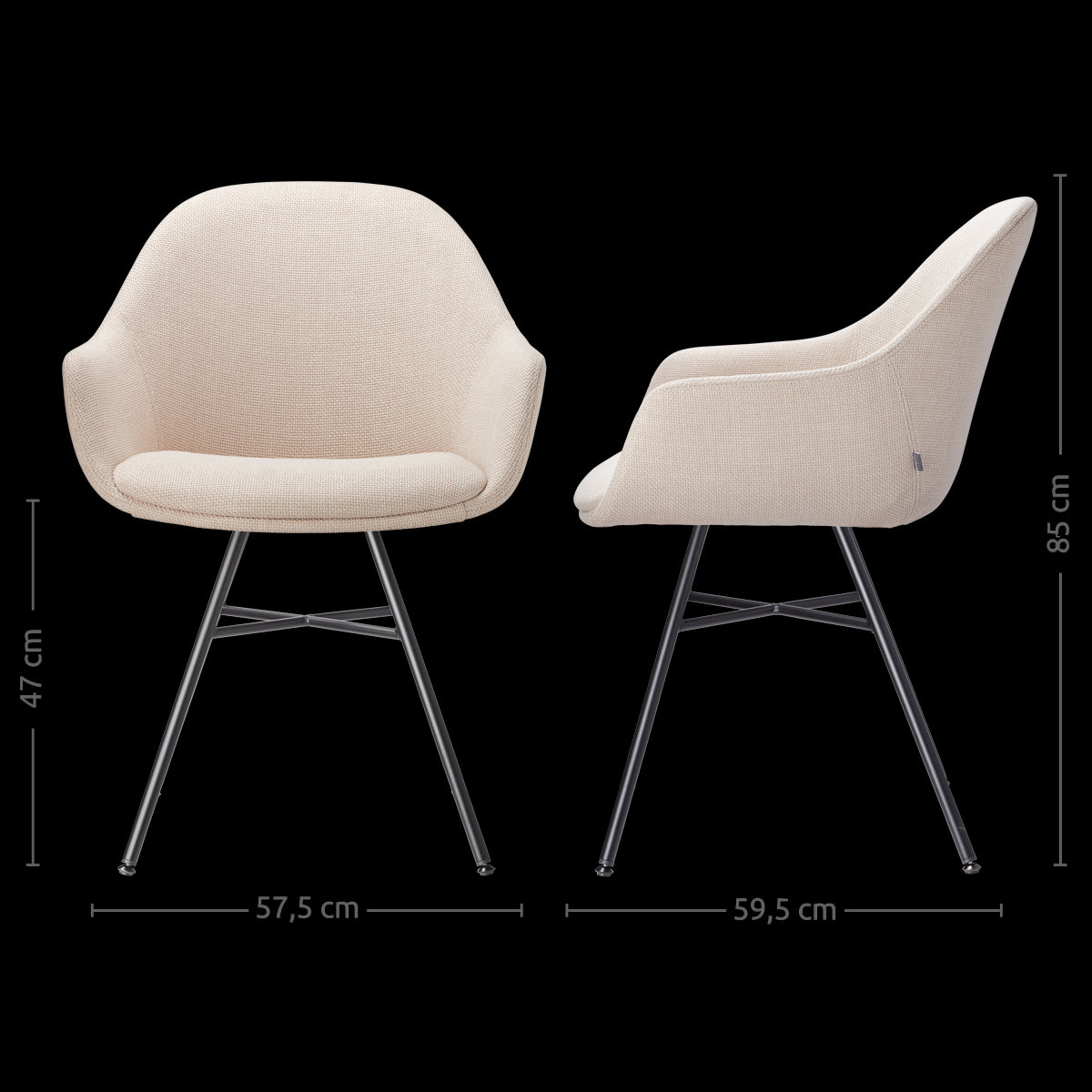 Deze stoffen eetkamerstoel heeft een moderne en stijlvolle uitstraling dankzij de strakke lijnen van het onderstel en de subtiele rondingen van de zitting. Het zwarte metalen onderstel met kruisverbinding zorgt voor een stabiele zit en laat de eetkamerstoel tegelijkertijd modern ogen. De verstelbare voetpootjes zorgen ervoor dat de eetkamerstoel stevig op elke ondergrond staat. Dankzij de schuin aflopende armleuningen van de stoel kan je een fijne ontspannen zithouding aannemen, terwijl ook de zachte bekleding zorgt voor extra zitgemak. Naast beige en taupe bouclé stof is deze eetkamerstoel verkrijgbaar in een luxe stoffen bekleding in de kleur beige. Met deze kleuropties breng je met de Noa-Mae eetkamerstoel in ieder geval een warme sfeer naar de eetkamer.