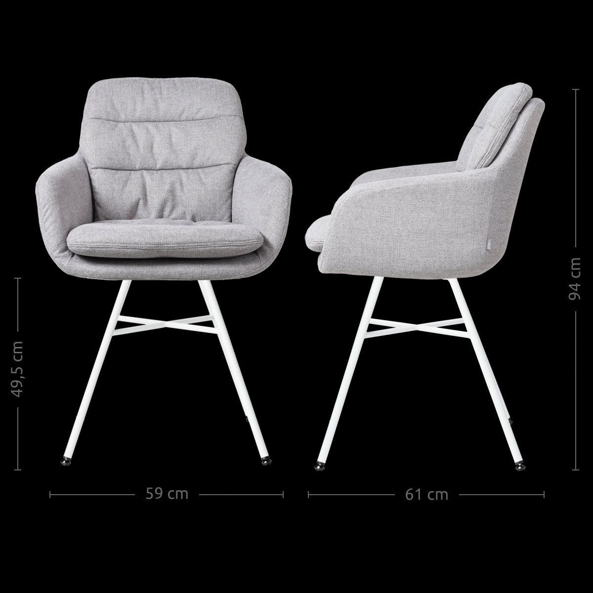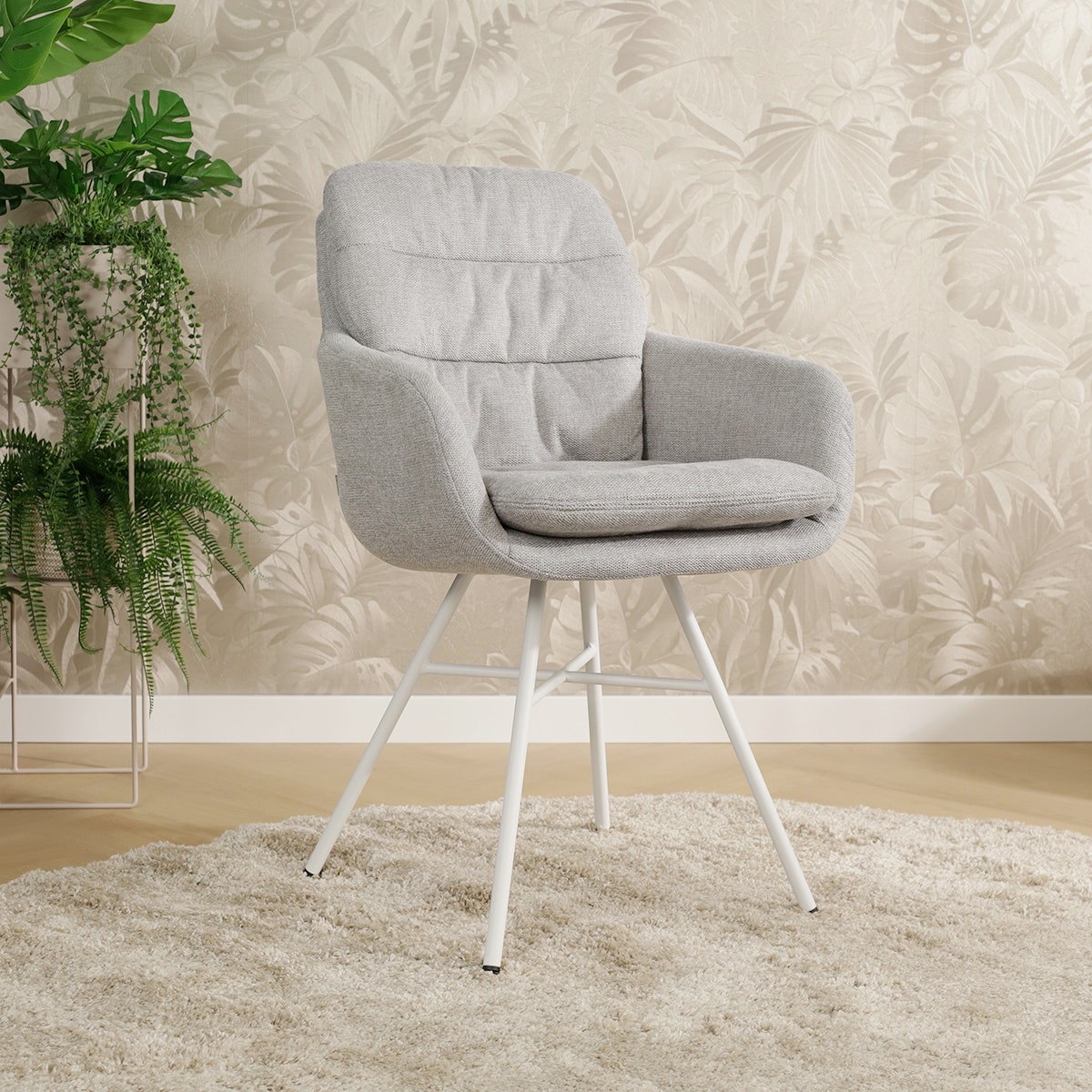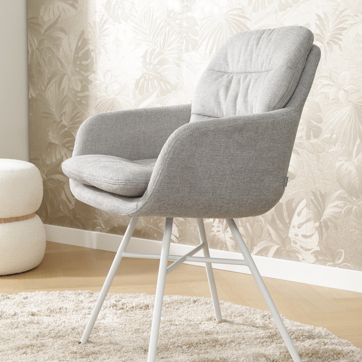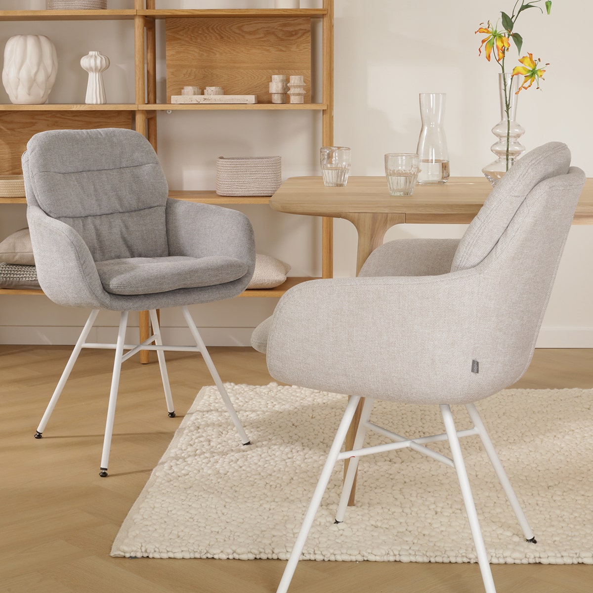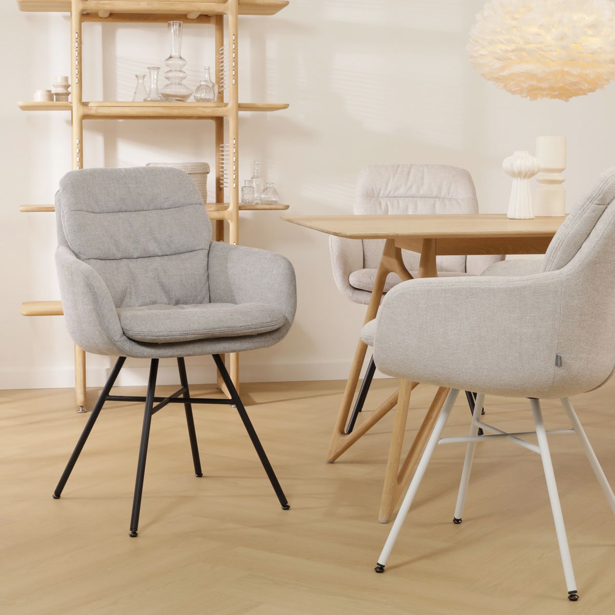 Het metalen onderstel met kruisverbinding heeft een stoere uitstraling en is voorzien van verstelbare voetpootjes, zodat de stoel op elke plek in huis stabiel staat. De gestoffeerde zitting is ontworpen met een hoge rugleuning en armleuningen voor optimaal comfort tijdens gezellig avonden en diners. Het vaste zitkussen draagt hier eveneens aan bij, maar zorgt er wel voor dat de zithoogte iets hoger is dan gemiddeld. Met de luxe stoffen bekleding en de zachte zitting zorgt deze stoel voor een warme sfeer in de eethoek. Of je nu kiest voor de beige of grijze bekleding, de Noa-Mia eetkamerstoel nodigt uit tot gezellig tafelen en uitgebreid dineren.