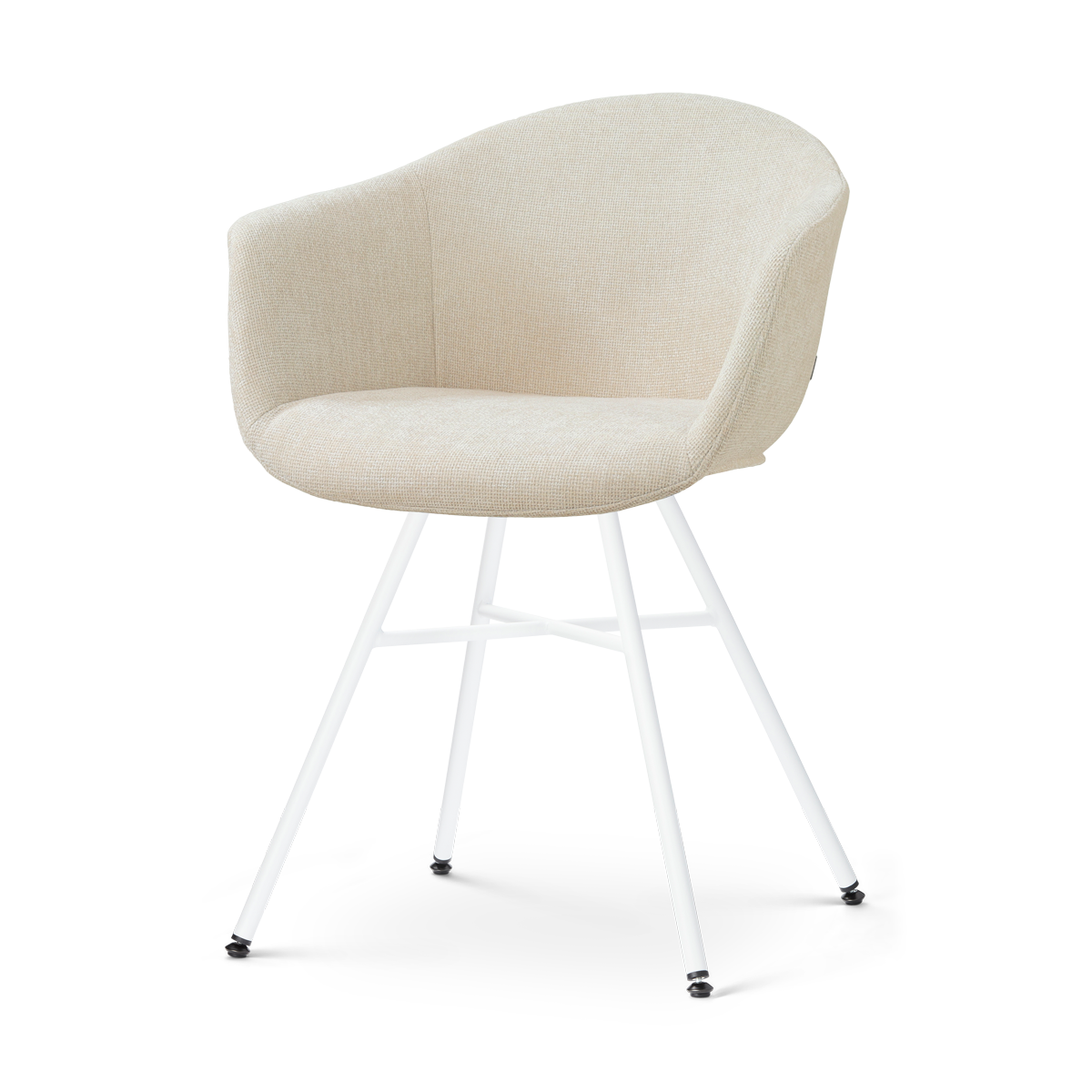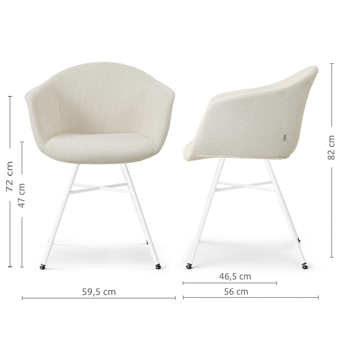 De warme beige stoffering van de Noa-Otis vormt samen met het witte metalen onderstel een elegante en tijdloze combinatie. Het kruisframe geeft de stoel stabiliteit en een moderne uitstraling, terwijl de oplopende armleuningen en zachte bekleding zorgen voor optimaal zitcomfort bij lange diners