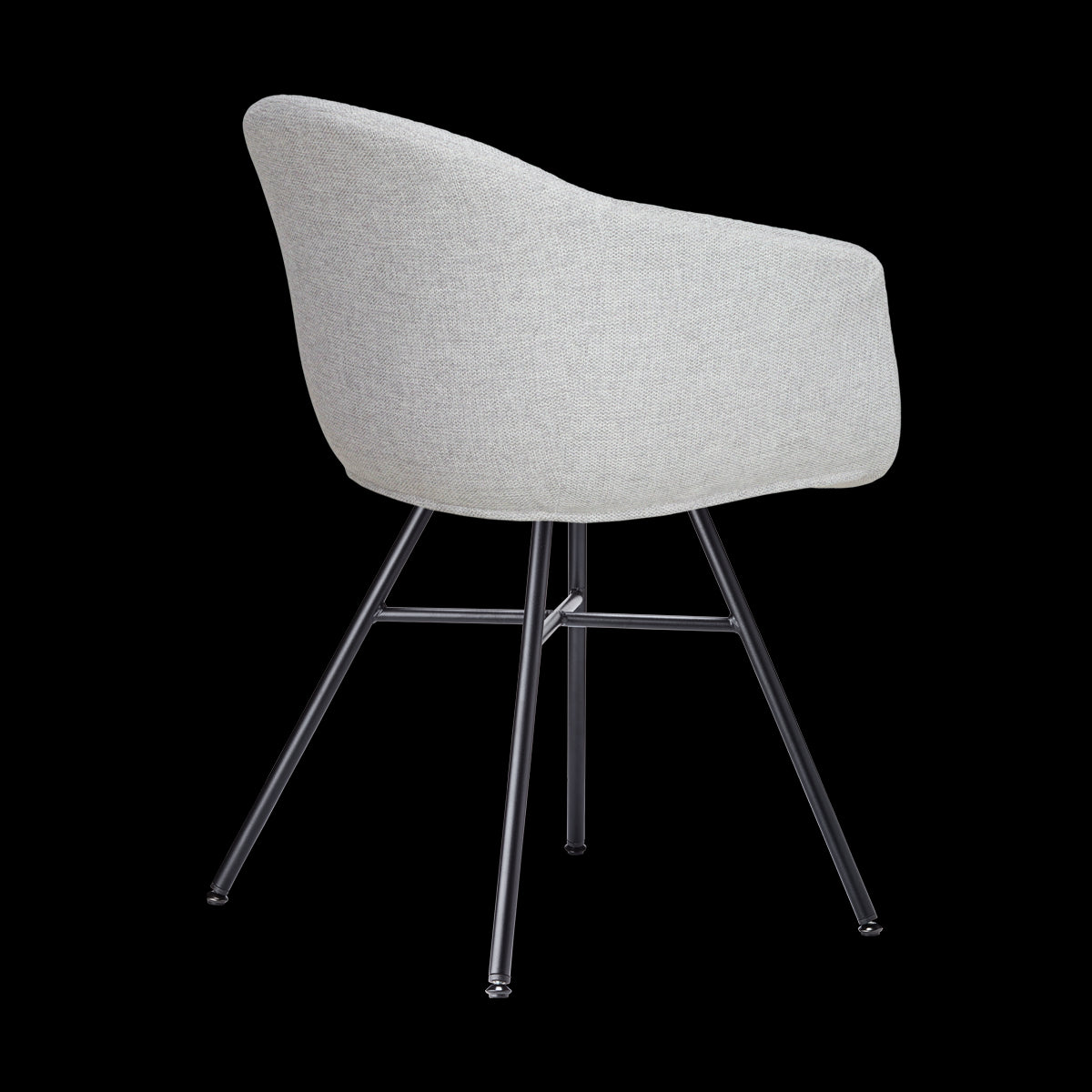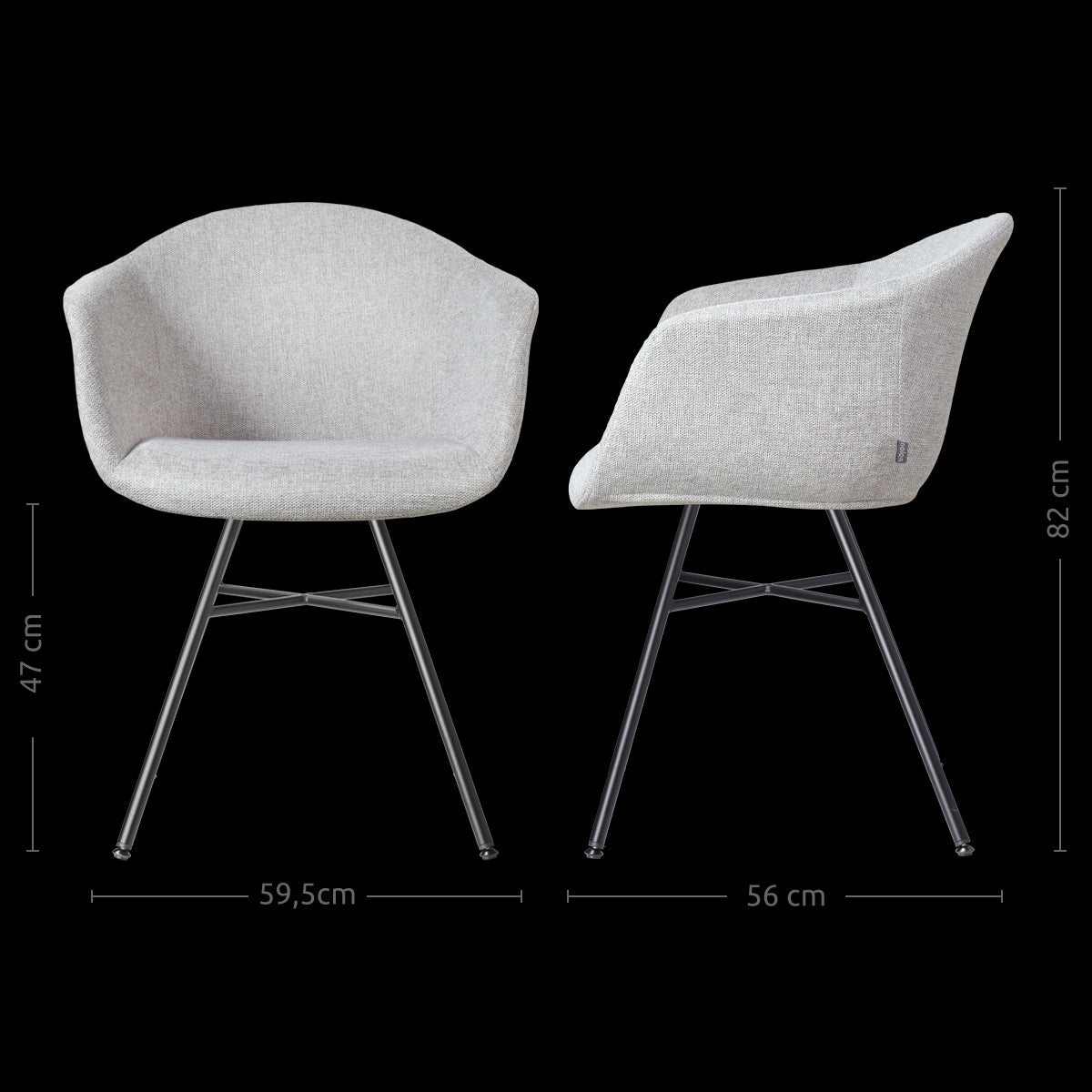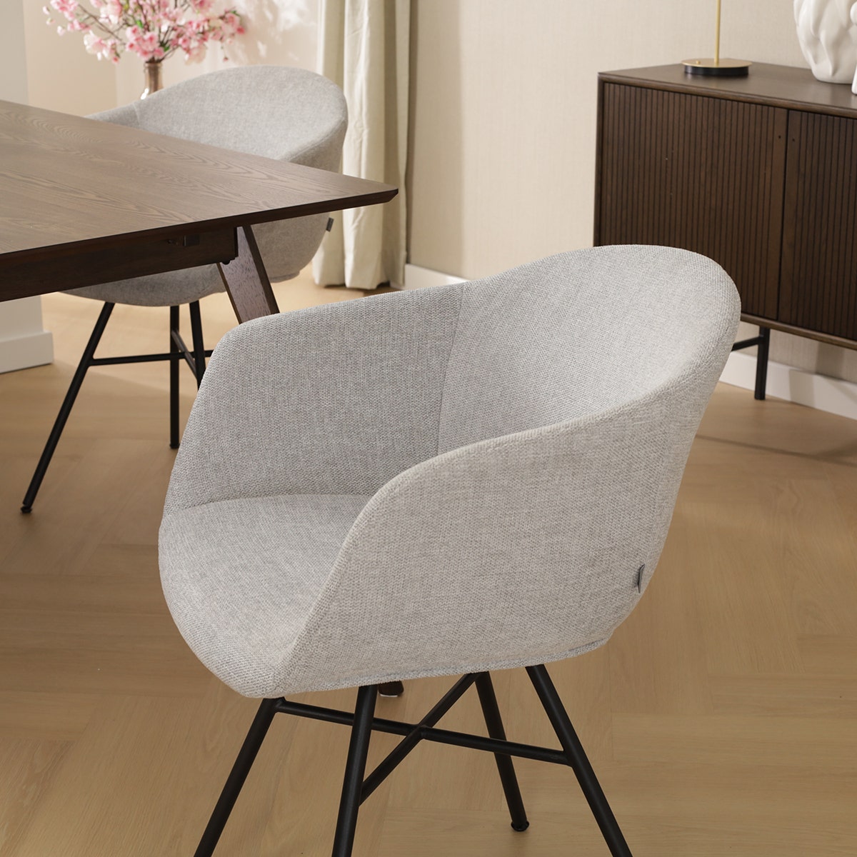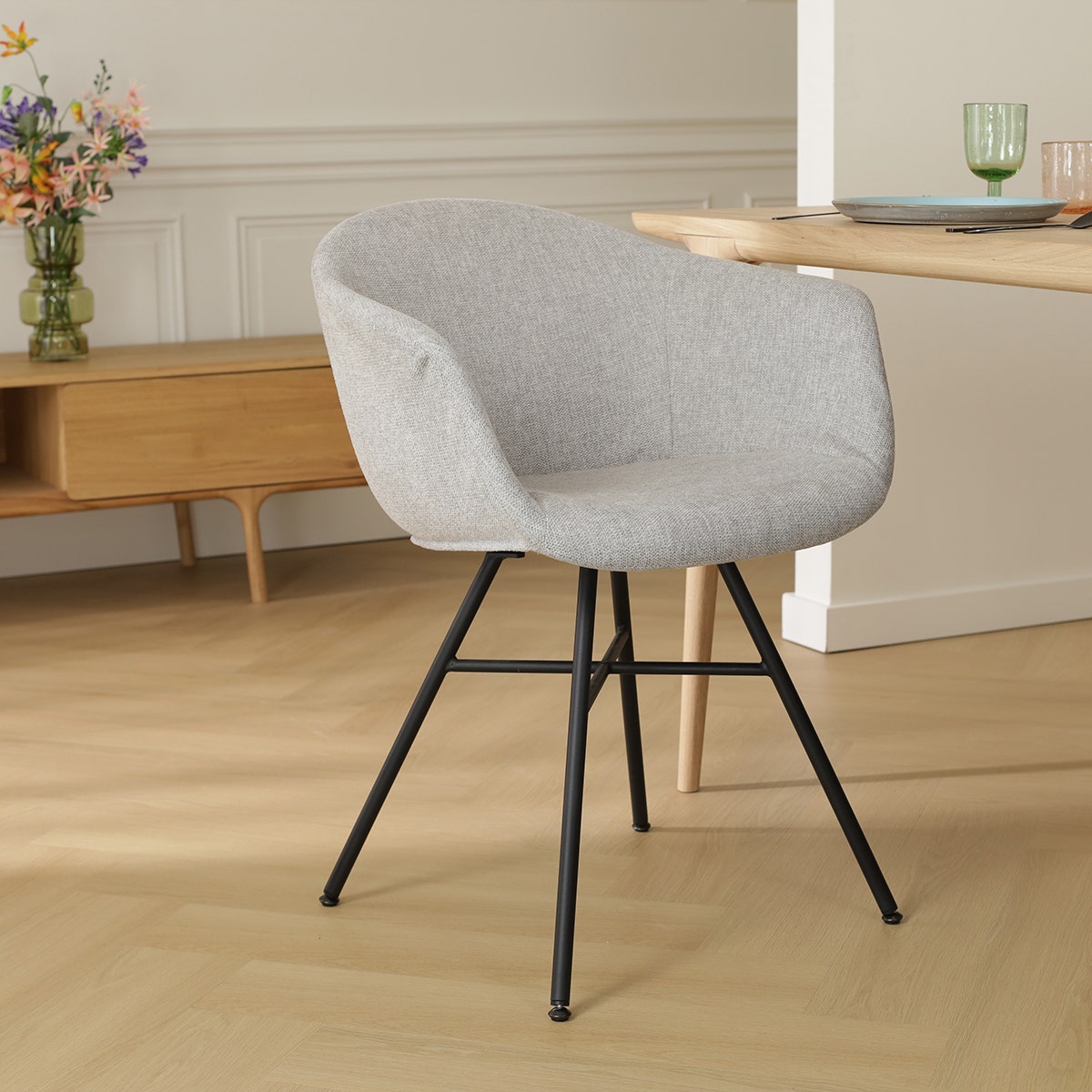 Deze eetkamerstoel heeft een moderne uitstraling dankzij de strakke lijnen van het onderstel en de contrasterende ronde vormen van de ergonomische kuipzitting. Het metalen frame met kruisverbinding is voorzien van verstelbare voetpootjes, zodat de stoel op ieder oppervlak stabiel staat. De zitting is ontworpen met schuin oplopende armleuningen om extra ondersteuning te bieden en is bekleed met hoogwaardige stof. Deze bekleding is verkrijgbaar in zes verschillende kleuren, zodat de Noa-Otis eetkamerstoel met elke woonstijl en ieder interieur te combineren is. Maak een keuze uit de beschikbare opties en voeg een vleugje moderne stijl toe aan je eethoek.