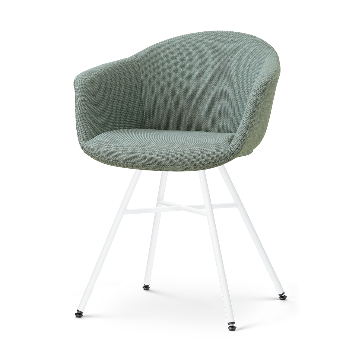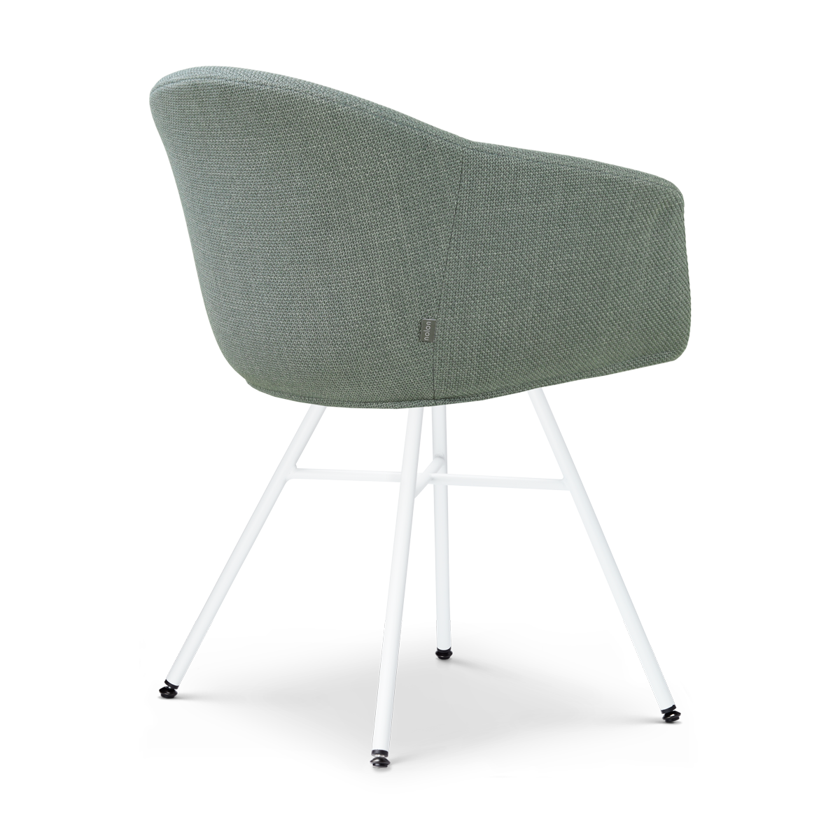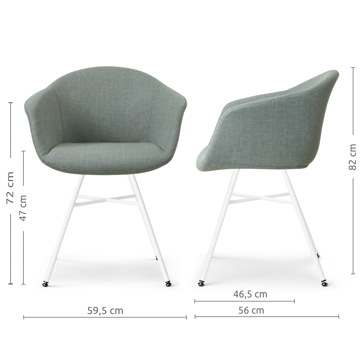De Noa-Otis combineert een zachte saliegroene stoffering met oplopende armleuningen en een strak wit metalen onderstel met kruisverbinding. Het frisse saliegroen geeft een natuurlijke touch aan je eethoek, terwijl het minimalistische witte frame zorgt voor een lichte en moderne uitstraling. Dankzij de comfortabele zitting en de stabiele metalen poten zit je urenlang ontspannen, zelfs op ongelijke vloeren dankzij de verstelbare voetpootjes.