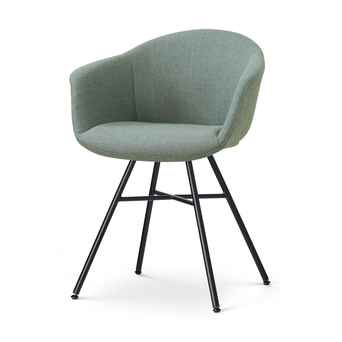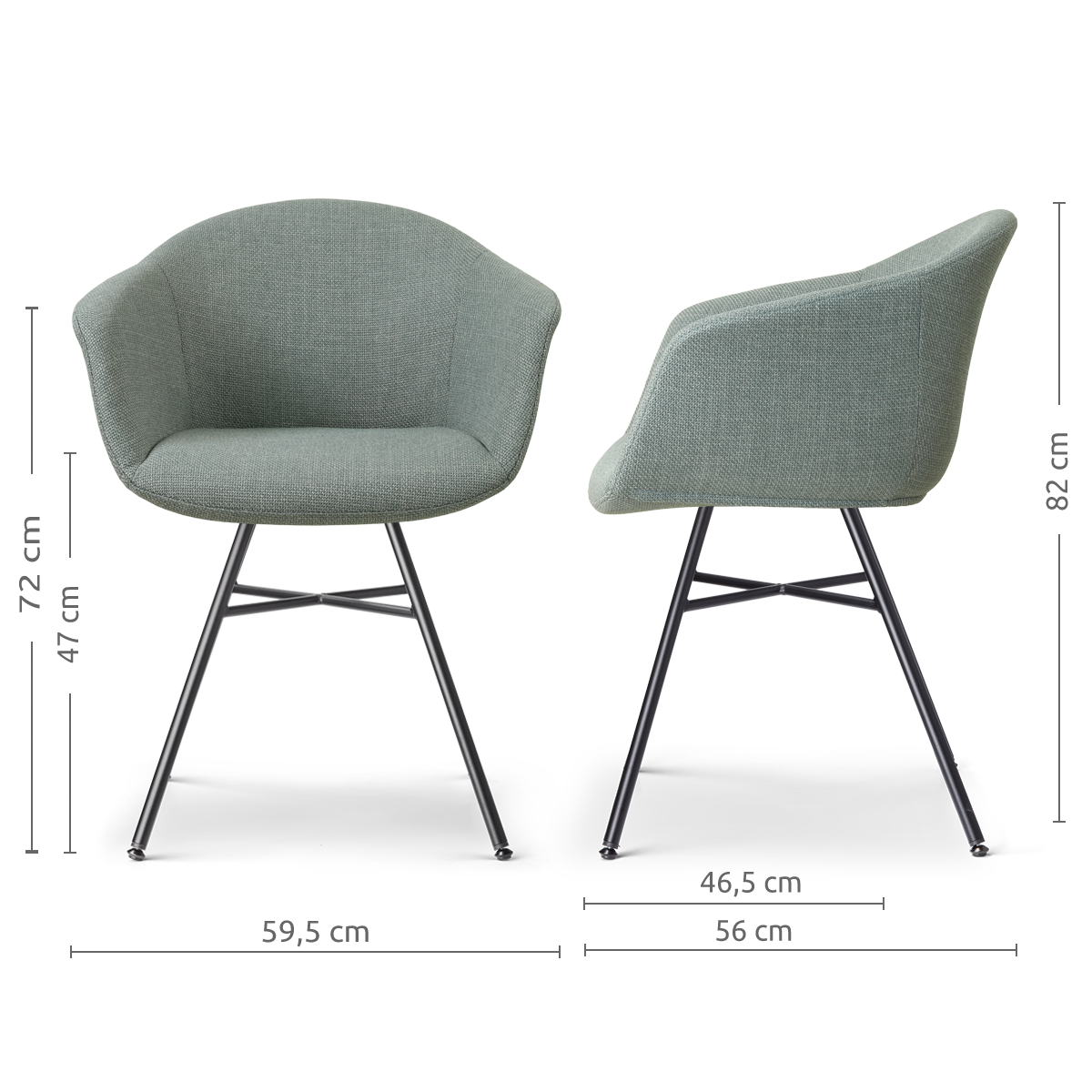 De Noa-Otis combineert een frisse saliegroene stoffering met oplopende armleuningen en een strak zwart metalen onderstel met kruisverbinding. Het saliegroen vormt een krachtig contrast met het zwarte frame, wat zorgt voor een moderne en stoere uitstraling. Dankzij de comfortabele zitting en stabiele poten zit je urenlang ontspannen, zelfs op ongelijke vloeren dankzij de verstelbare voetpootjes.