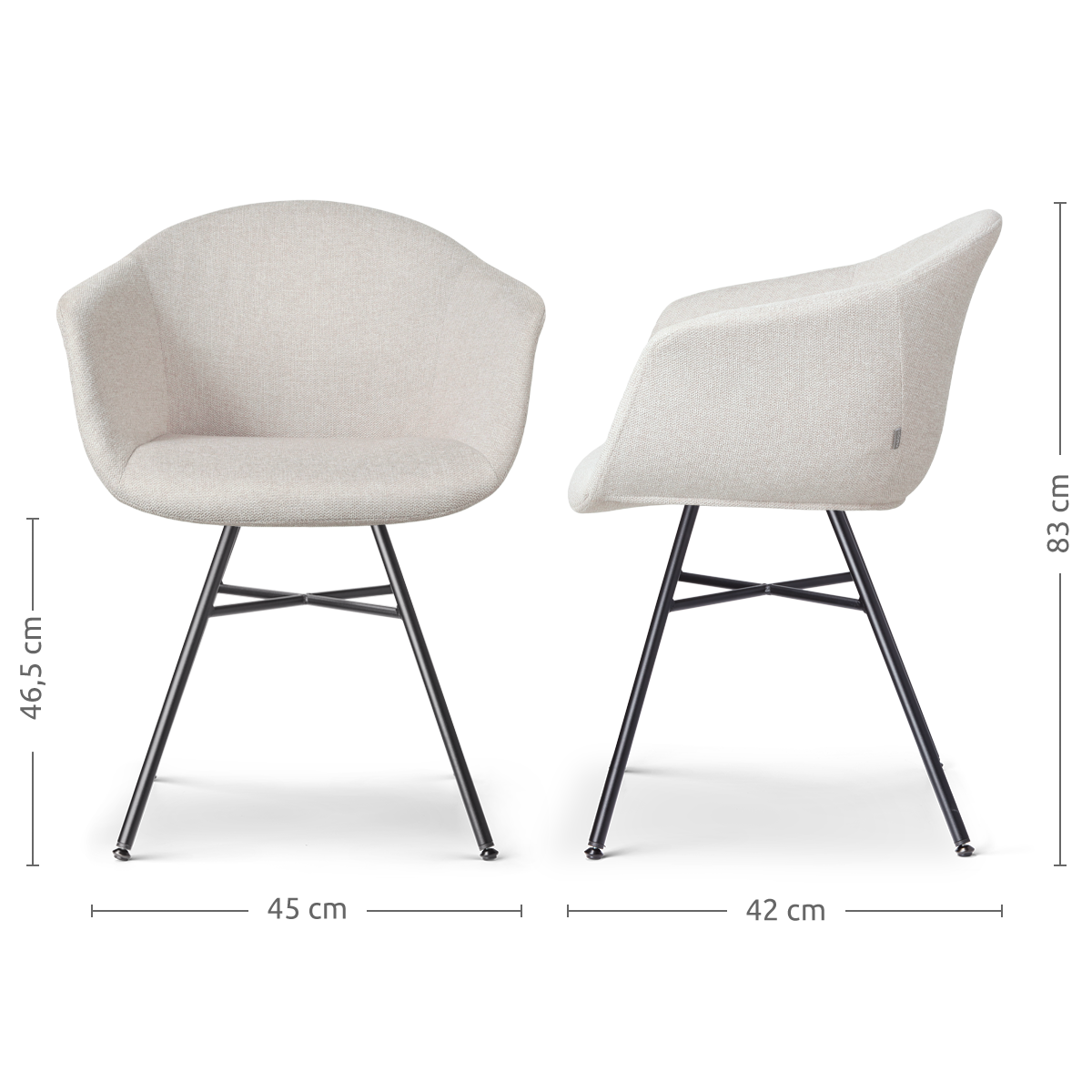 Deze eetkamerstoel heeft een moderne uitstraling dankzij de strakke lijnen van het onderstel en de contrasterende ronde vormen van de ergonomische kuipzitting. Het metalen frame met kruisverbinding is voorzien van verstelbare voetpootjes, zodat de stoel op ieder oppervlak stabiel staat. De zitting is ontworpen met schuin oplopende armleuningen om extra ondersteuning te bieden en is bekleed met hoogwaardige stof. Deze bekleding is verkrijgbaar in zes verschillende kleuren, zodat de Noa-Otis eetkamerstoel met elke woonstijl en ieder interieur te combineren is. Maak een keuze uit de beschikbare opties en voeg een vleugje moderne stijl toe aan je eethoek.