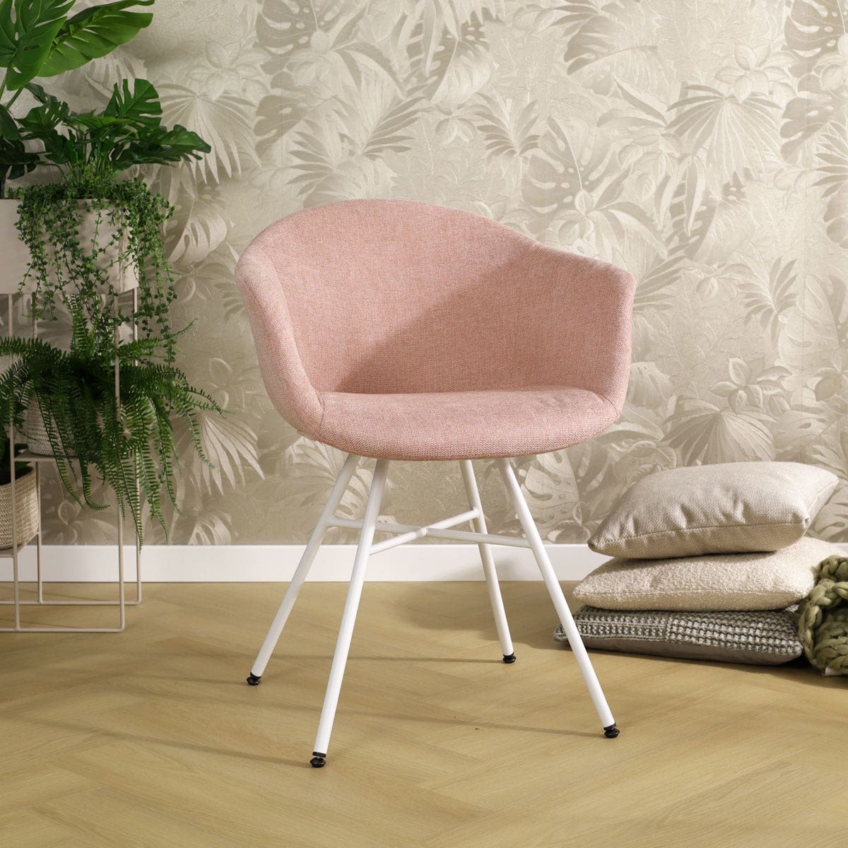 Deze eetkamerstoel heeft een moderne uitstraling dankzij de strakke lijnen van het onderstel en de contrasterende ronde vormen van de ergonomische kuipzitting. Het metalen frame met kruisverbinding is voorzien van verstelbare voetpootjes, zodat de stoel op ieder oppervlak stabiel staat. De zitting is ontworpen met schuin oplopende armleuningen om extra ondersteuning te bieden en is bekleed met hoogwaardige stof. Deze bekleding is verkrijgbaar in zes verschillende kleuren, zodat de Noa-Otis eetkamerstoel met elke woonstijl en ieder interieur te combineren is. Maak een keuze uit de beschikbare opties en voeg een vleugje moderne stijl toe aan je eethoek.