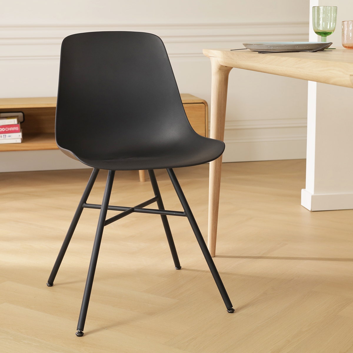 Het strakke design van het metalen onderstel in combinatie met de kunststof zitting maakt van deze stoel een echt modern design. De ronde metalen pootjes in combinatie met het kruis in het midden geeft deze eetkamerstoel net iets extra's. De kunststof zitting is slijtvast en van door en door gekleurd materiaal gemaakt, waardoor de stoel uitermate goed bestand is tegens dagelijks gebruik en onverhoopte krassen en beschadigingen. Dankzij de ergonomisch vorm van de zitting biedt deze voldoende zitcomfort voor een uitgebreid diner of gezellige borrelavond. Zit je toch graag iets zachter of wil je graag wat kleur in de eethoek? Combineer deze kunststof eetkamerstoel met witte of zwart kuip dan met het Fem stoelkussen van Nolon of neem een kijkje bij de Noa-Liv eetkamerstoel. Dit is namelijk hetzelfde ontwerp maar dan met een vast zitkussen.