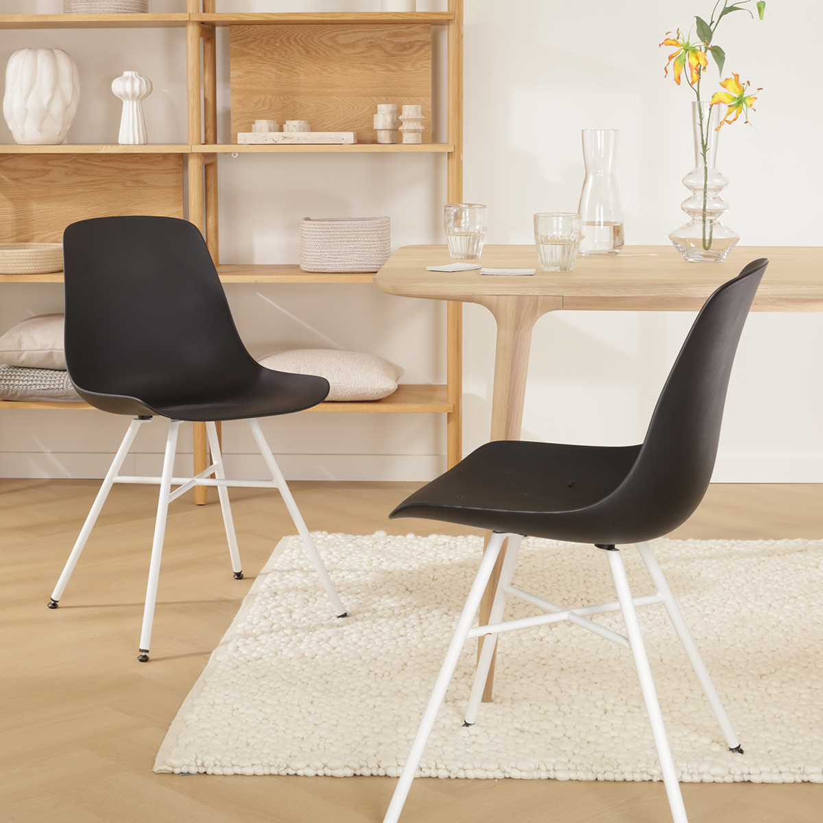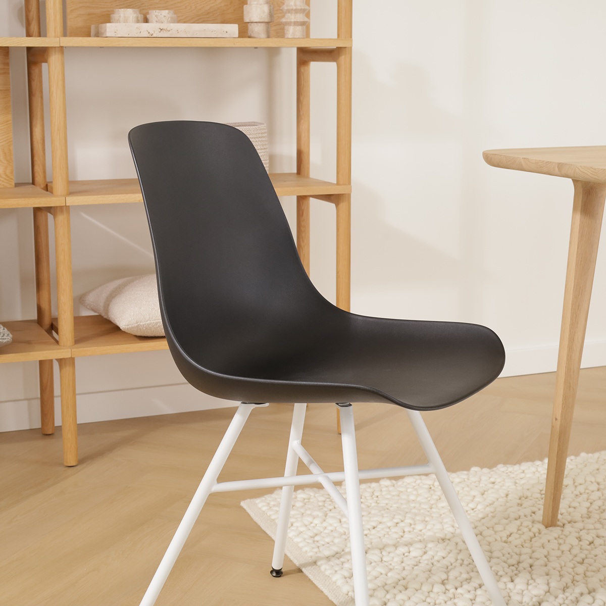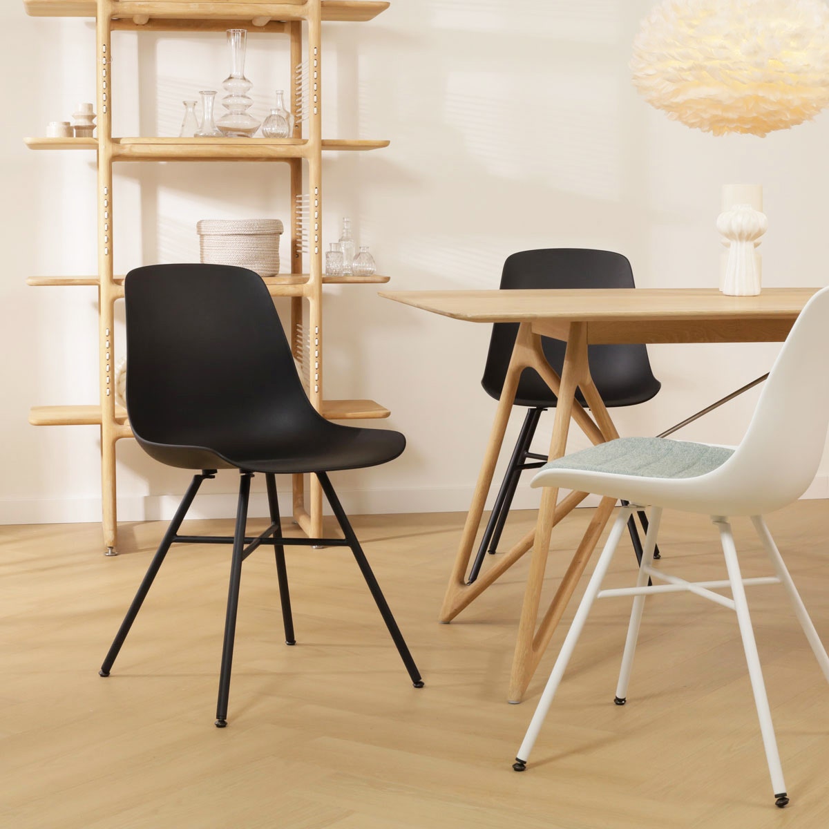 Het strakke design van het metalen onderstel in combinatie met de kunststof zitting maakt van deze stoel een echt modern design. De ronde metalen pootjes in combinatie met het kruis in het midden geeft deze eetkamerstoel net iets extra's. De kunststof zitting is slijtvast en van door en door gekleurd materiaal gemaakt, waardoor de stoel uitermate goed bestand is tegens dagelijks gebruik en onverhoopte krassen en beschadigingen. Dankzij de ergonomisch vorm van de zitting biedt deze voldoende zitcomfort voor een uitgebreid diner of gezellige borrelavond. Zit je toch graag iets zachter of wil je graag wat kleur in de eethoek? Combineer deze kunststof eetkamerstoel met witte of zwart kuip dan met het Fem stoelkussen van Nolon of neem een kijkje bij de Noa-Liv eetkamerstoel. Dit is namelijk hetzelfde ontwerp maar dan met een vast zitkussen.