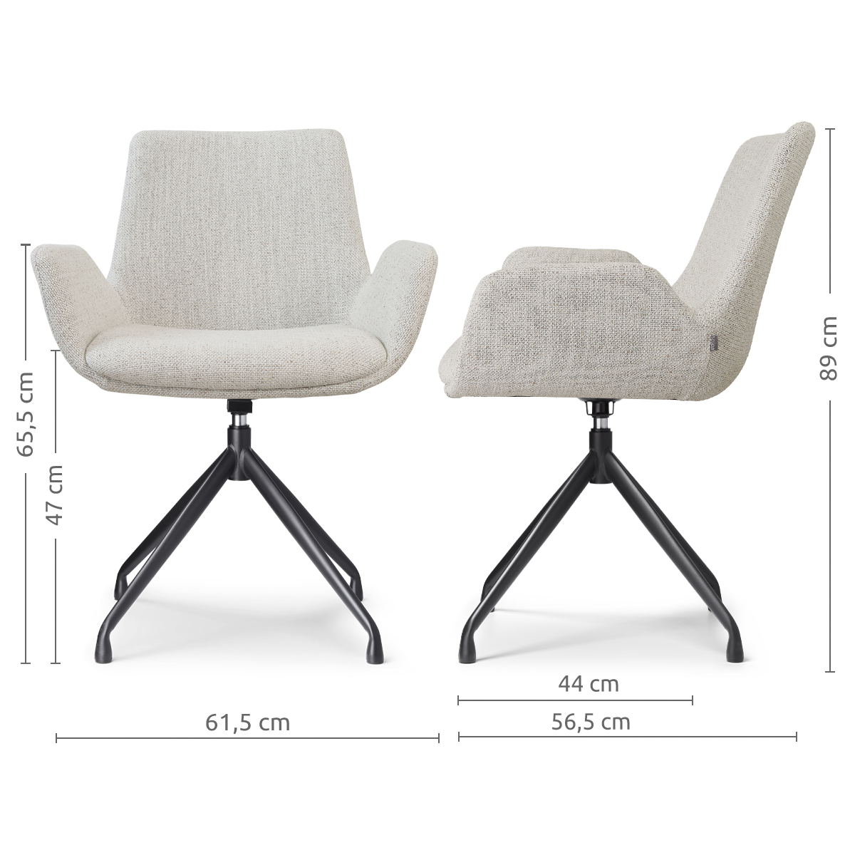 - Deze stoel is voorzien van armleuningen met een hoogte van 65,5 cm. Controleer altijd even of deze wel onder de tafel passen.