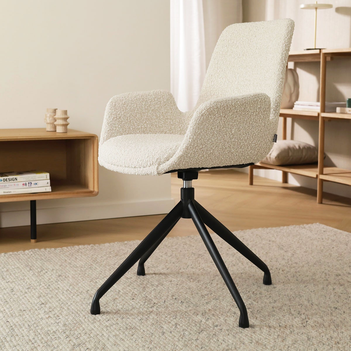 Het stijlvolle ontwerp van deze eetkamerstoel met armleuningen geeft een luxe en chique uitstraling aan elke ruimte. De Nola-Eef eetkamerstoel heeft een draaibaar metalen onderstel, waardoor de zitting 360 garden draaibaar is en je dus flexibel aan tafel zit. De gestoffeerde zitting geeft de eetkamerstoel een warme uitstraling en maakt dat je lekker zacht zit. De kuipzitting is bovendien voorzien van lage armleuningen om nog meer ondersteuning en zitcomfort te bieden, terwijl je de stoel nog steeds gemakkelijk onder de eettafel kan schuiven. Deze draaibare eetkamerstoel is verkrijgbaar met een kuipzitting in luxe stof of in bouclé stof. bouclé is een populair materiaal dat zowel onderhoudsvriendelijk is als de eetkamerstoel een nog warmere uitstraling geeft. Liever een eetkamerstoel zonder armleuningen in deze stof? Dan is de Nola-Isa eetkamerstoel misschien iets voor jou.