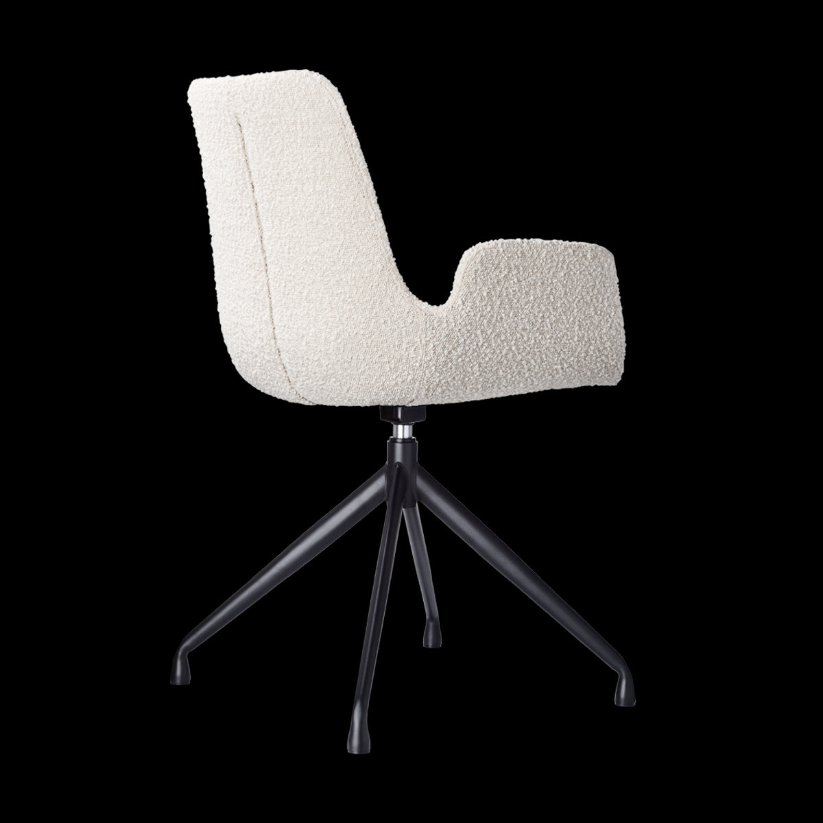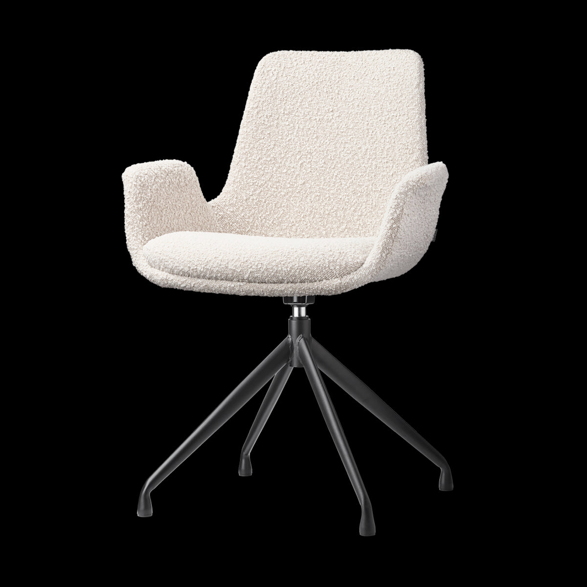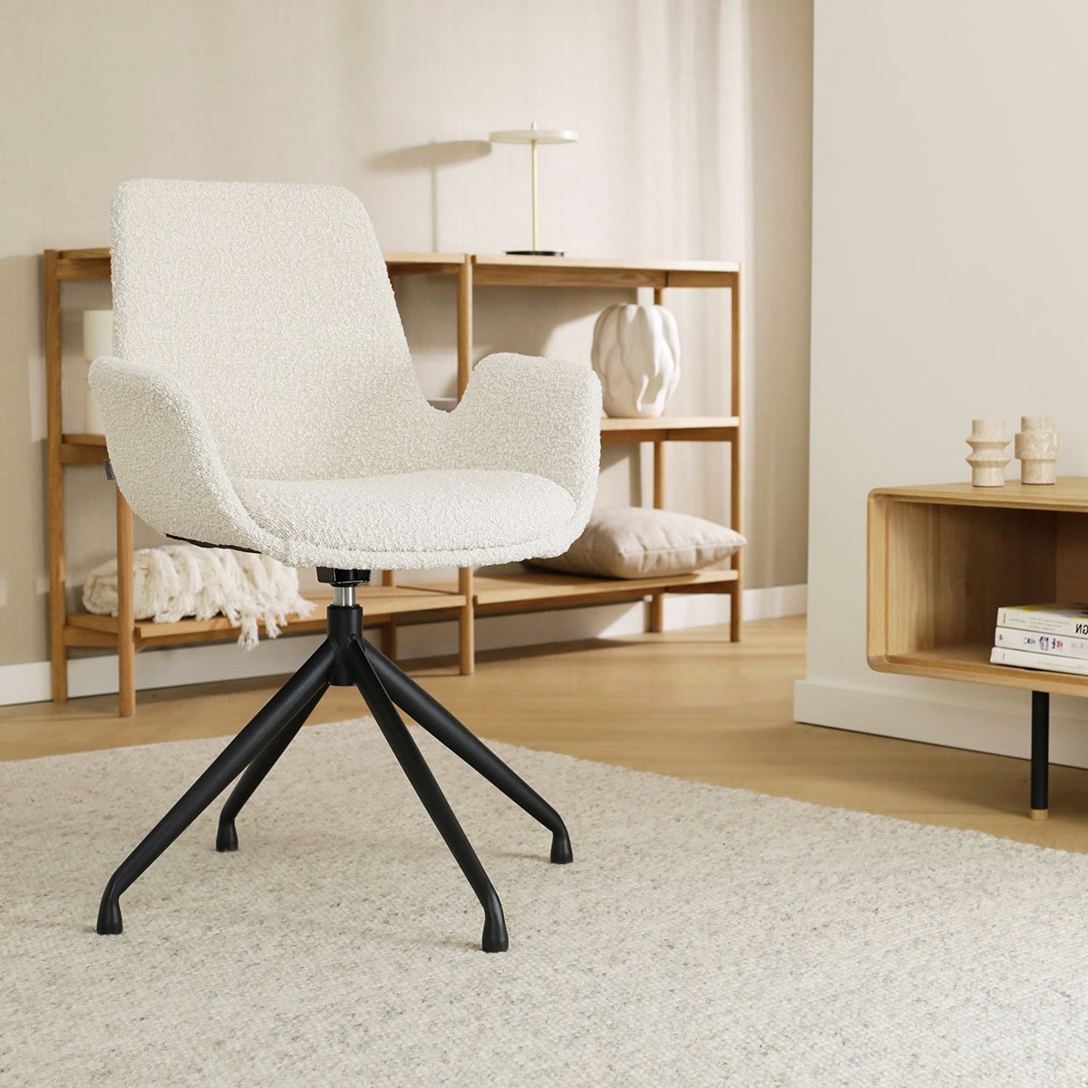 Het stijlvolle ontwerp van deze eetkamerstoel met armleuningen geeft een luxe en chique uitstraling aan elke ruimte. De Nola-Eef eetkamerstoel heeft een draaibaar metalen onderstel, waardoor de zitting 360 garden draaibaar is en je dus flexibel aan tafel zit. De gestoffeerde zitting geeft de eetkamerstoel een warme uitstraling en maakt dat je lekker zacht zit. De kuipzitting is bovendien voorzien van lage armleuningen om nog meer ondersteuning en zitcomfort te bieden, terwijl je de stoel nog steeds gemakkelijk onder de eettafel kan schuiven. Deze draaibare eetkamerstoel is verkrijgbaar met een kuipzitting in luxe stof of in bouclé stof. Bouclé is een populair materiaal dat zowel onderhoudsvriendelijk is als de eetkamerstoel een nog warmere uitstraling geeft. Liever een eetkamerstoel zonder armleuningen in deze stof? Dan is de Nola-Isa eetkamerstoel misschien iets voor jou.