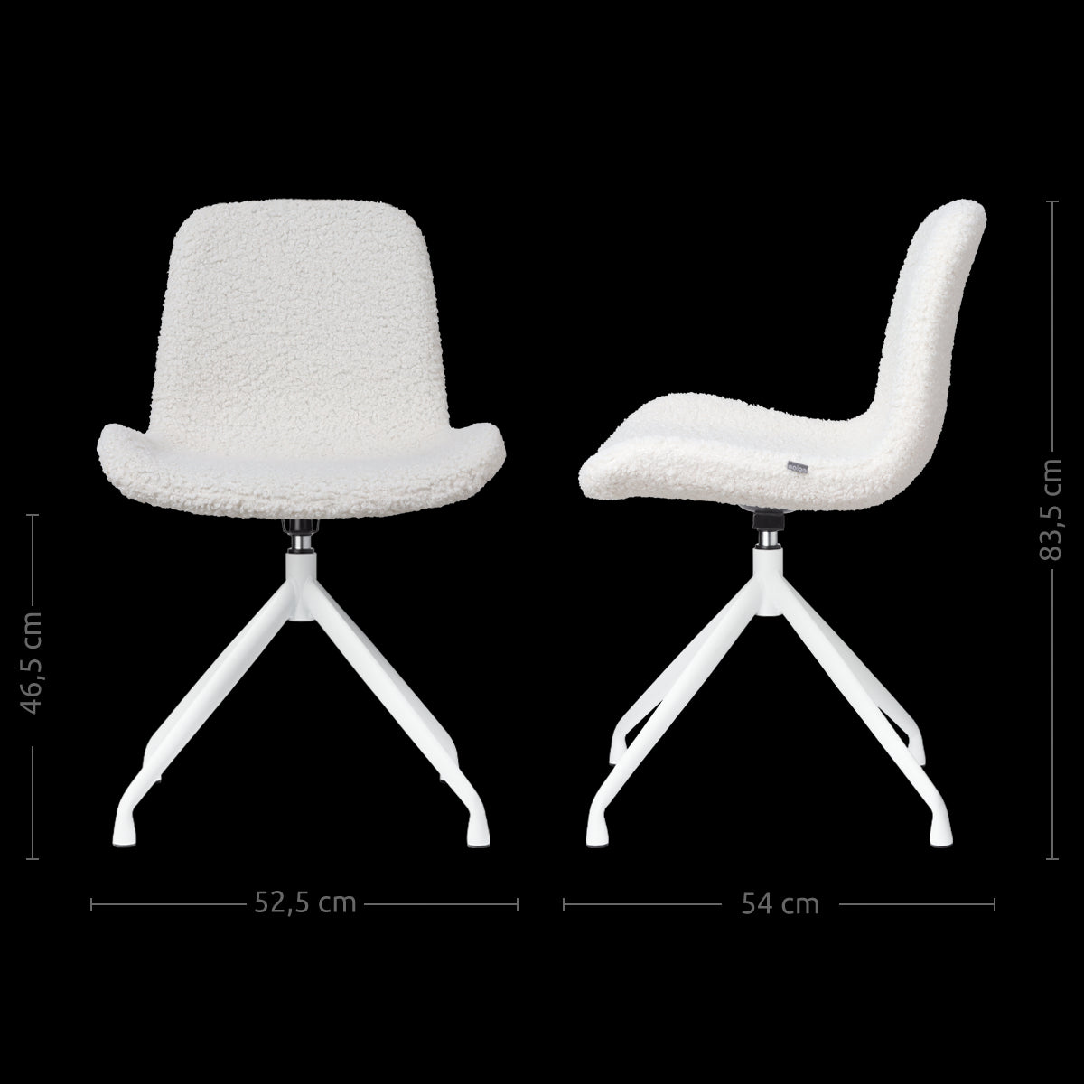 Deze eetkamerstoel heeft een tijdloos design dat naadloos in elke interieurstijl toe te passen is. De eetkamerstoel heeft een praktisch metalen onderstel met draaifunctie. Hierdoor zit je flexibel aan de eettafel en kan je gemakkelijk in en uit stappen. De zitting is volledig bekleed met stof en is ontworpen met een gevleugeld zitvlak. Dit biedt een zacht en comfortabel oppervlak om op te zitten. Dankzij de afwezigheid van armleuningen neemt de Nola-Fé eetkamerstoel minder ruimte in rond de tafel en past hij bovendien onder iedere eettafel. Kies uit een assortiment van prachtige kleuren en verschillende materialen voor de stoffen bekleding, waaronder teddystof en ribstof.