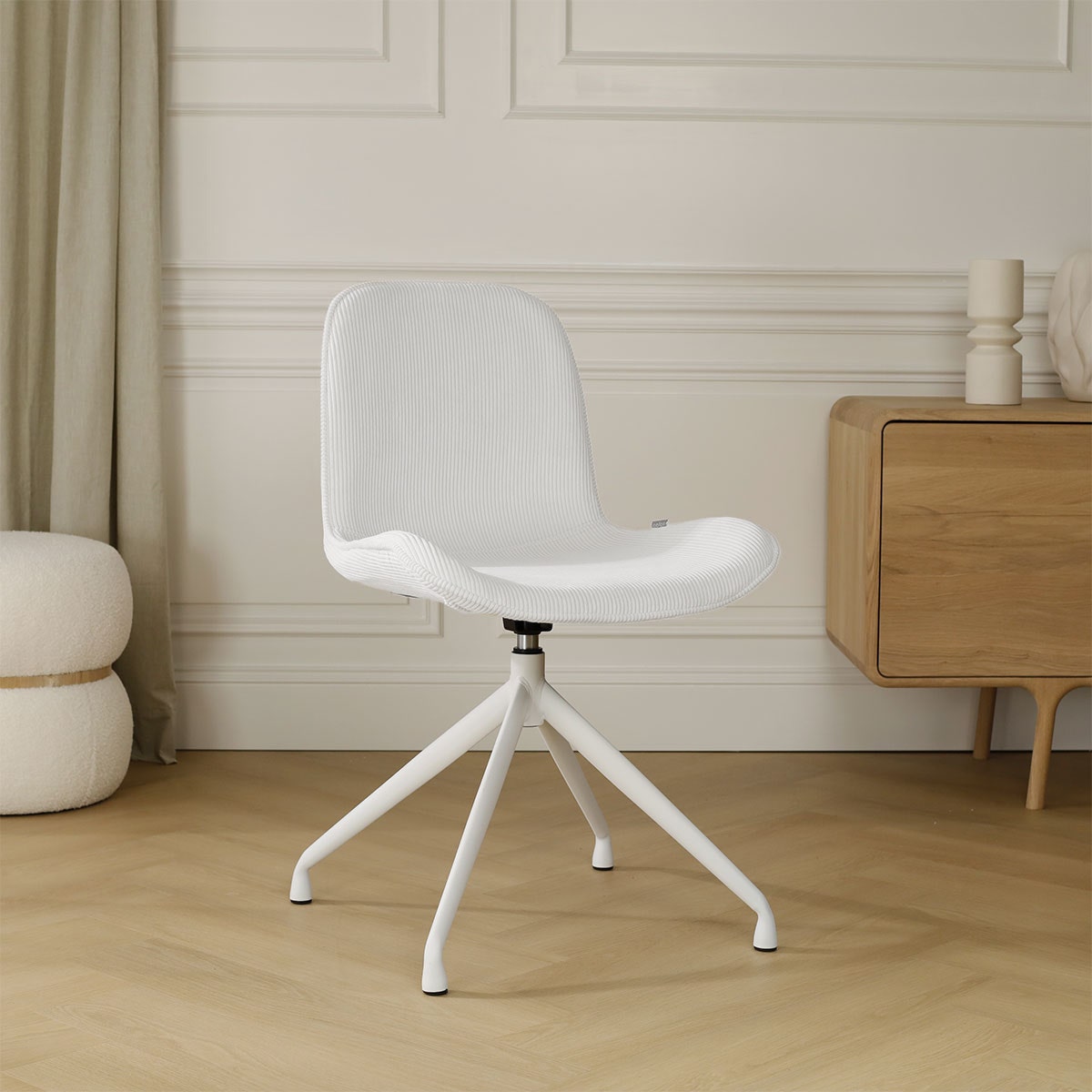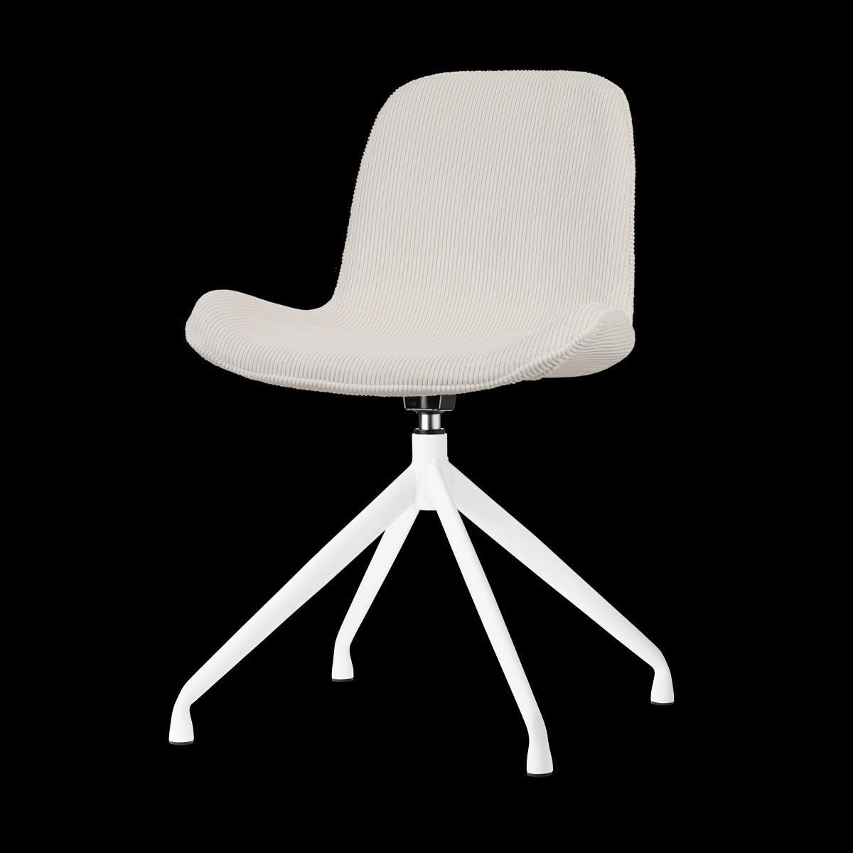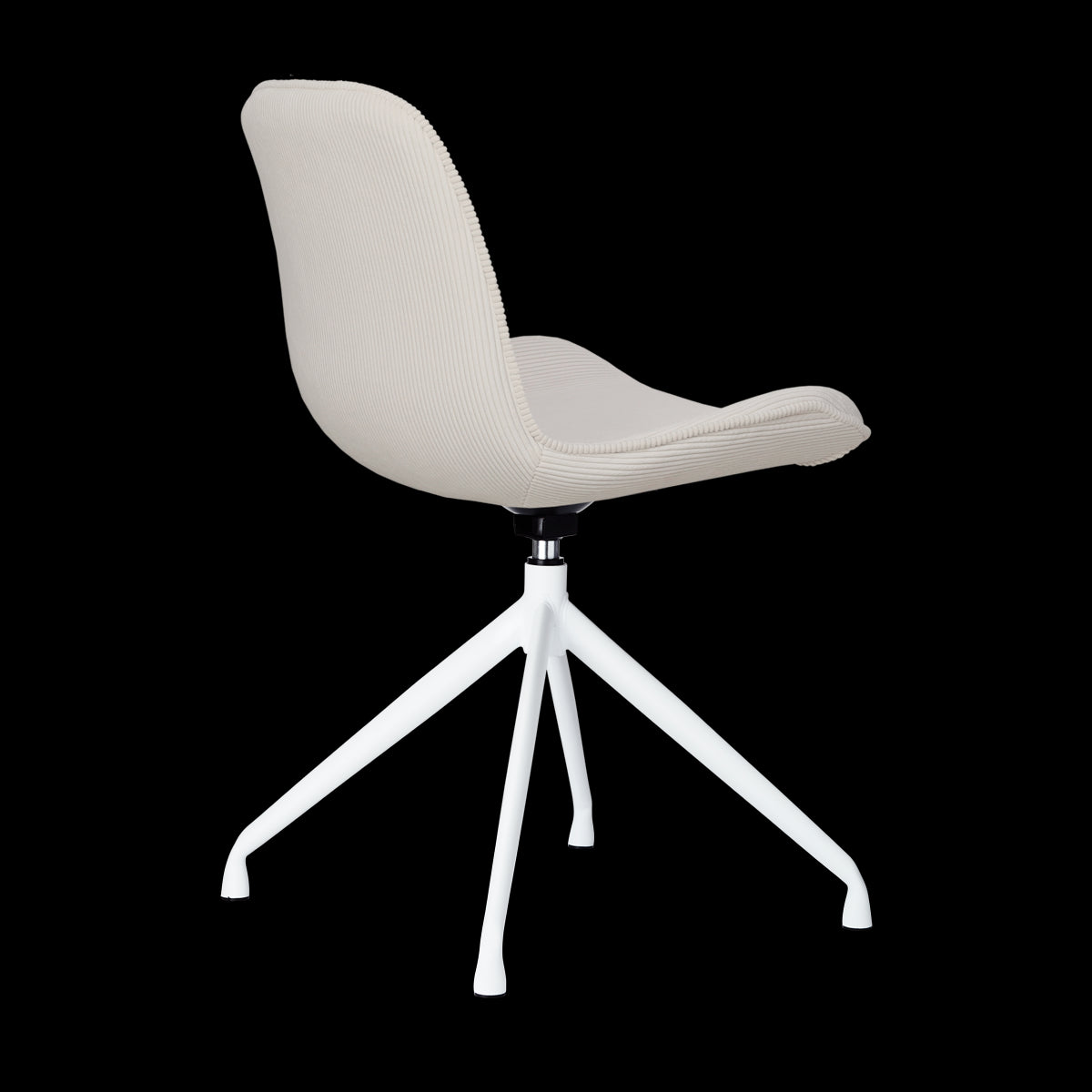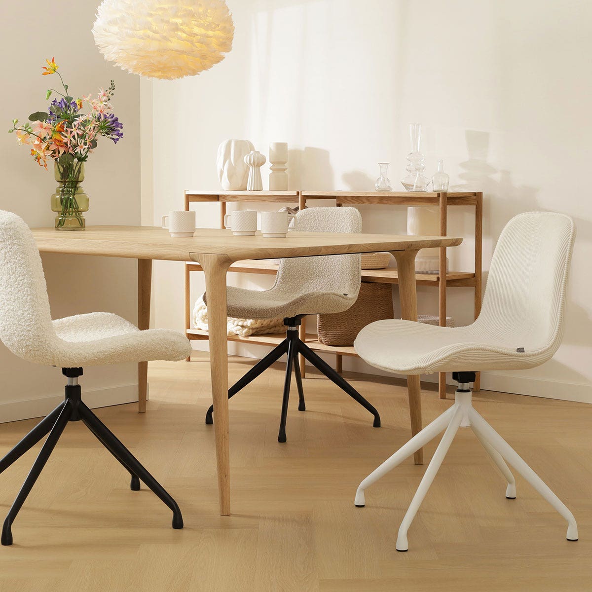 Deze eetkamerstoel heeft een tijdloos design dat naadloos in elke interieurstijl toe te passen is. De eetkamerstoel heeft een praktisch metalen onderstel met draaifunctie. Hierdoor zit je flexibel aan de eettafel en kan je gemakkelijk in en uit stappen. De zitting is volledig bekleed met stof en is ontworpen met een gevleugeld zitvlak. Dit biedt een zacht en comfortabel oppervlak om op te zitten. Dankzij de afwezigheid van armleuningen neemt deze stoel minder ruimte in rond de tafel en past hij bovendien onder iedere eettafel. Kies uit een assortiment van prachtige kleuren en verschillende materialen voor de stoffen bekleding, waaronder teddystof, ribstof en bouclé.