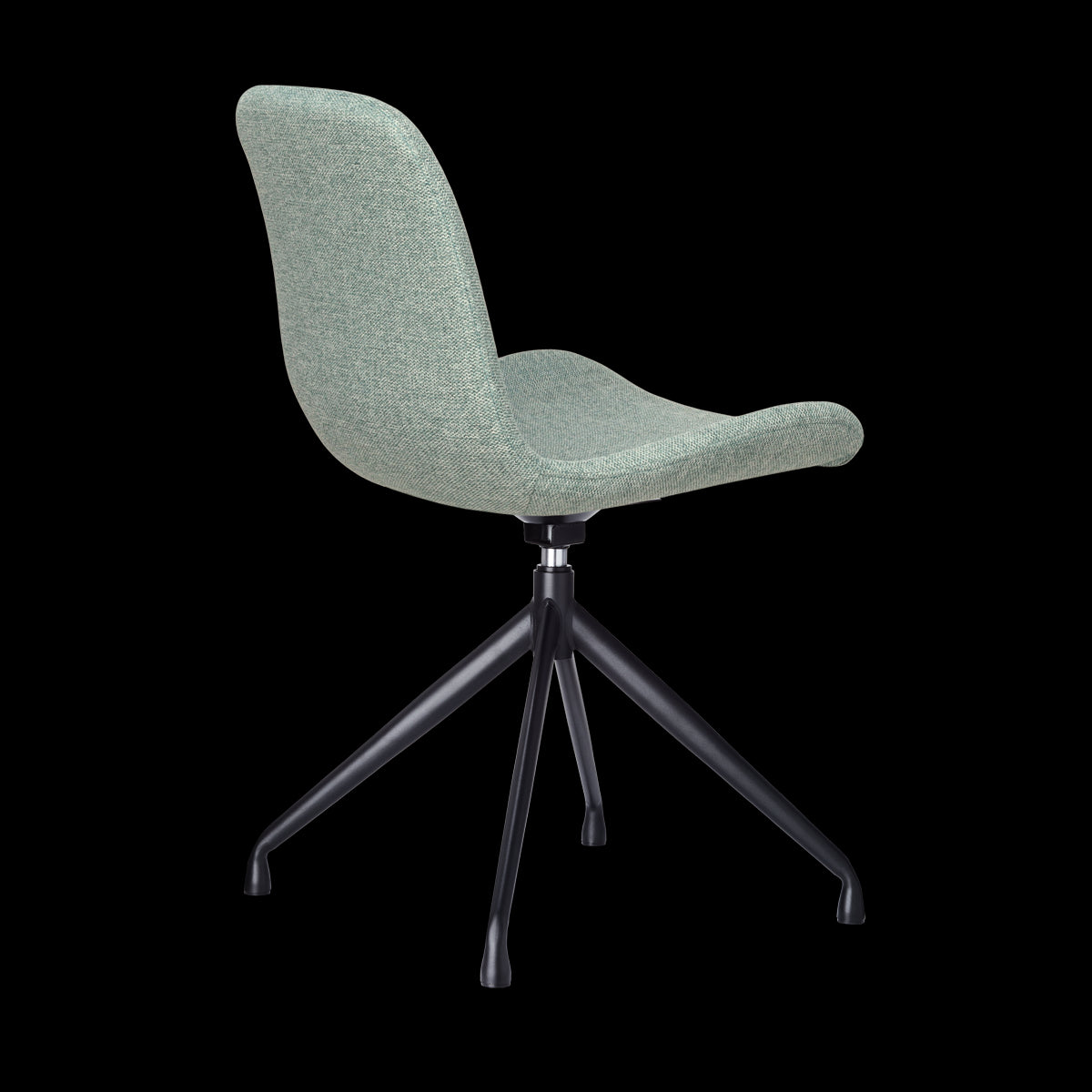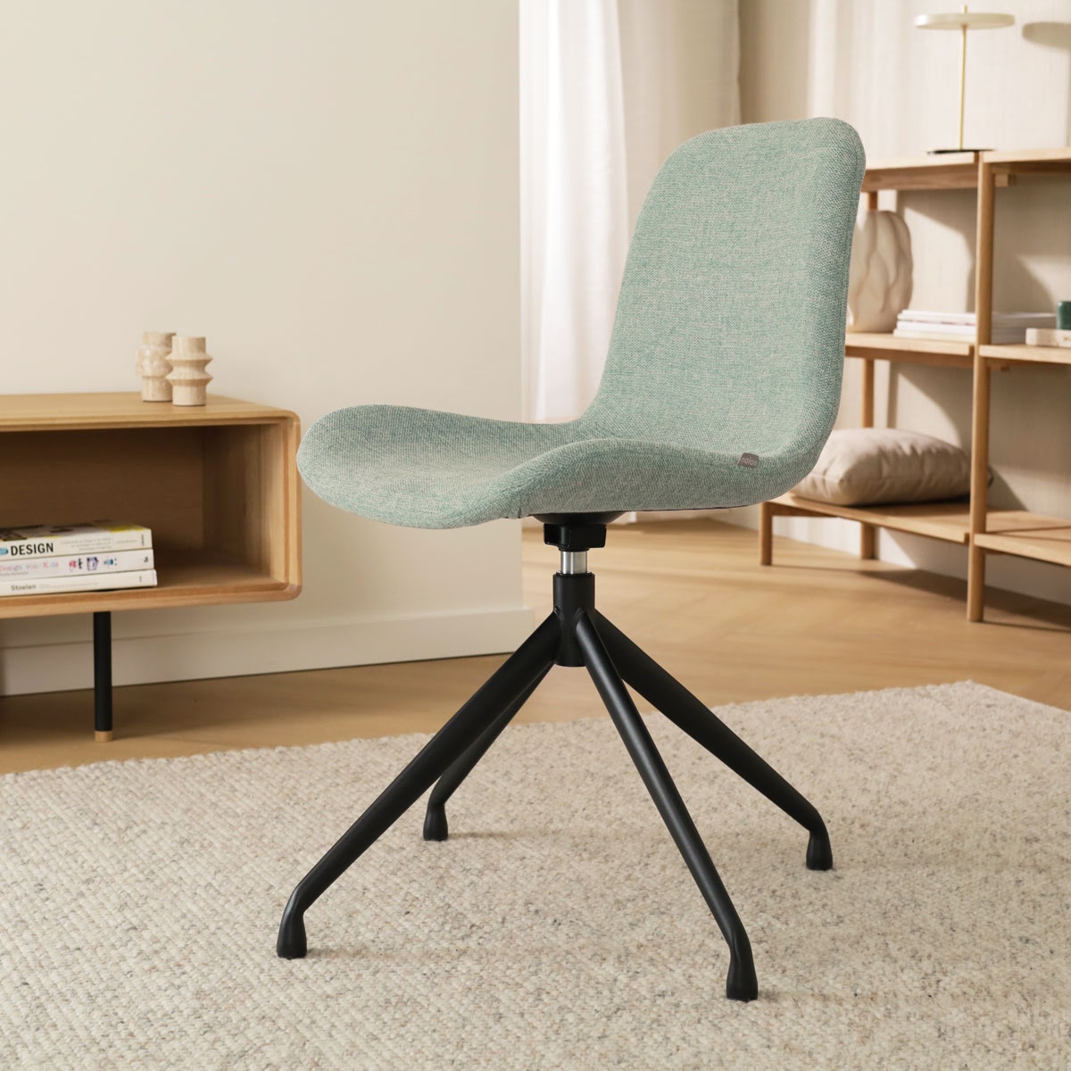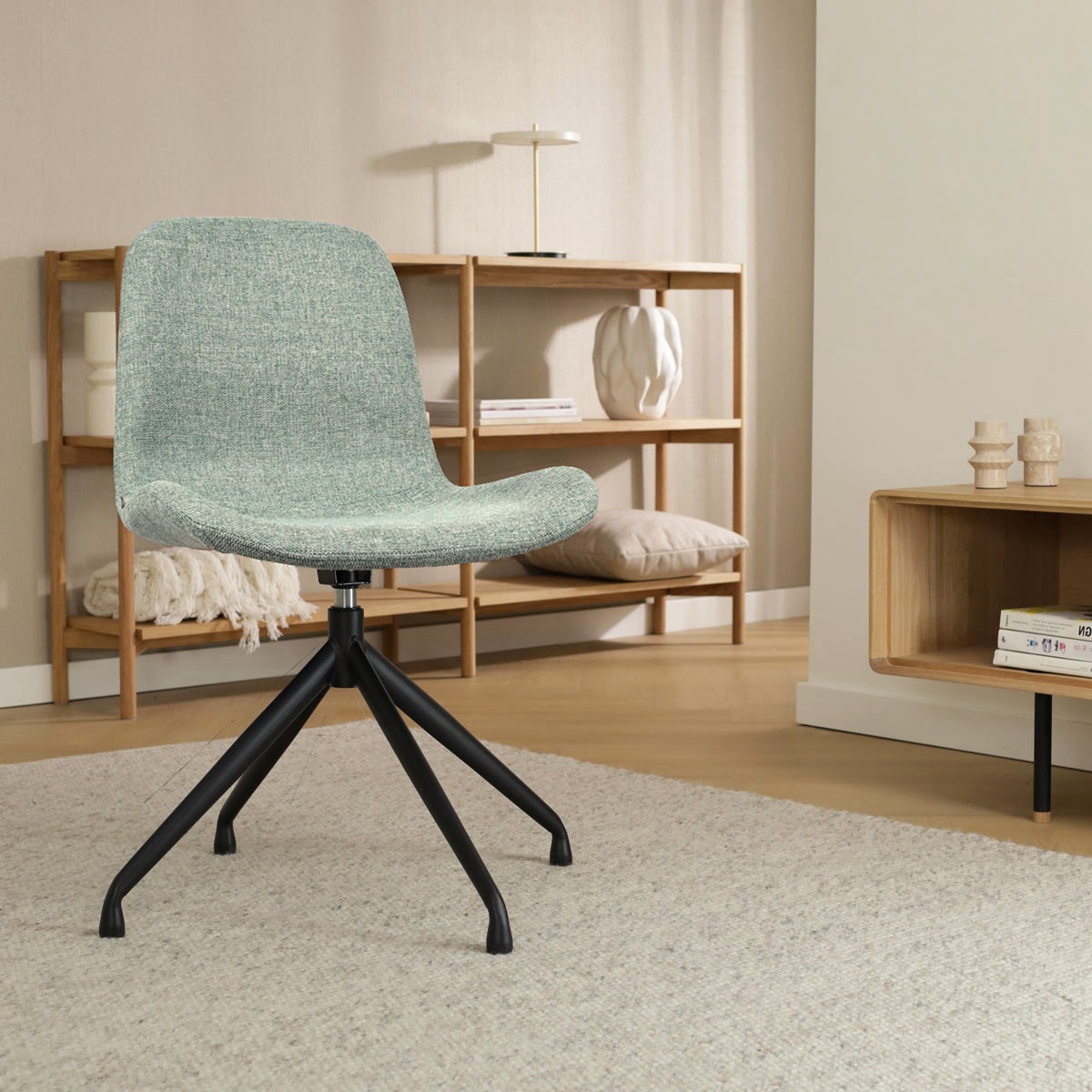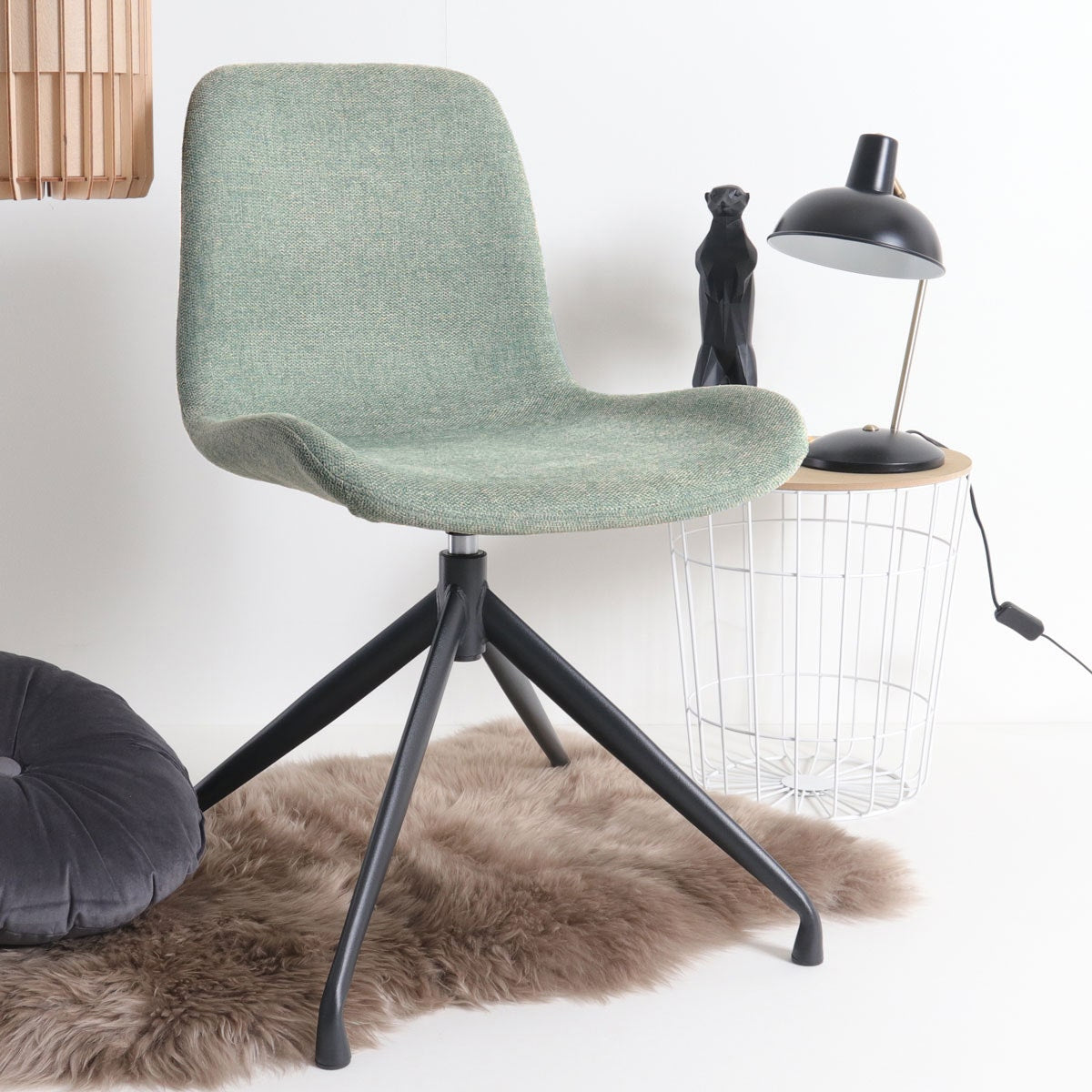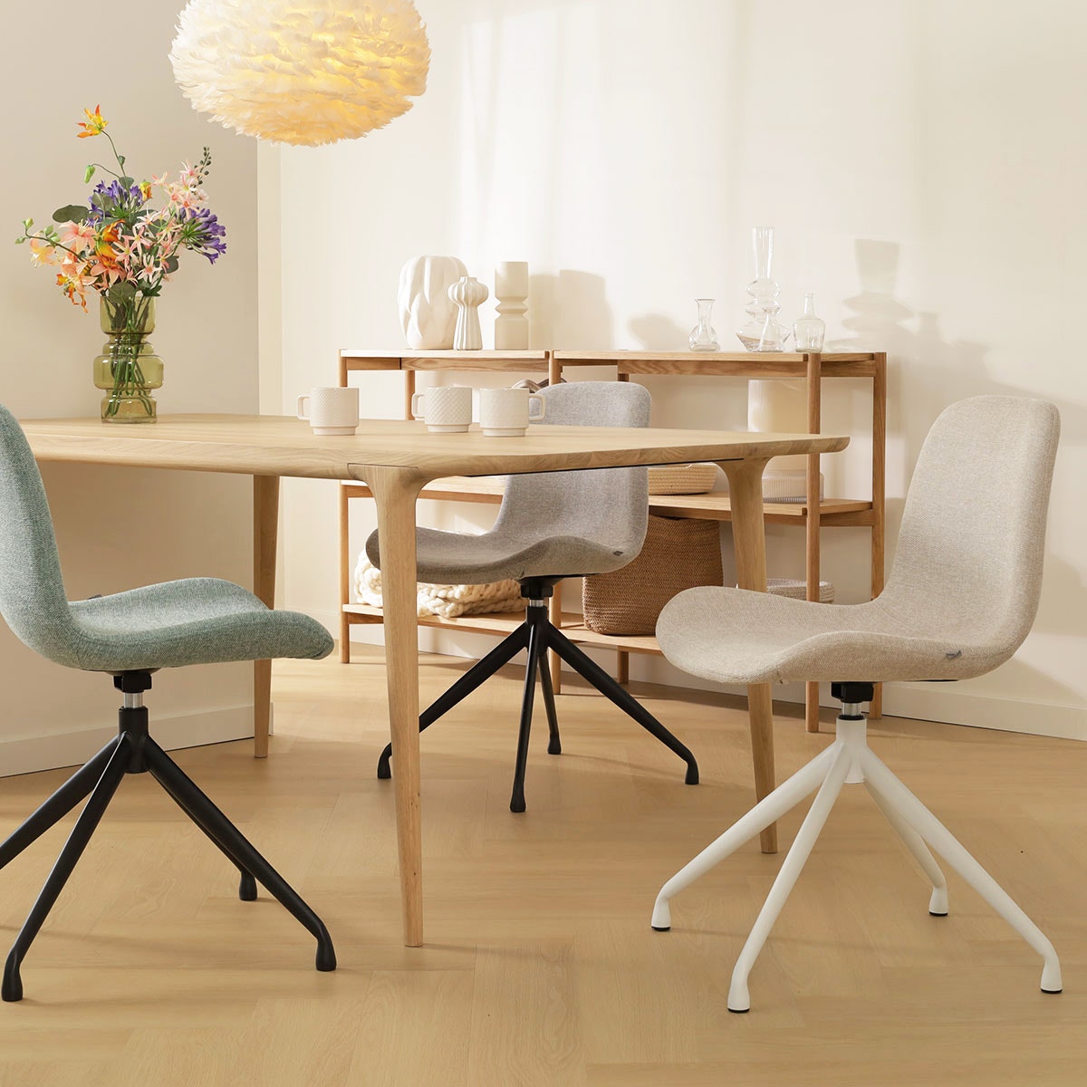Deze eetkamerstoel heeft een tijdloos design dat naadloos in elke interieurstijl toe te passen is. De eetkamerstoel heeft een praktisch metalen onderstel met draaifunctie. Hierdoor zit je flexibel aan de eettafel en kan je gemakkelijk in en uit stappen. De zitting is volledig bekleed met stof en is ontworpen met een gevleugeld zitvlak. Dit biedt een zacht en comfortabel oppervlak om op te zitten. Dankzij de afwezigheid van armleuningen neemt deze stoel minder ruimte in rond de tafel en past hij bovendien onder iedere eettafel. Kies uit een assortiment van prachtige kleuren en verschillende materialen voor de stoffen bekleding, waaronder teddystof, ribstof en bouclé.